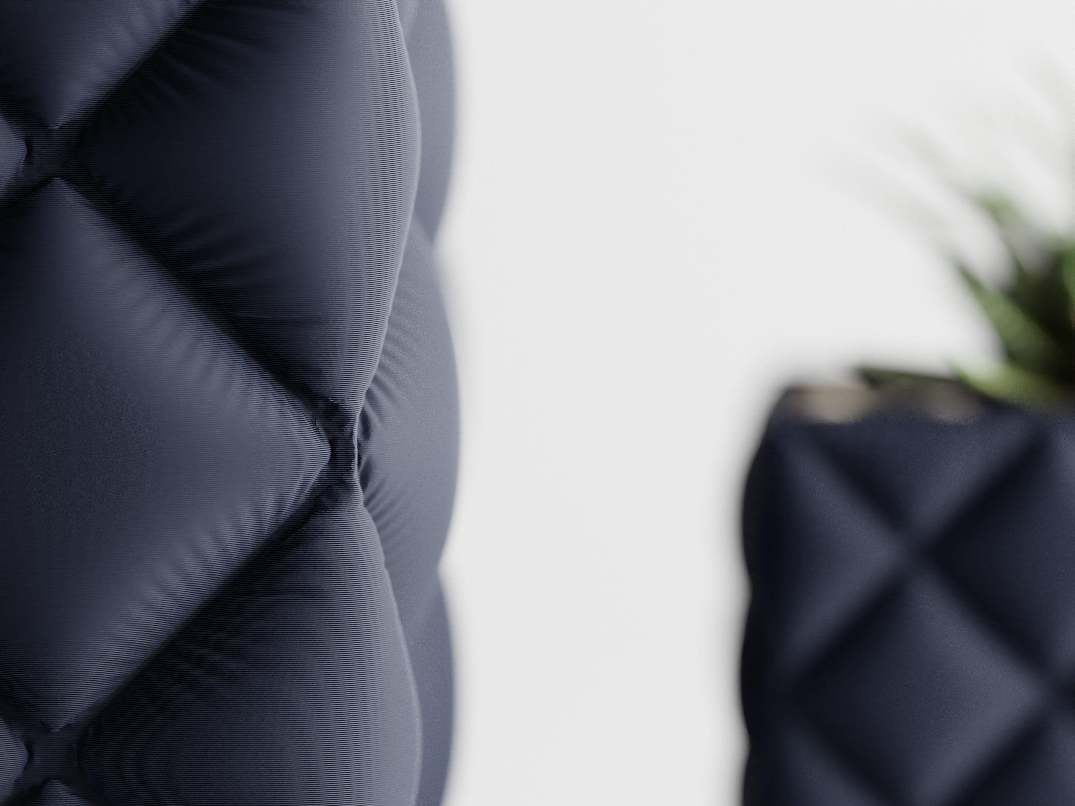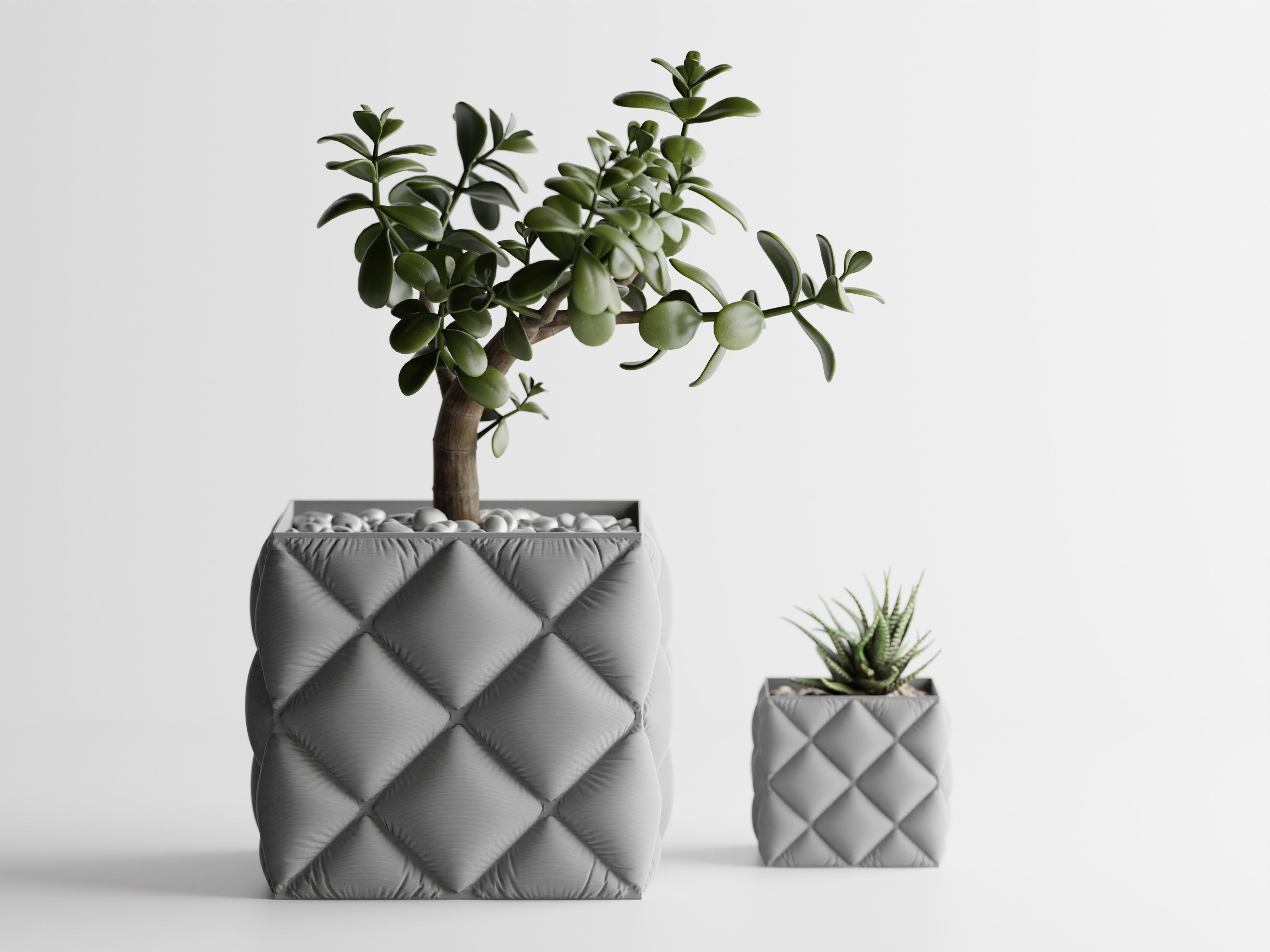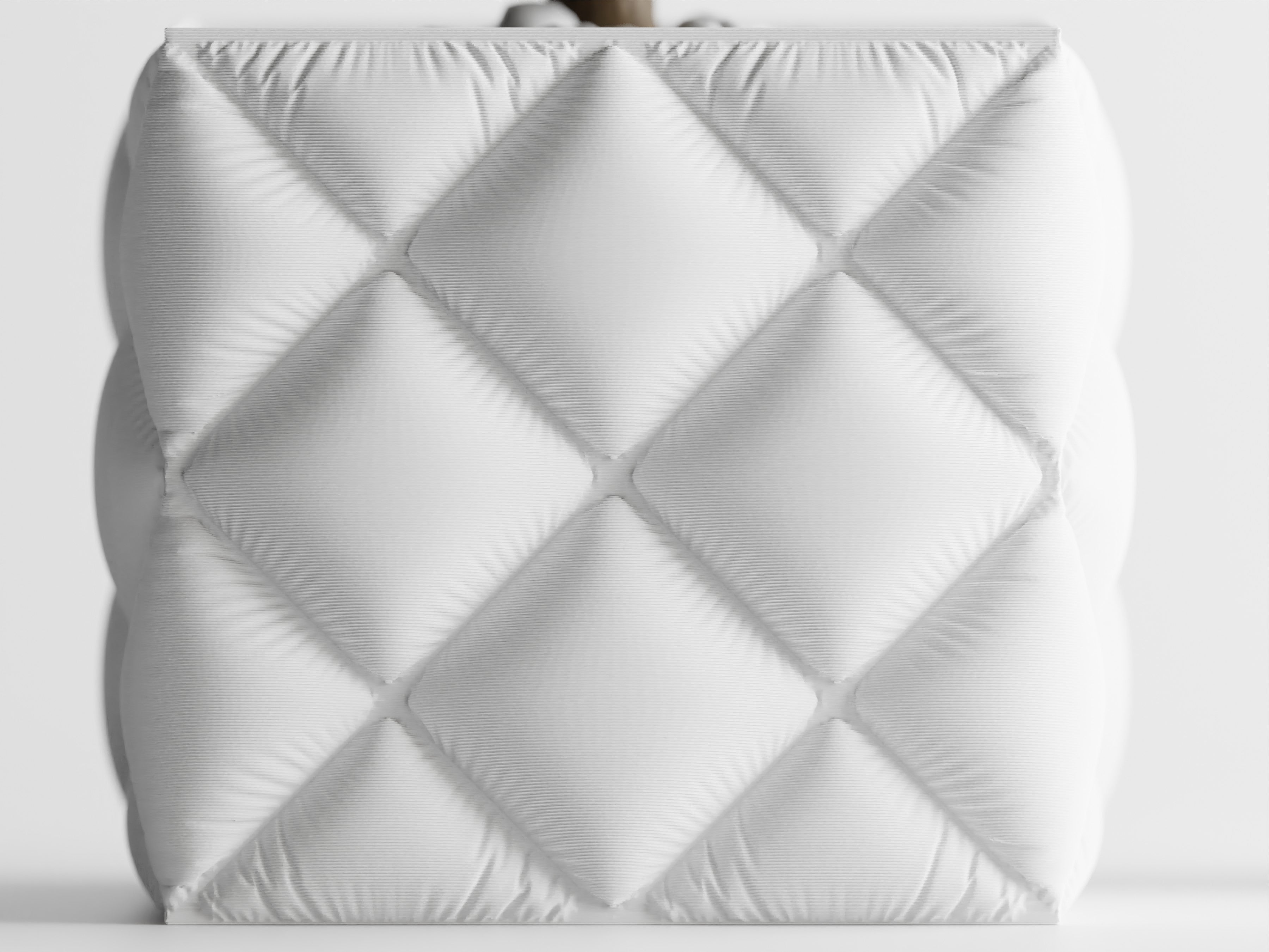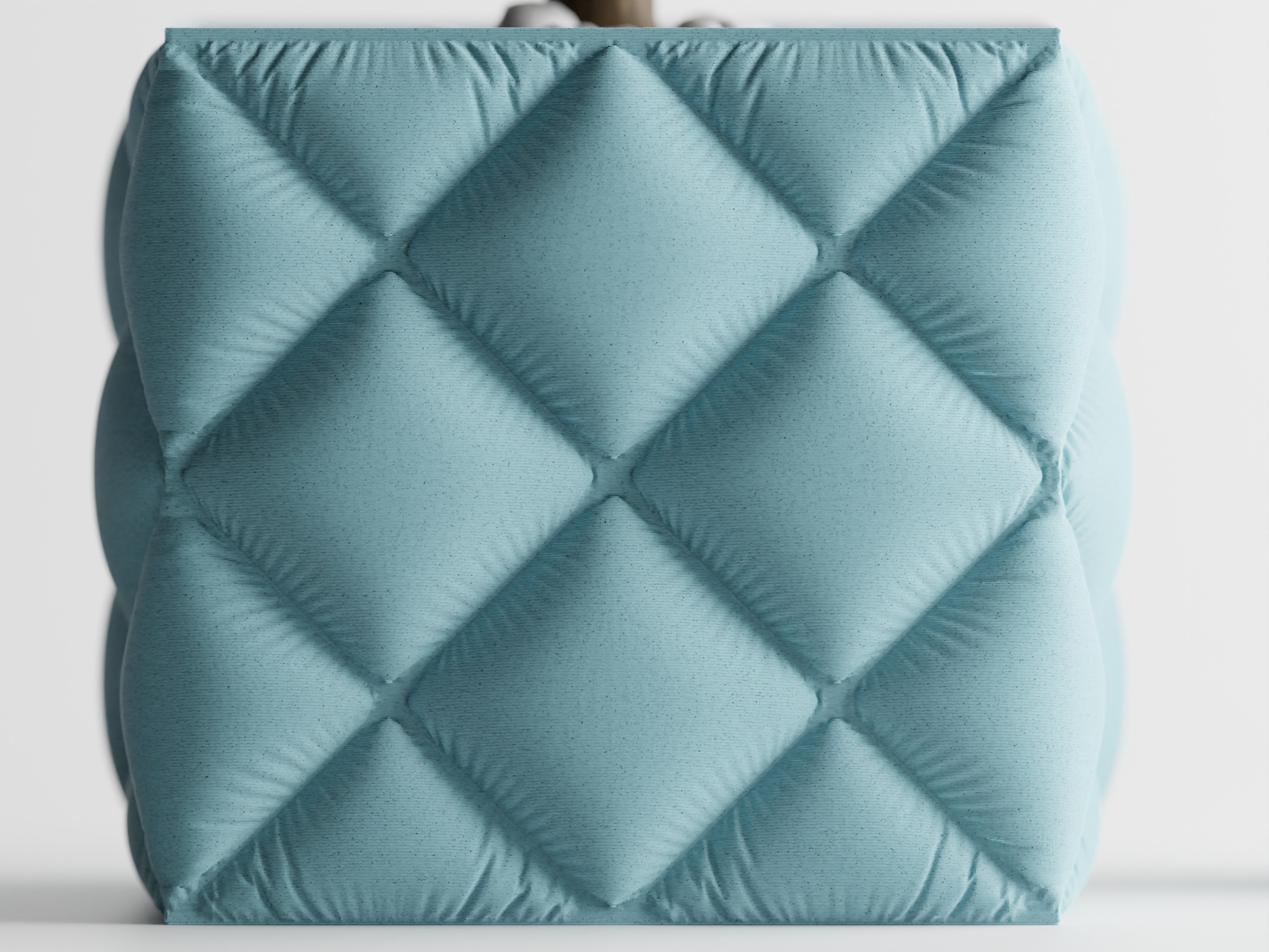 Quadratischer Pflanztopf mit großer, gesteppter Rautenstruktur im „Tufting“-Look. Weich wirkende Kissenfelder treffen auf einen sauber gefassten oberen Rand; der textilartige Charakter setzt Sukkulenten, Bonsai und kompakte Zimmerpflanzen elegant in Szene.