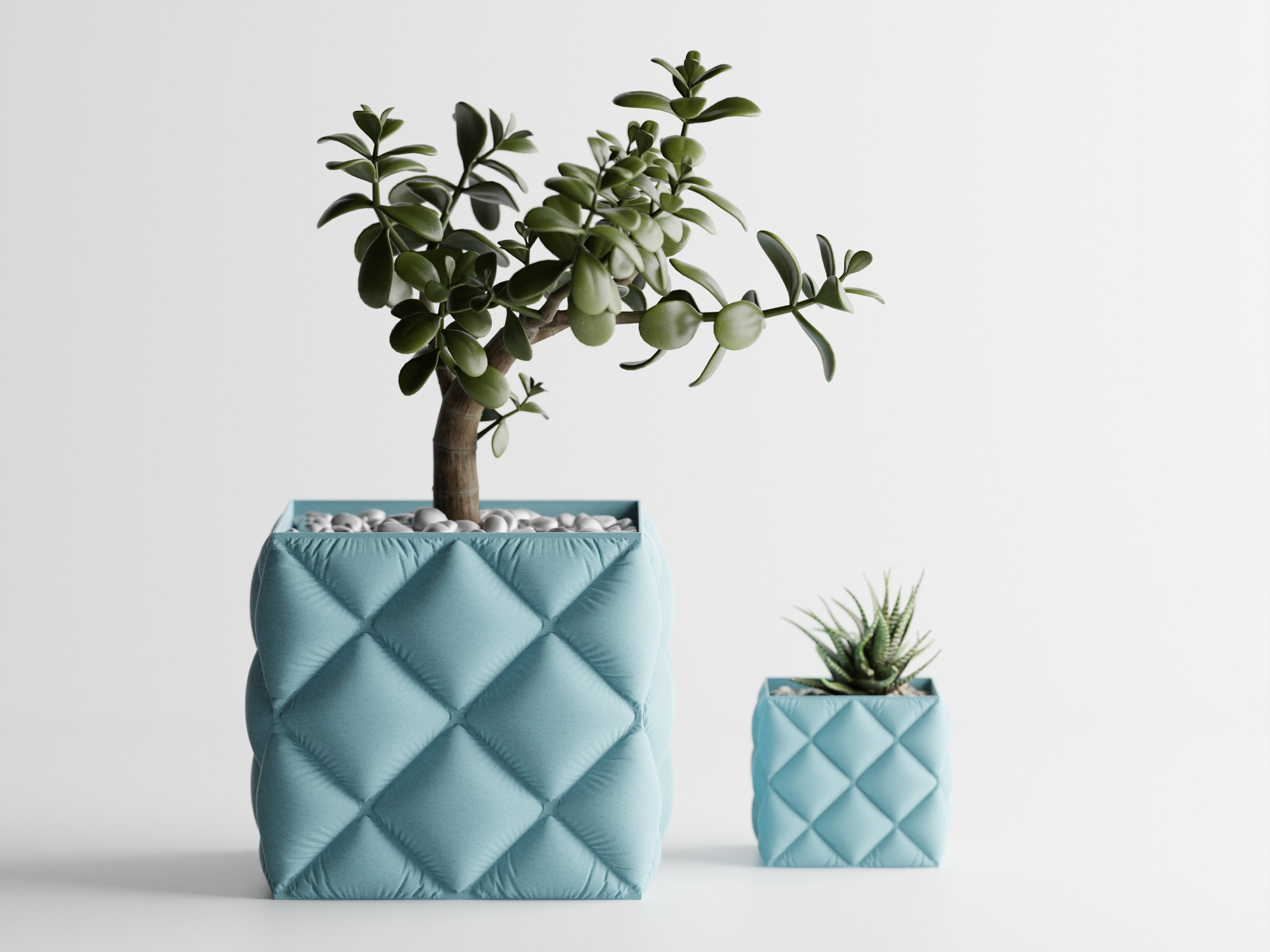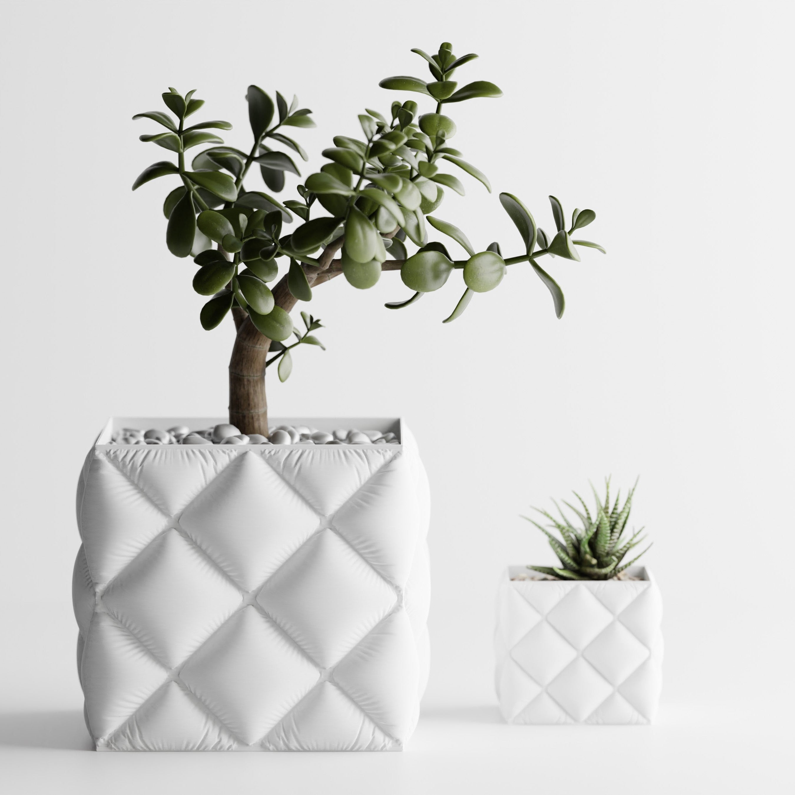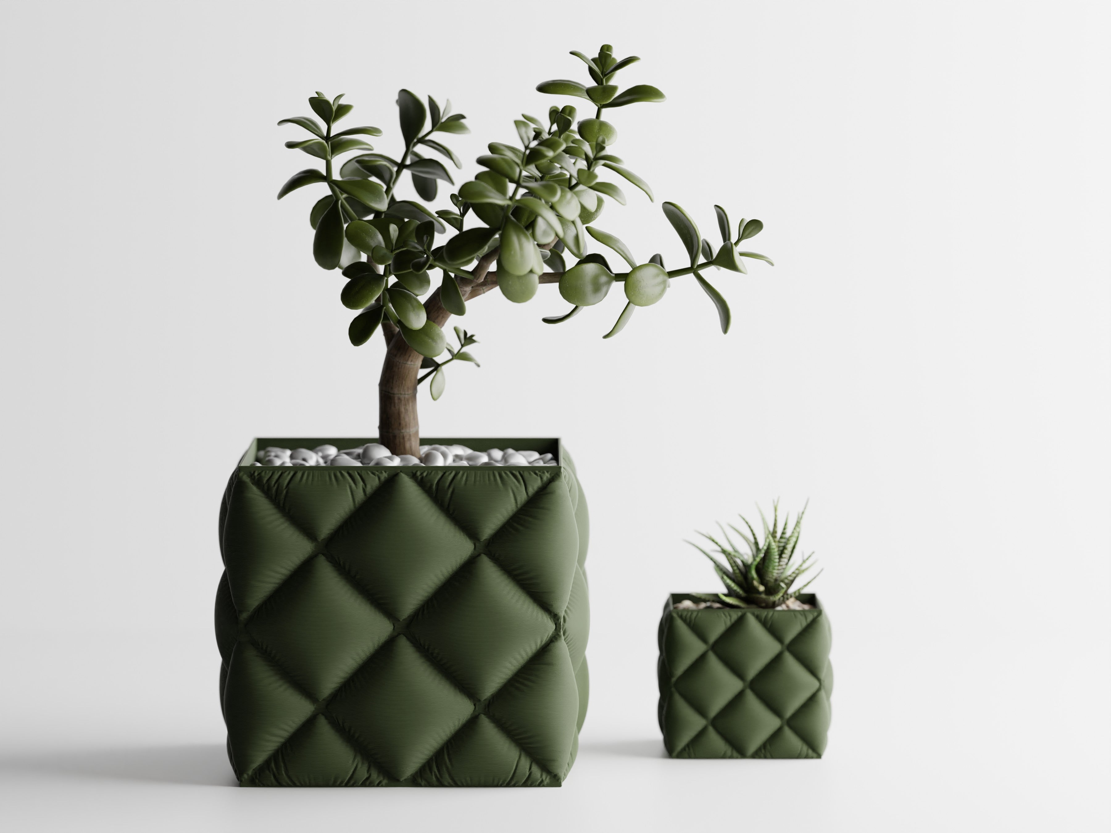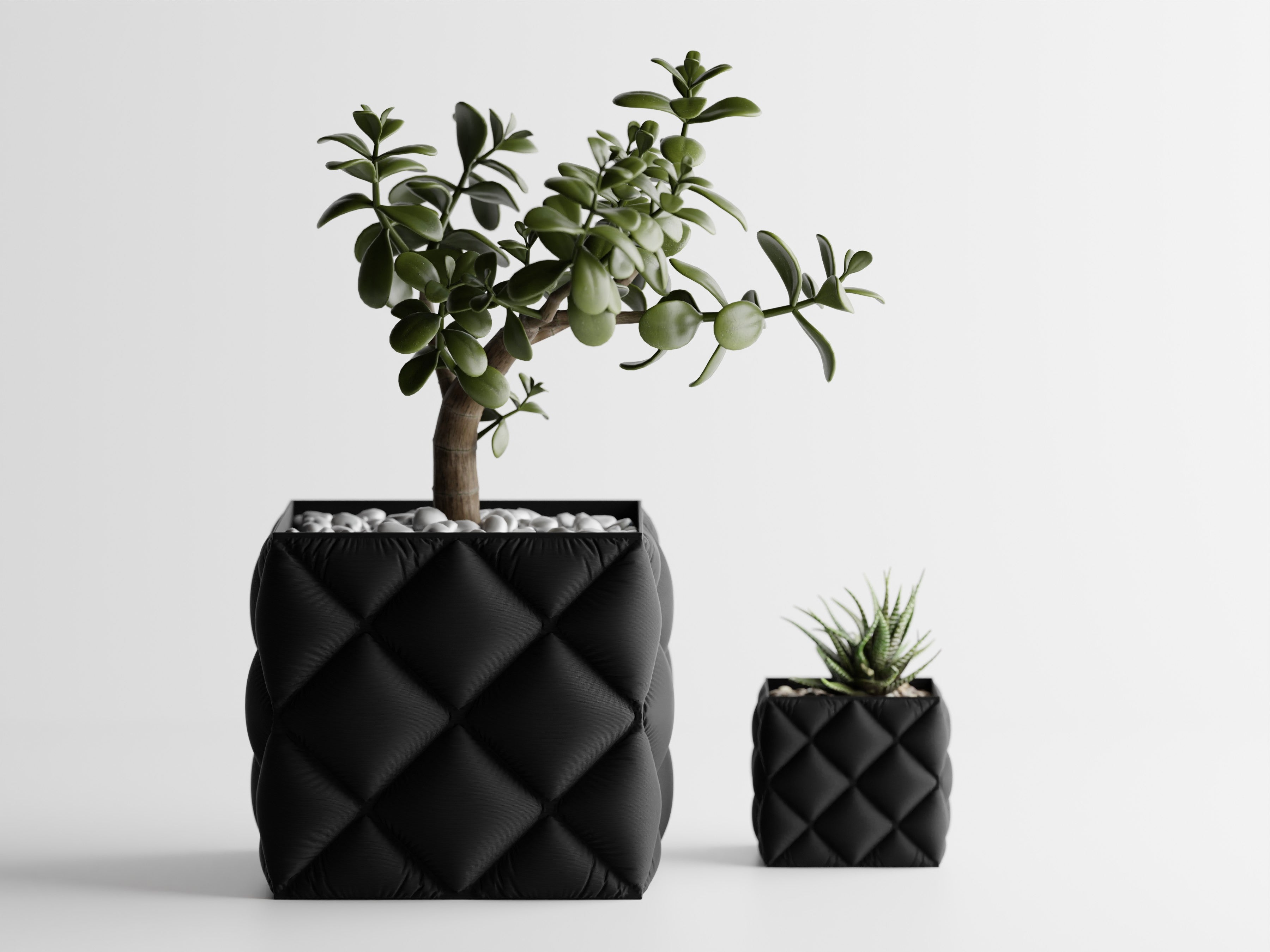Quadratischer Pflanztopf mit großer, gesteppter Rautenstruktur im „Tufting“-Look. Weich wirkende Kissenfelder treffen auf einen sauber gefassten oberen Rand; der textilartige Charakter setzt Sukkulenten, Bonsai und kompakte Zimmerpflanzen elegant in Szene.