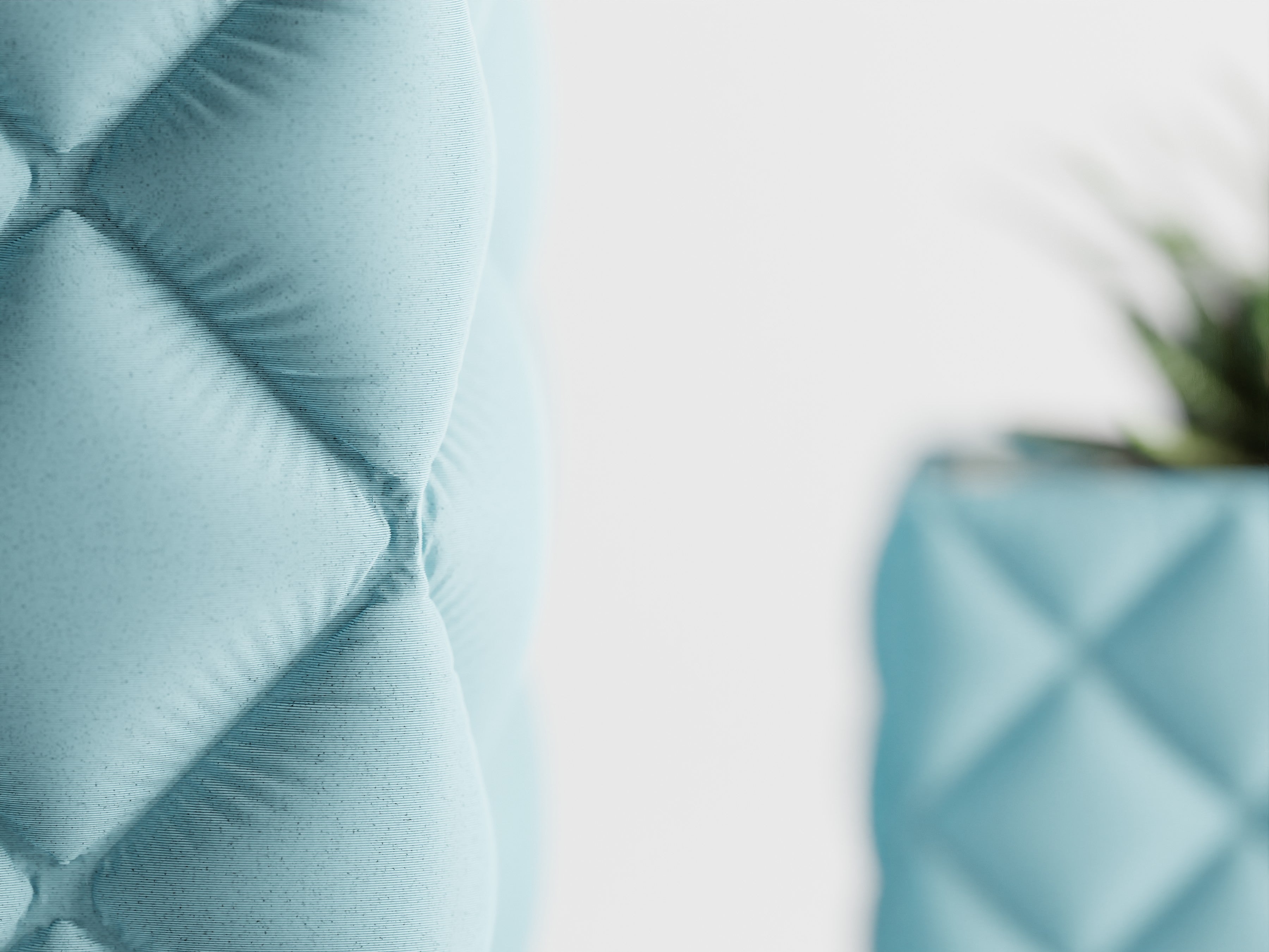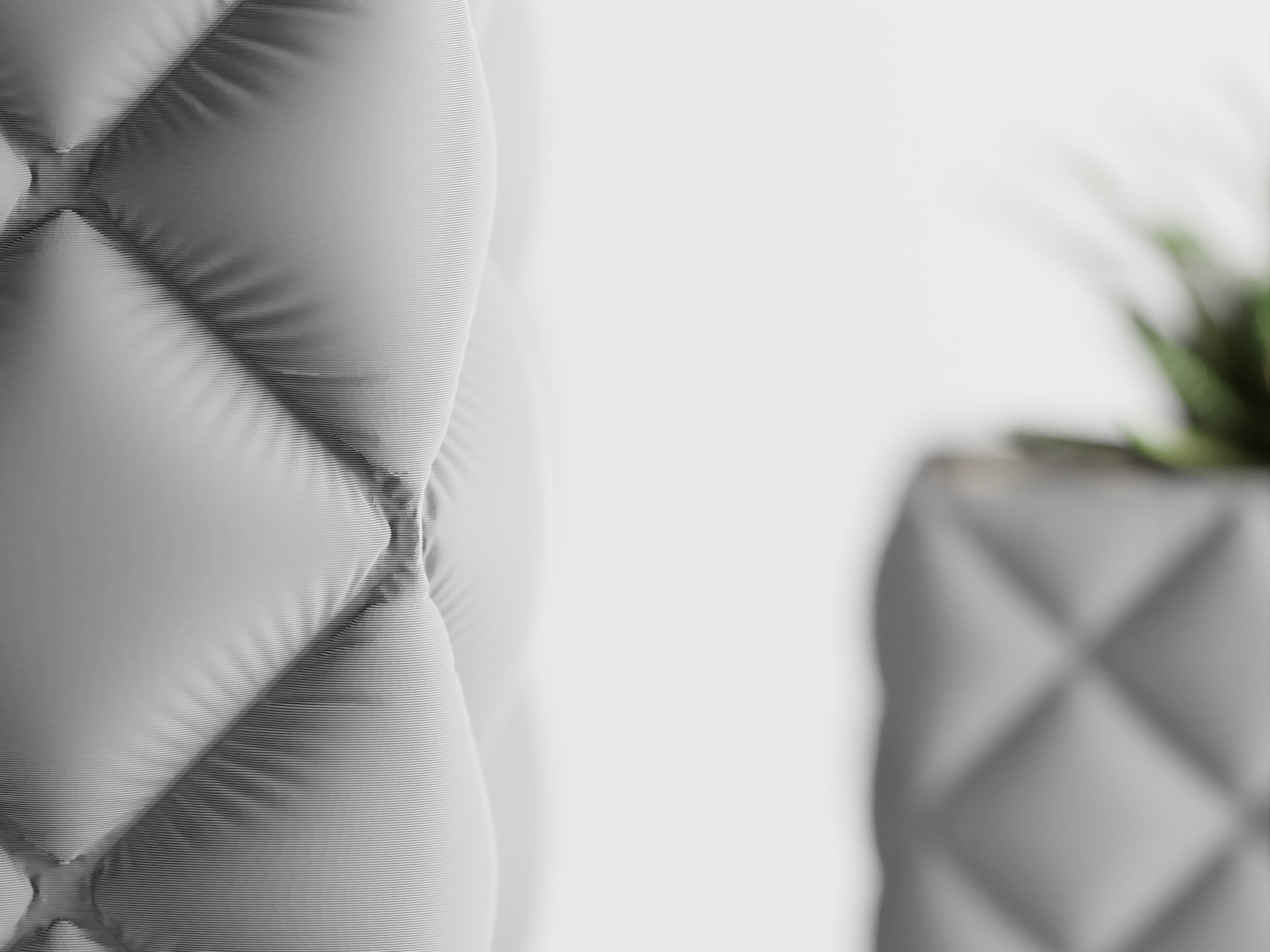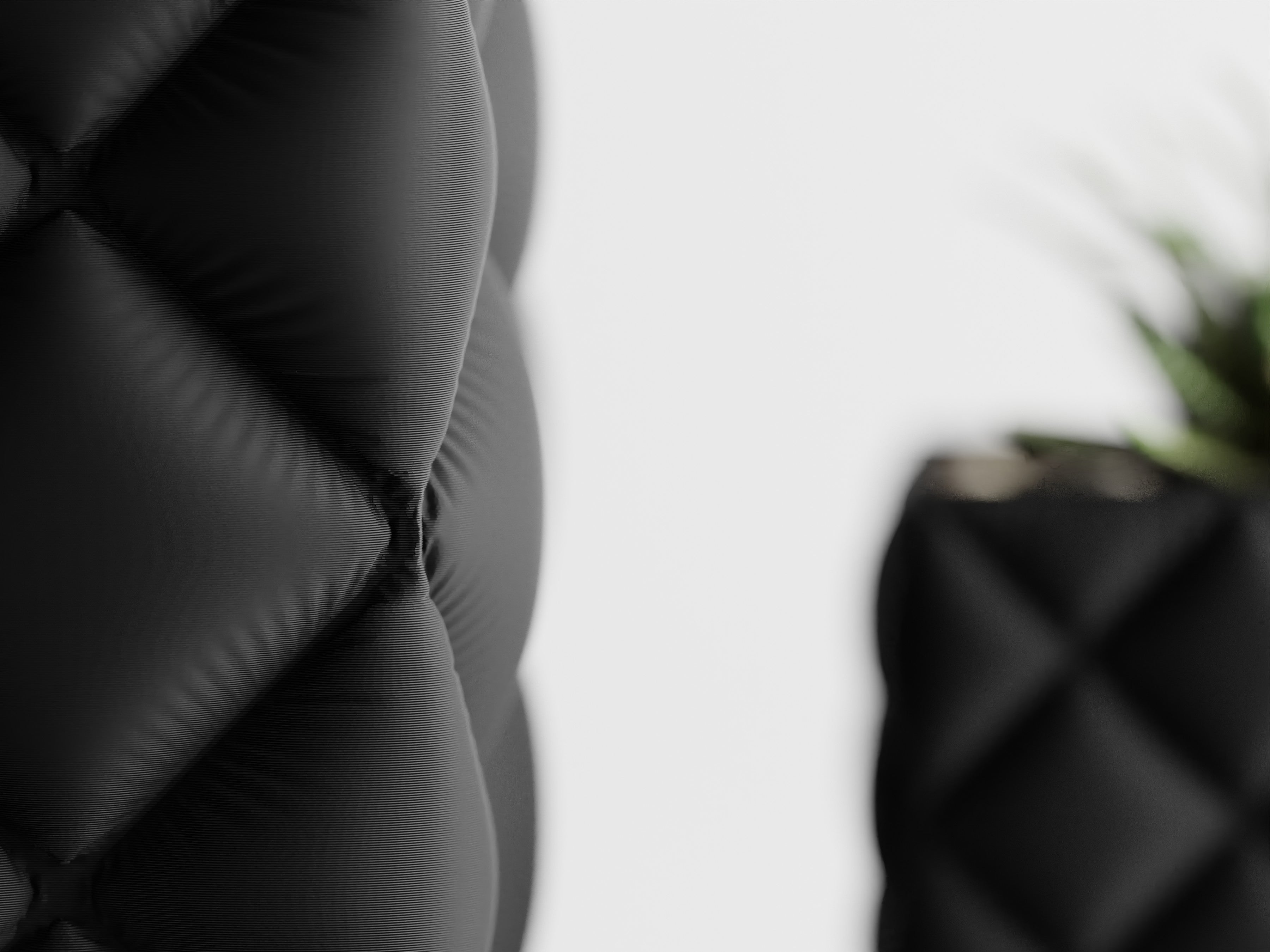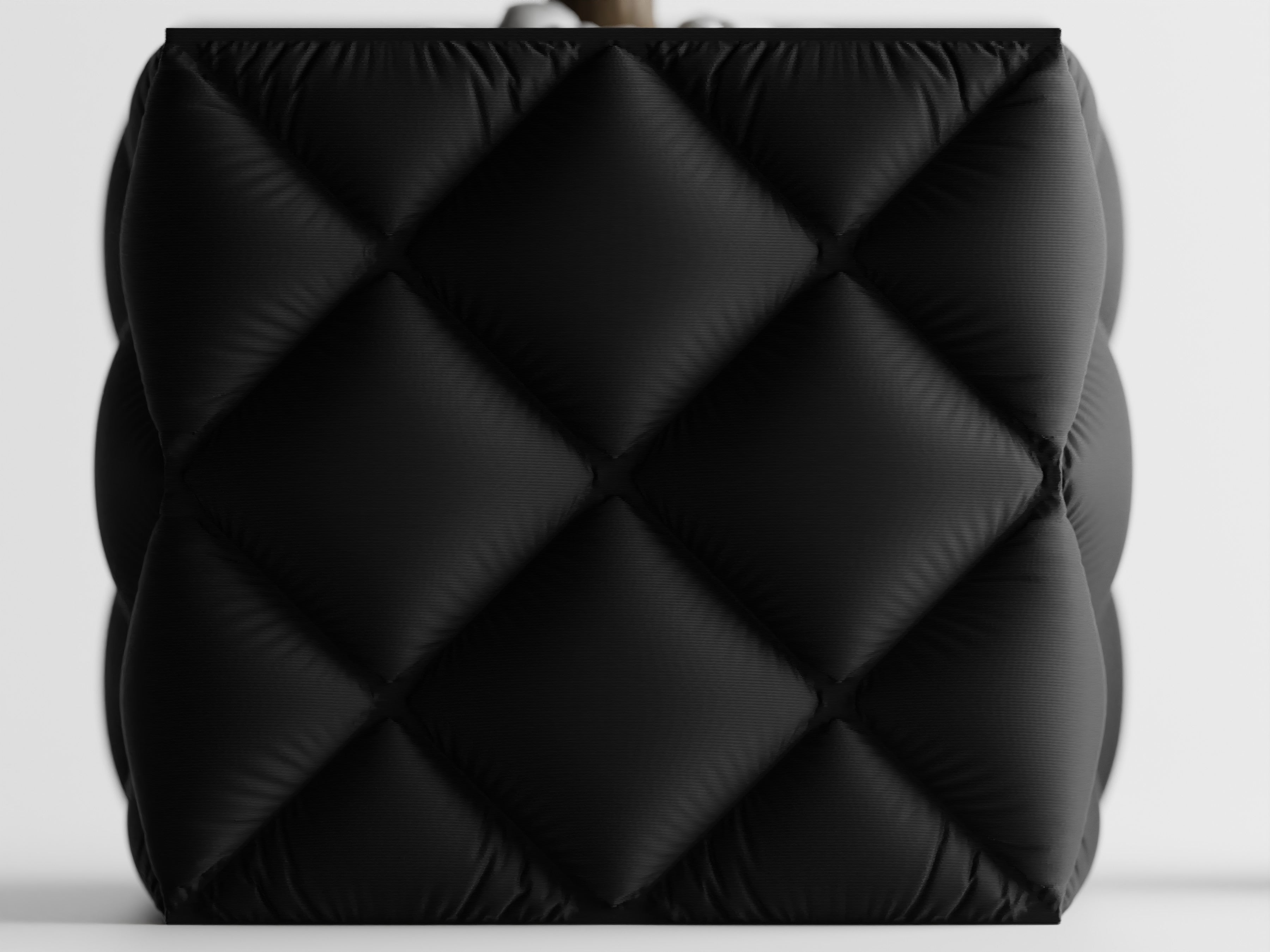 Quadratischer Pflanztopf mit großer, gesteppter Rautenstruktur im „Tufting“-Look. Weich wirkende Kissenfelder treffen auf einen sauber gefassten oberen Rand; der textilartige Charakter setzt Sukkulenten, Bonsai und kompakte Zimmerpflanzen elegant in Szene.