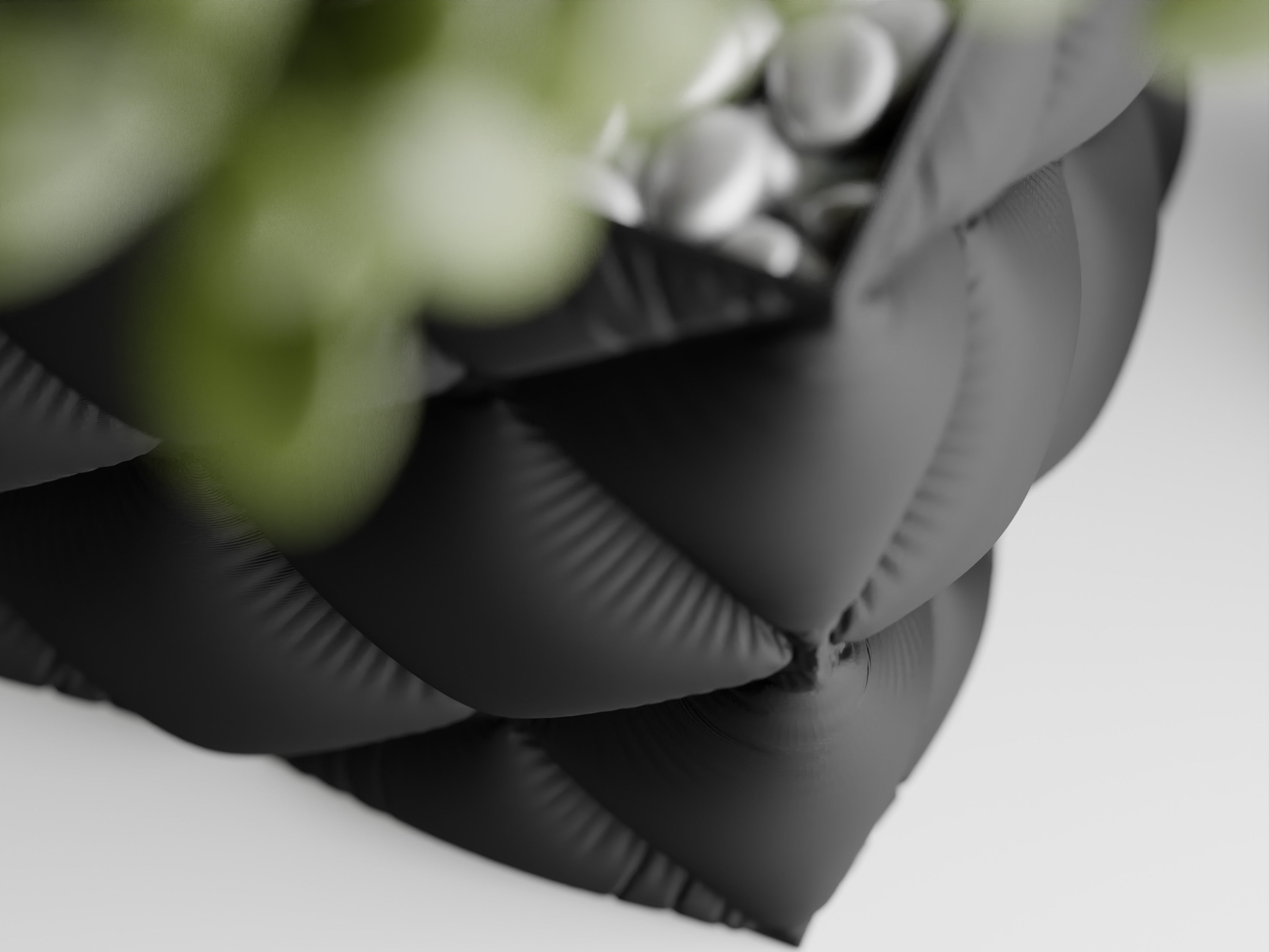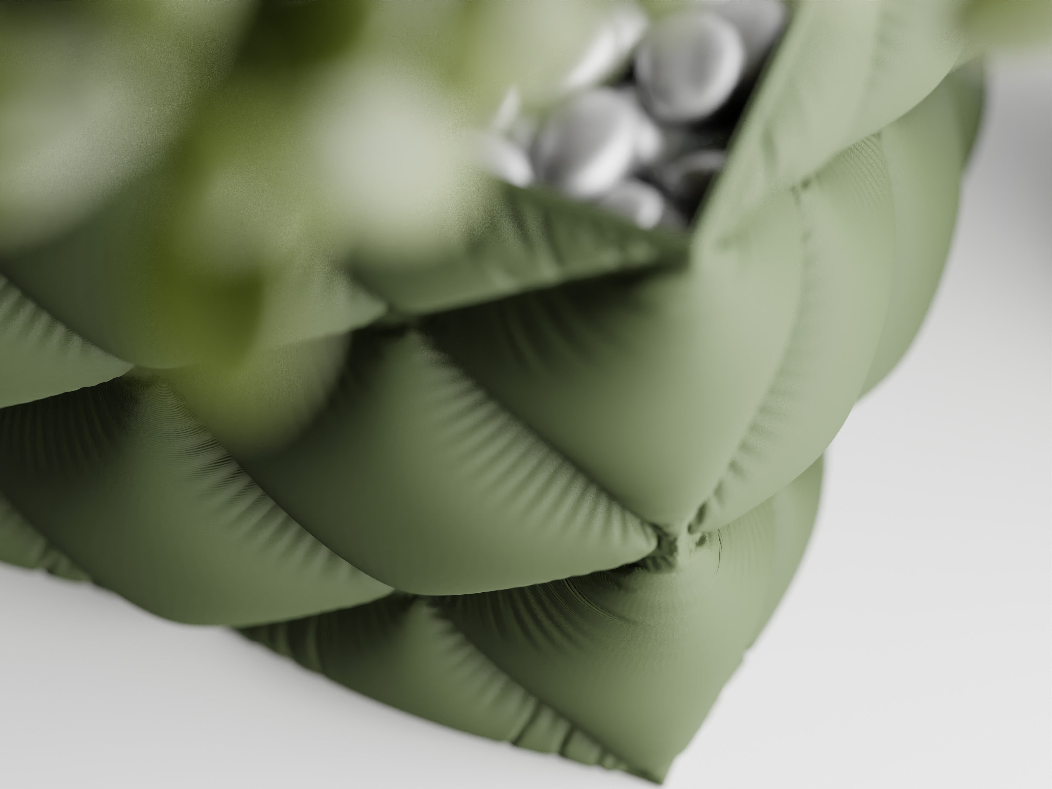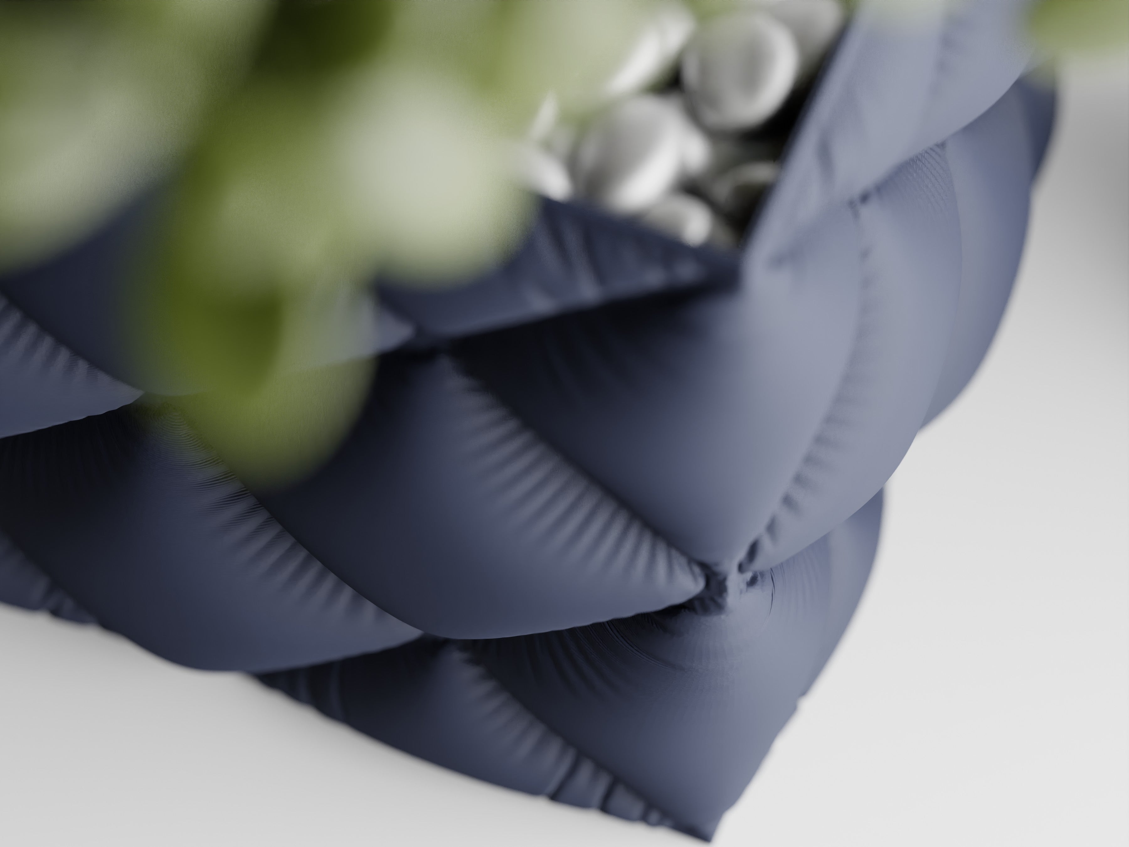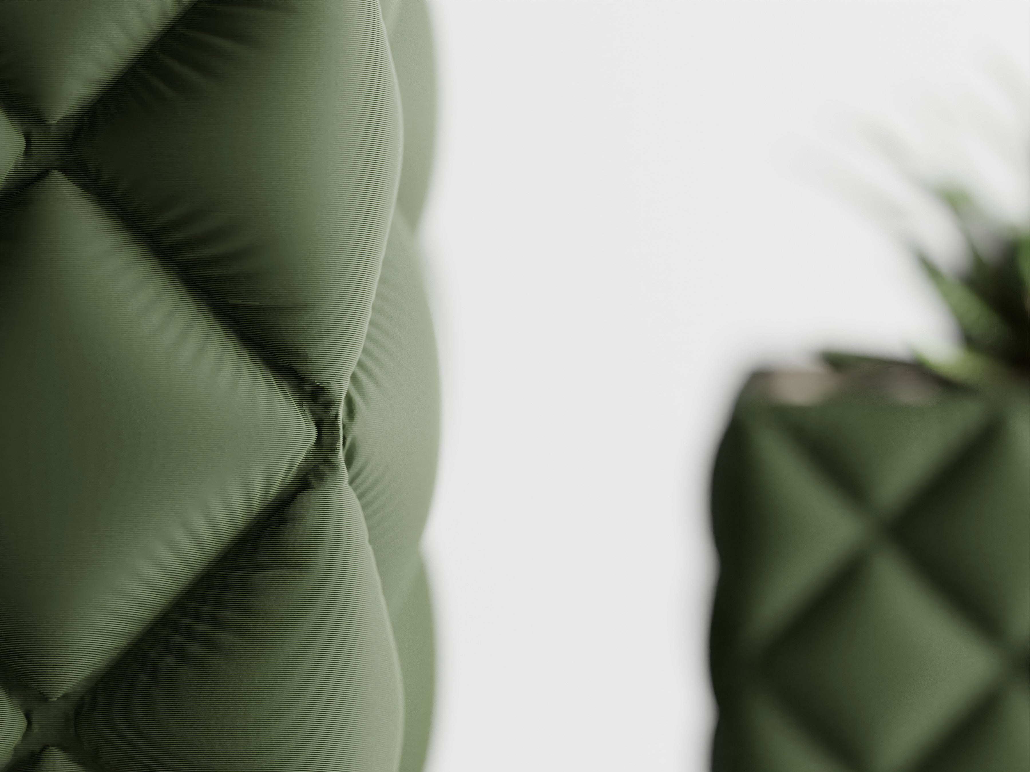 Quadratischer Pflanztopf mit großer, gesteppter Rautenstruktur im „Tufting“-Look. Weich wirkende Kissenfelder treffen auf einen sauber gefassten oberen Rand; der textilartige Charakter setzt Sukkulenten, Bonsai und kompakte Zimmerpflanzen elegant in Szene.