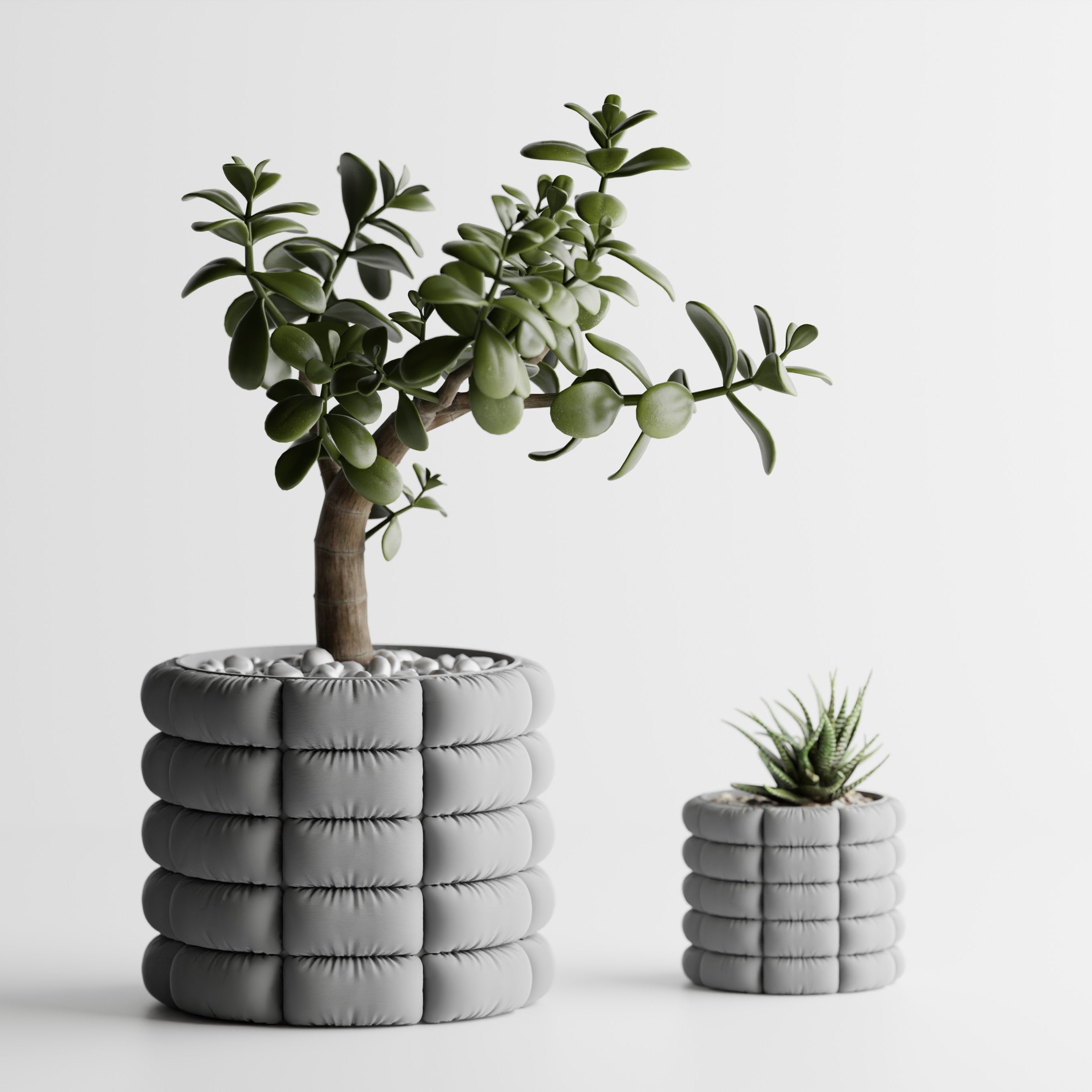 Weicher „Puffer“-Look, klare Form: Dieser Pflanztopf setzt mit seinen ringförmig gepolsterten Segmenten ein modernes Statement – minimalistisch, wohnlich und zeitlos. Außenkörper im 3D-Druck aus PLA (pflanzenbasiert), innen mit passgenauem Einsatz für echte Alltagstauglichkeit.