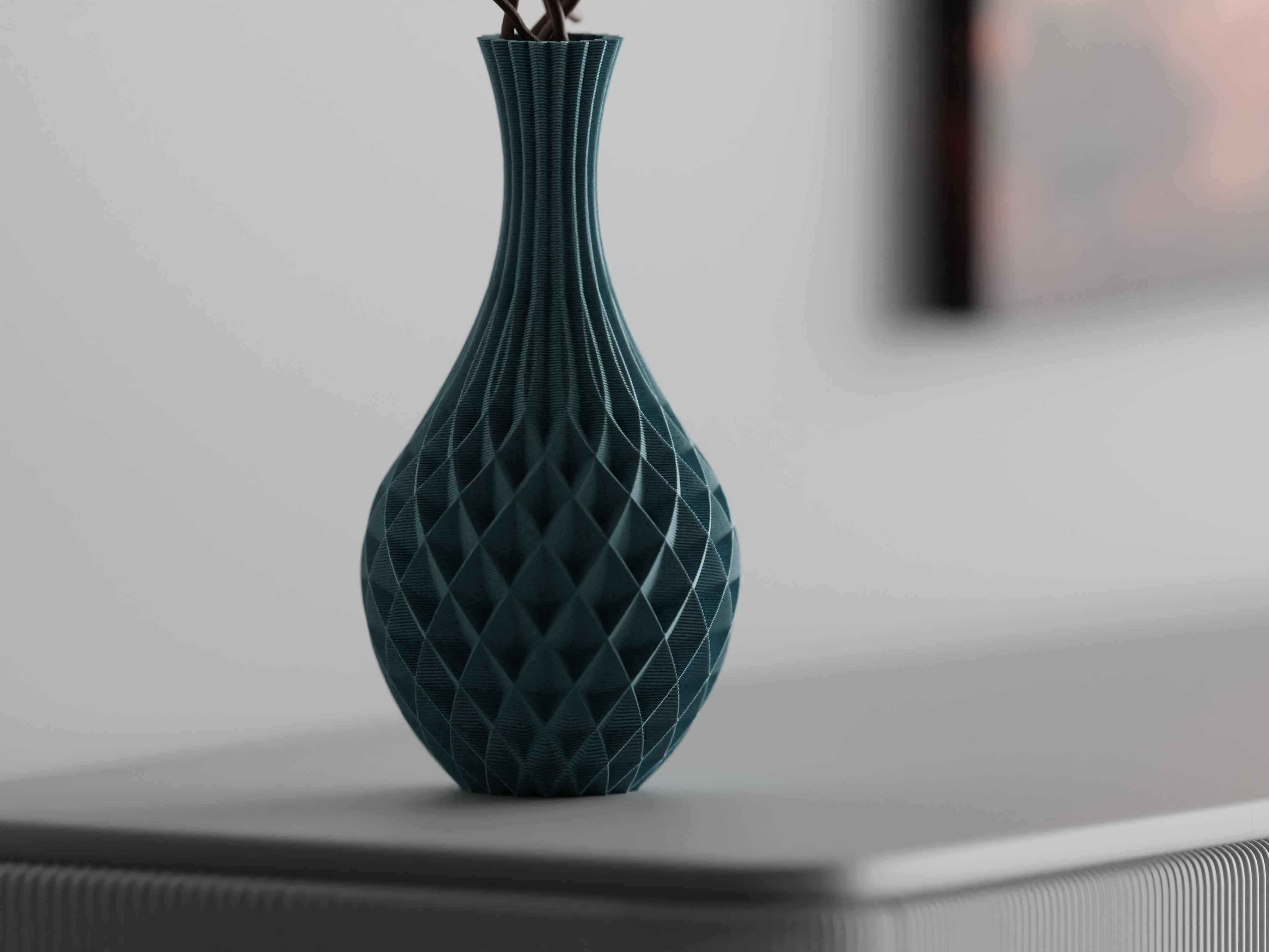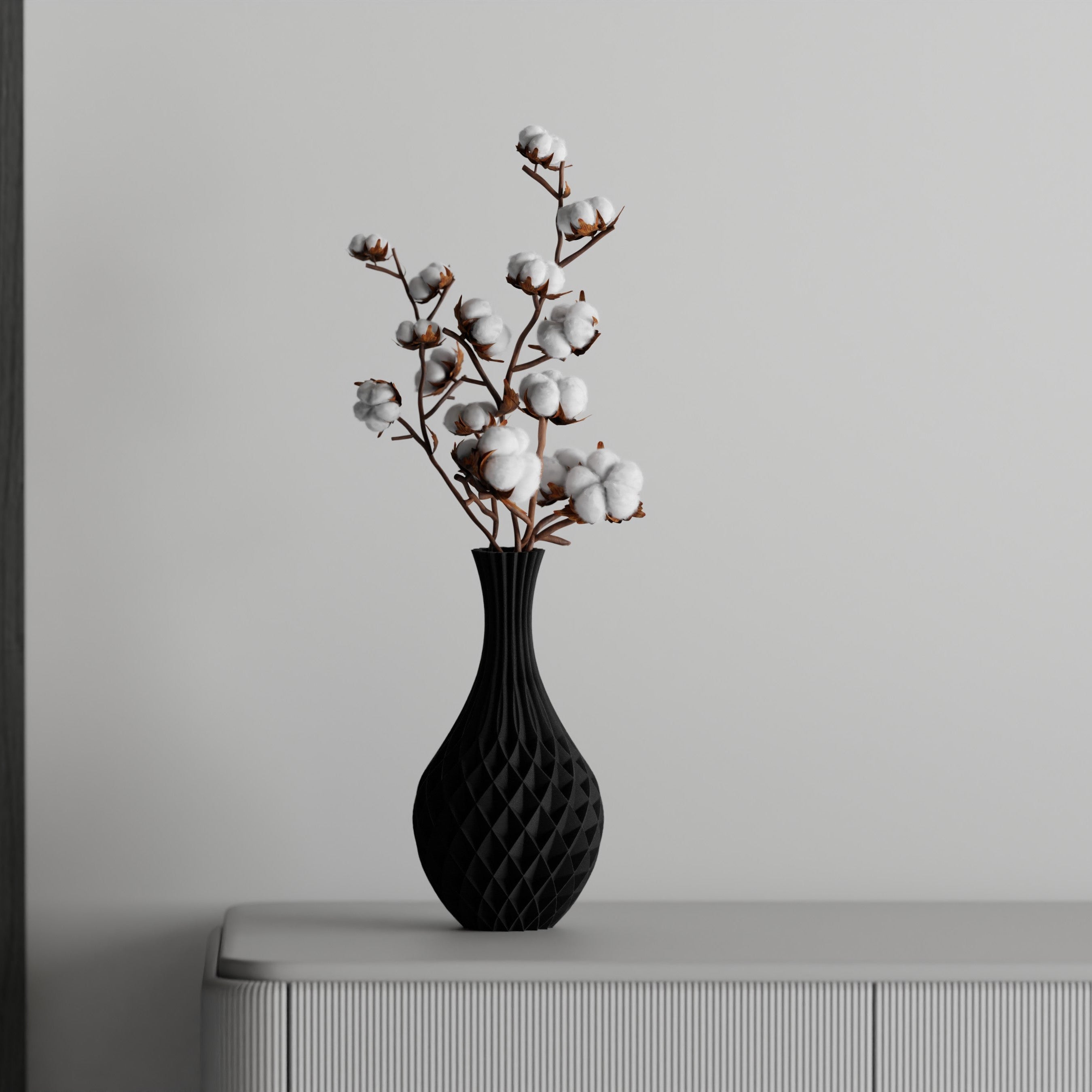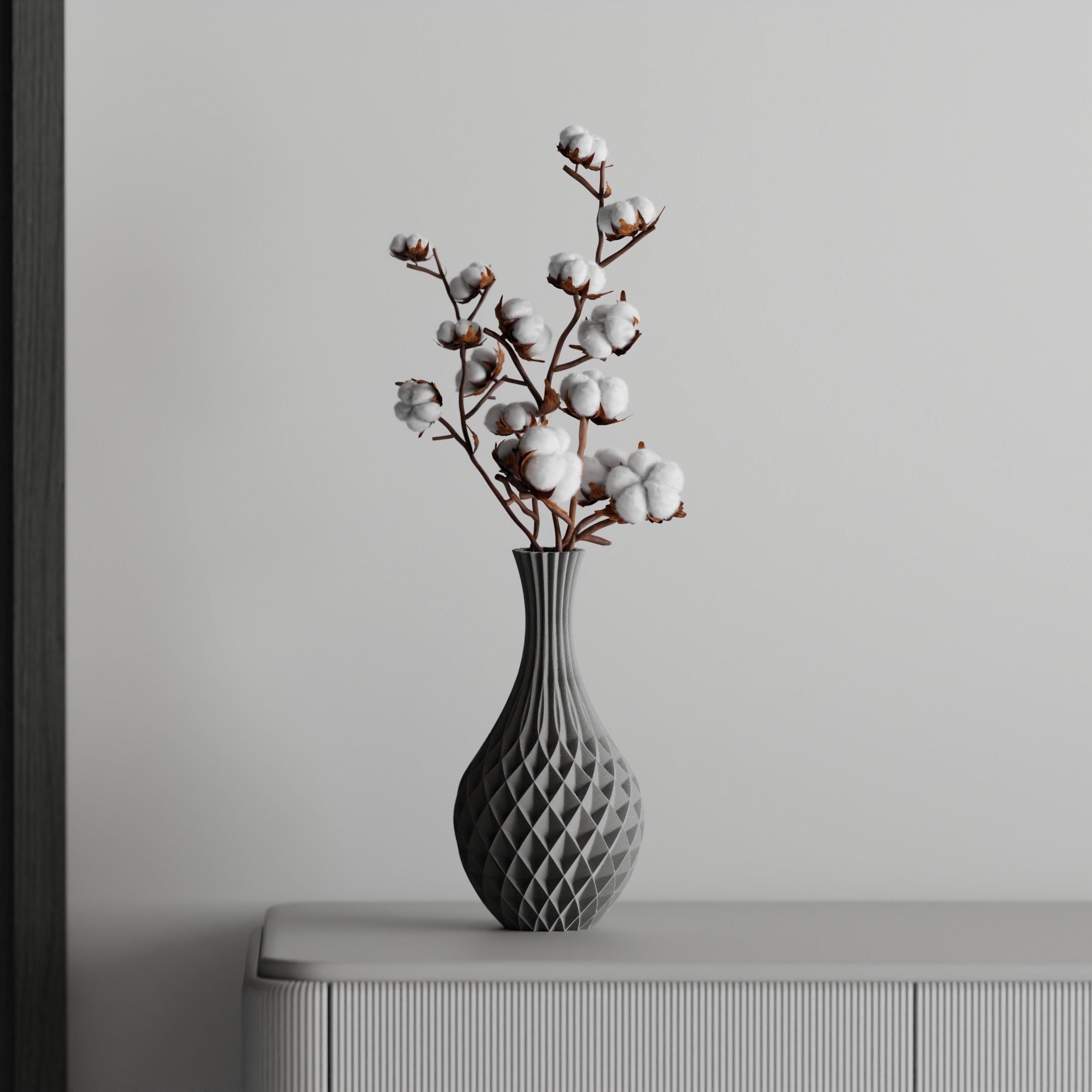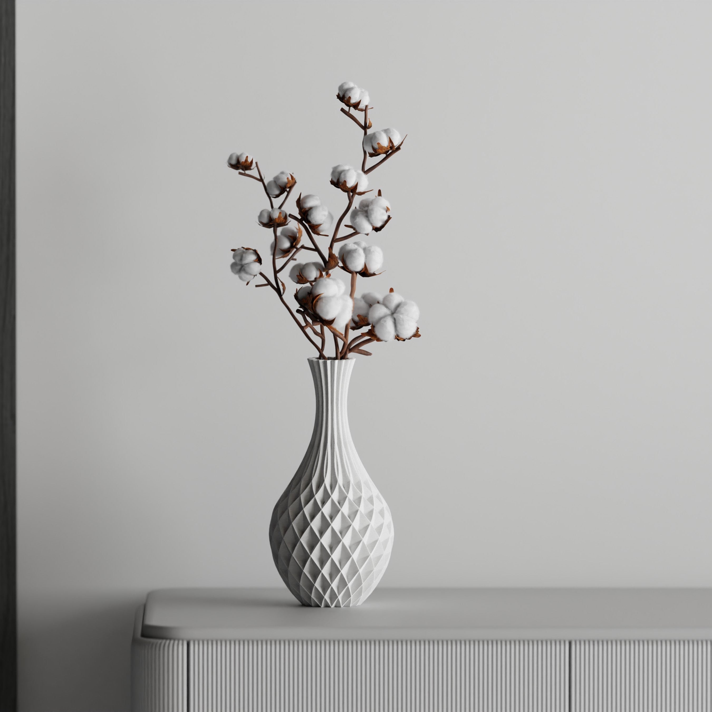 Elegante Vase mit weich taillierter Silhouette und diamantförmiger Facettenstruktur. Die Oberfläche fängt das Licht plastisch ein, der schmale Hals setzt einzelne Stiele und schlanke Bouquets präzise in Szene.