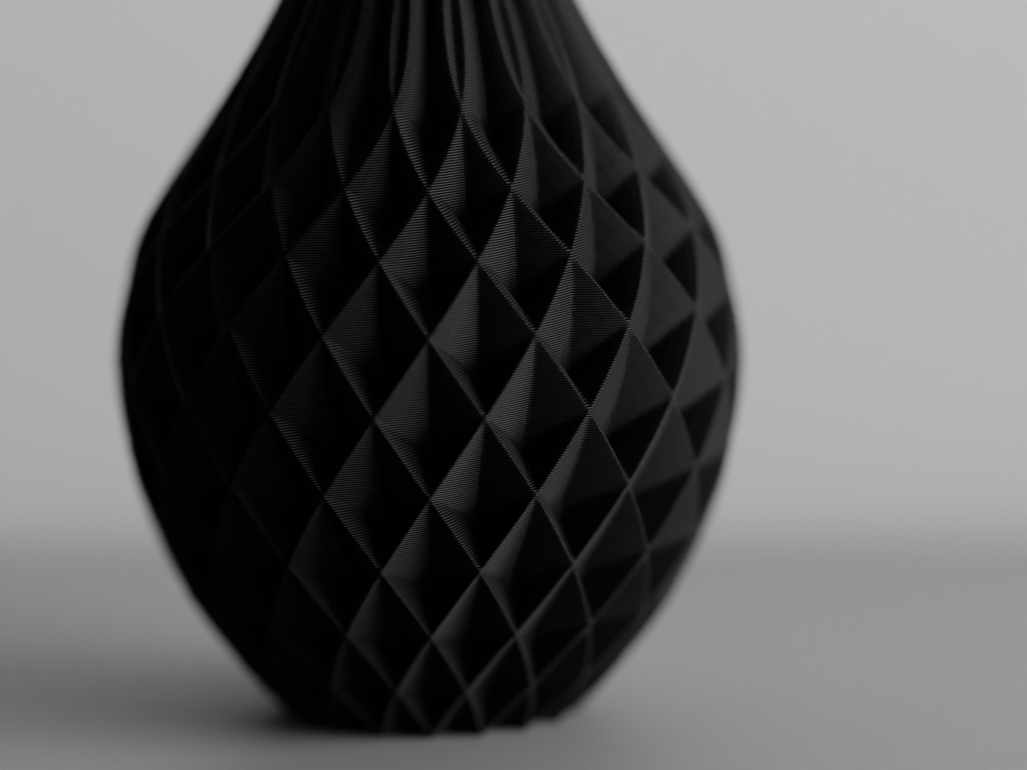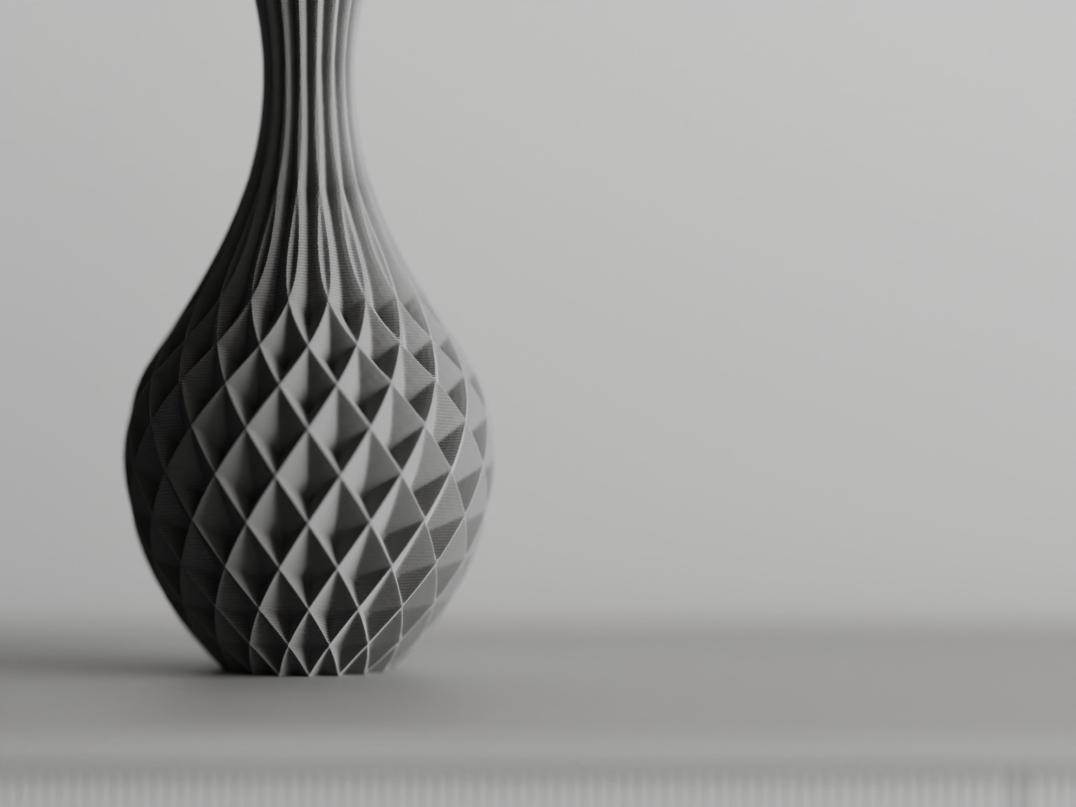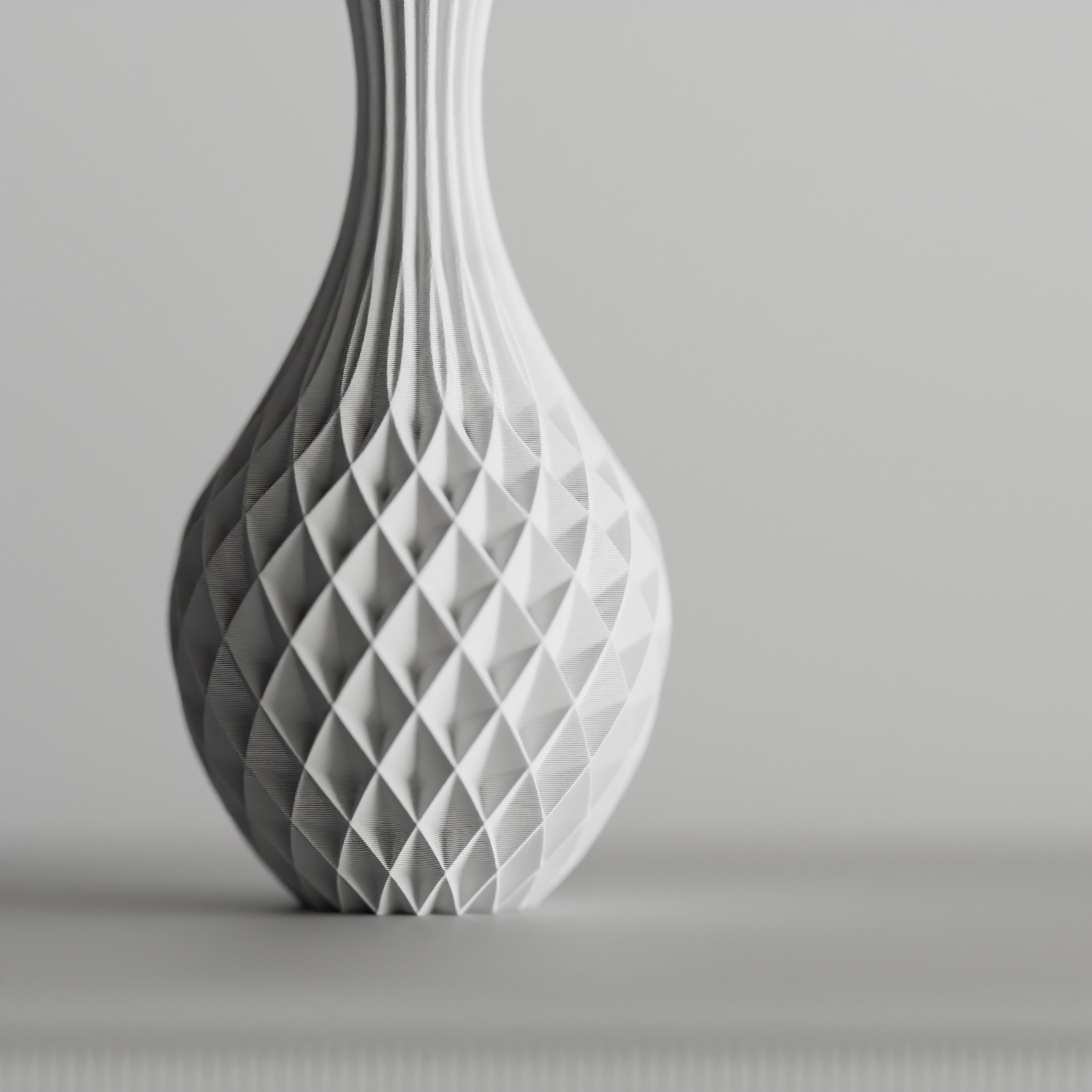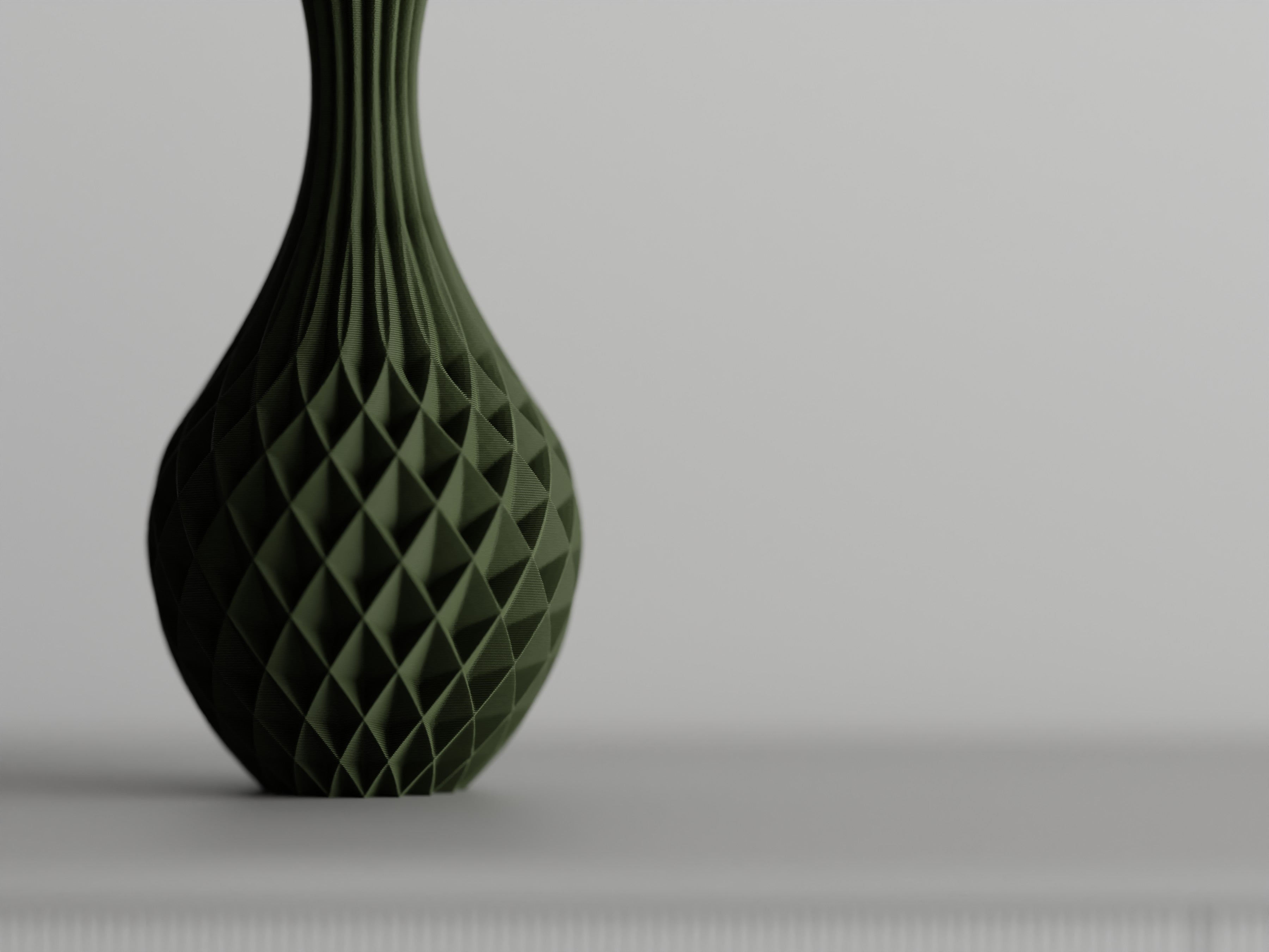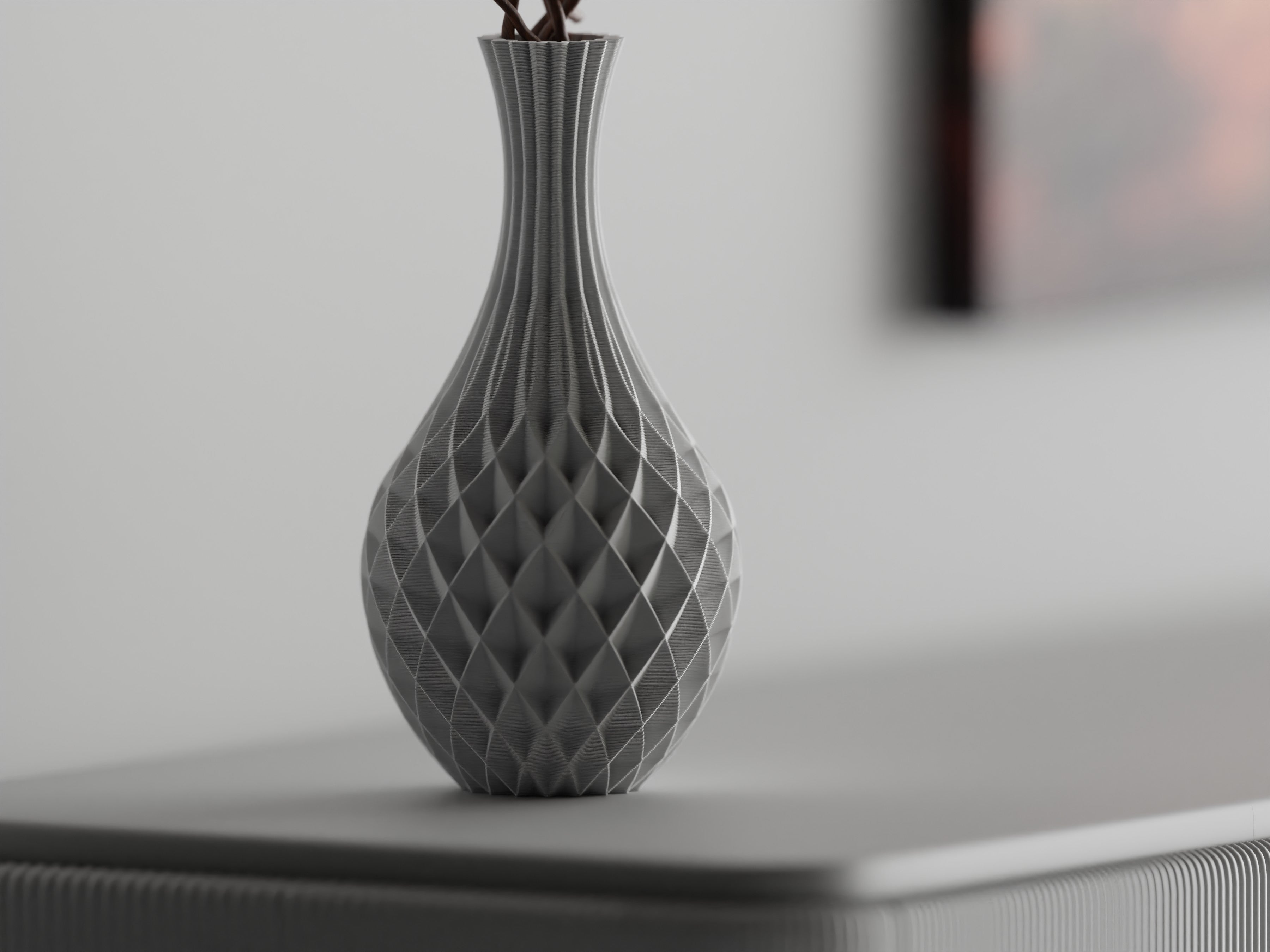 Elegante Vase mit weich taillierter Silhouette und diamantförmiger Facettenstruktur. Die Oberfläche fängt das Licht plastisch ein, der schmale Hals setzt einzelne Stiele und schlanke Bouquets präzise in Szene.