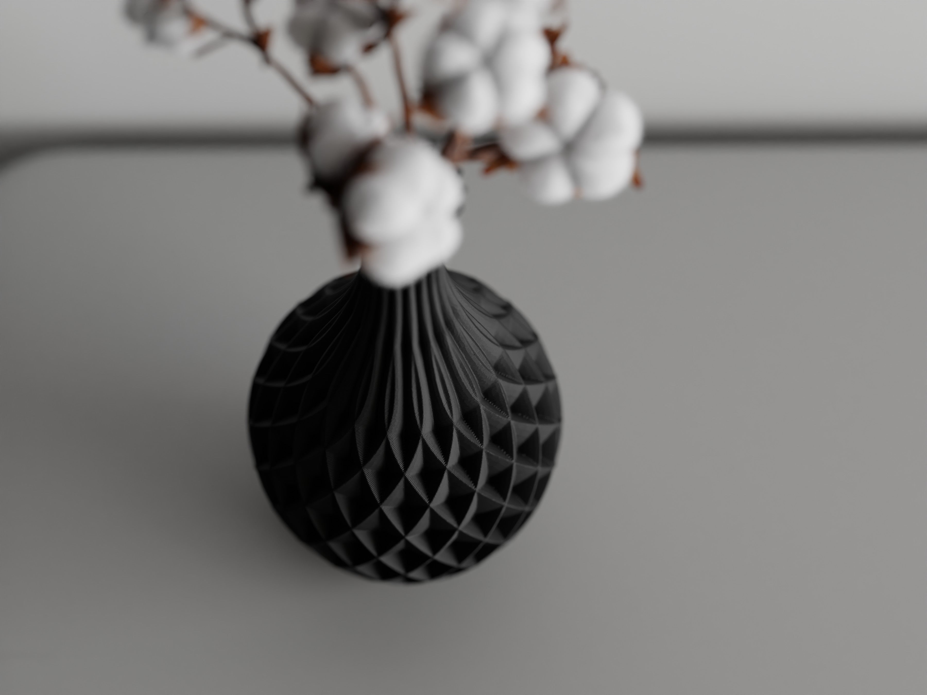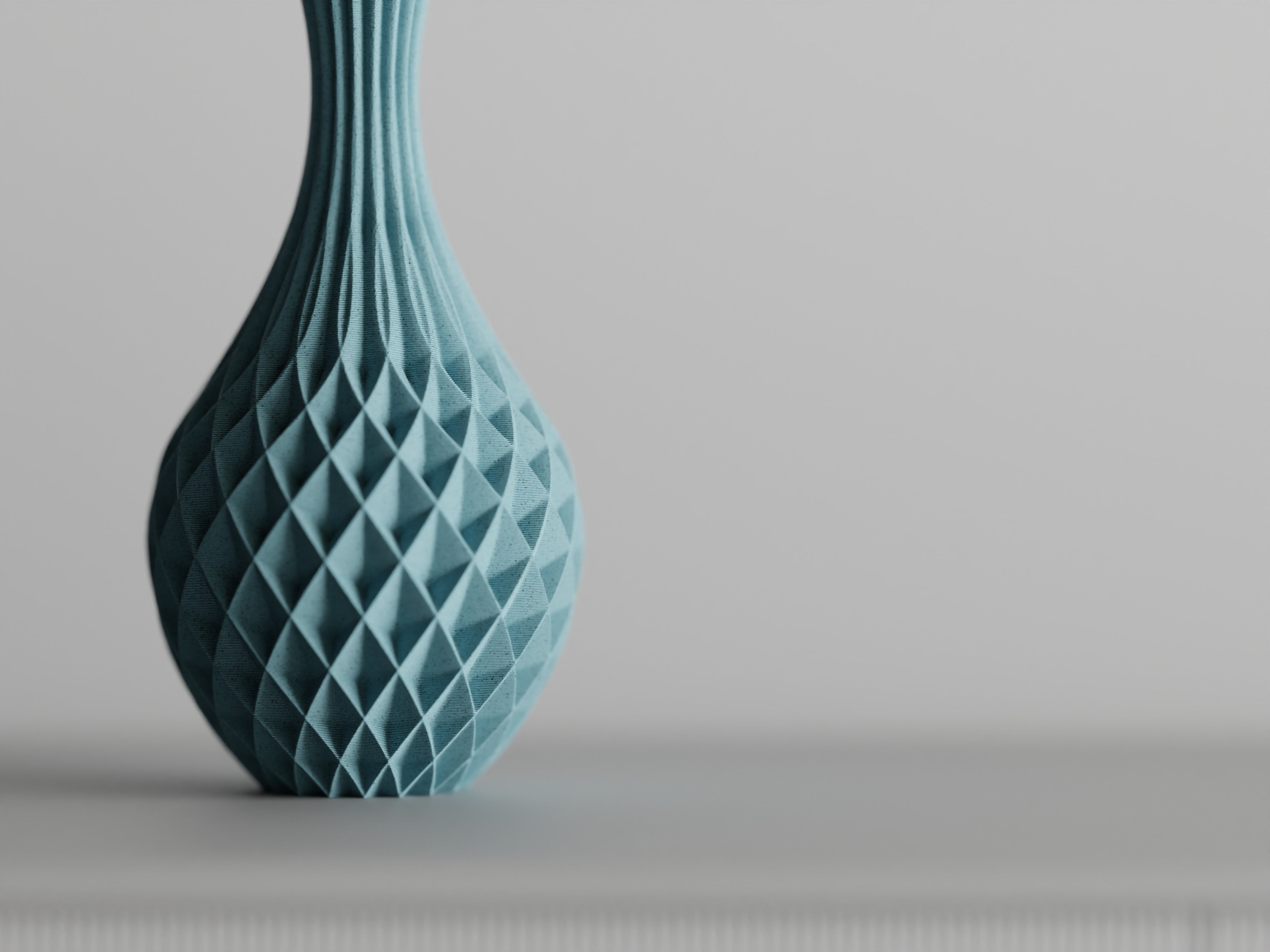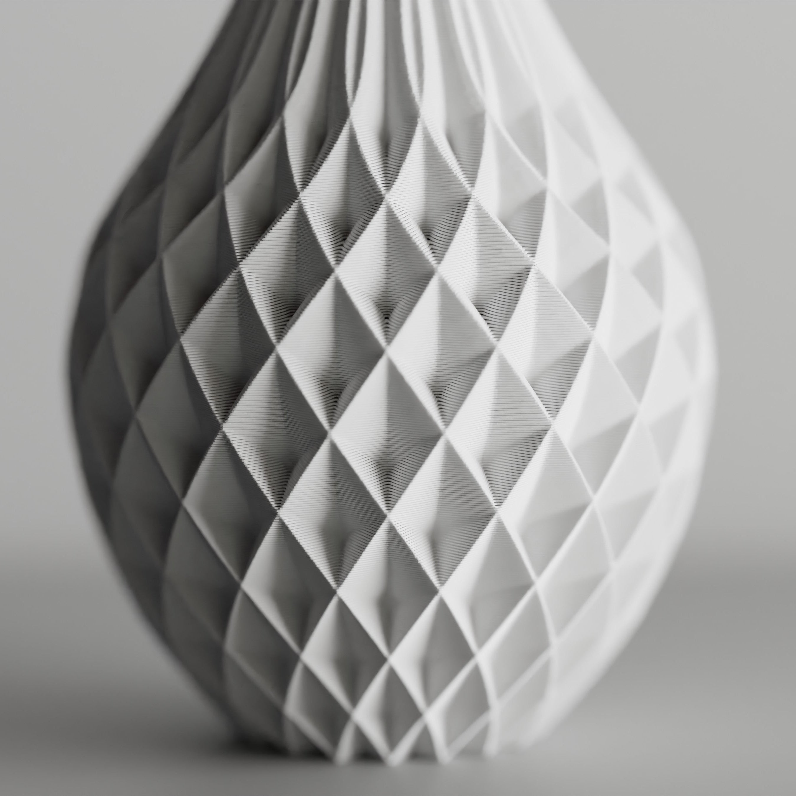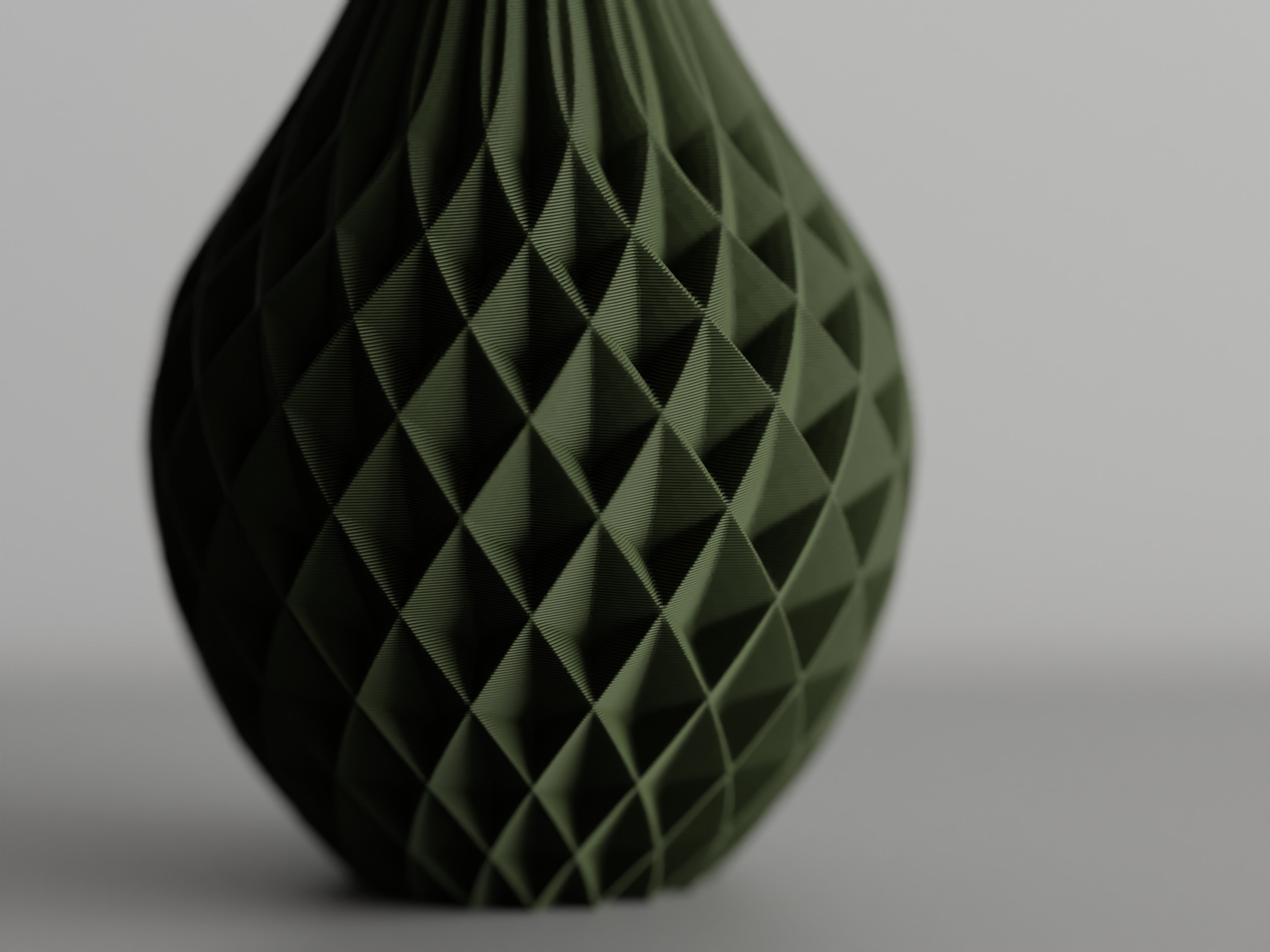 Elegante Vase mit weich taillierter Silhouette und diamantförmiger Facettenstruktur. Die Oberfläche fängt das Licht plastisch ein, der schmale Hals setzt einzelne Stiele und schlanke Bouquets präzise in Szene.