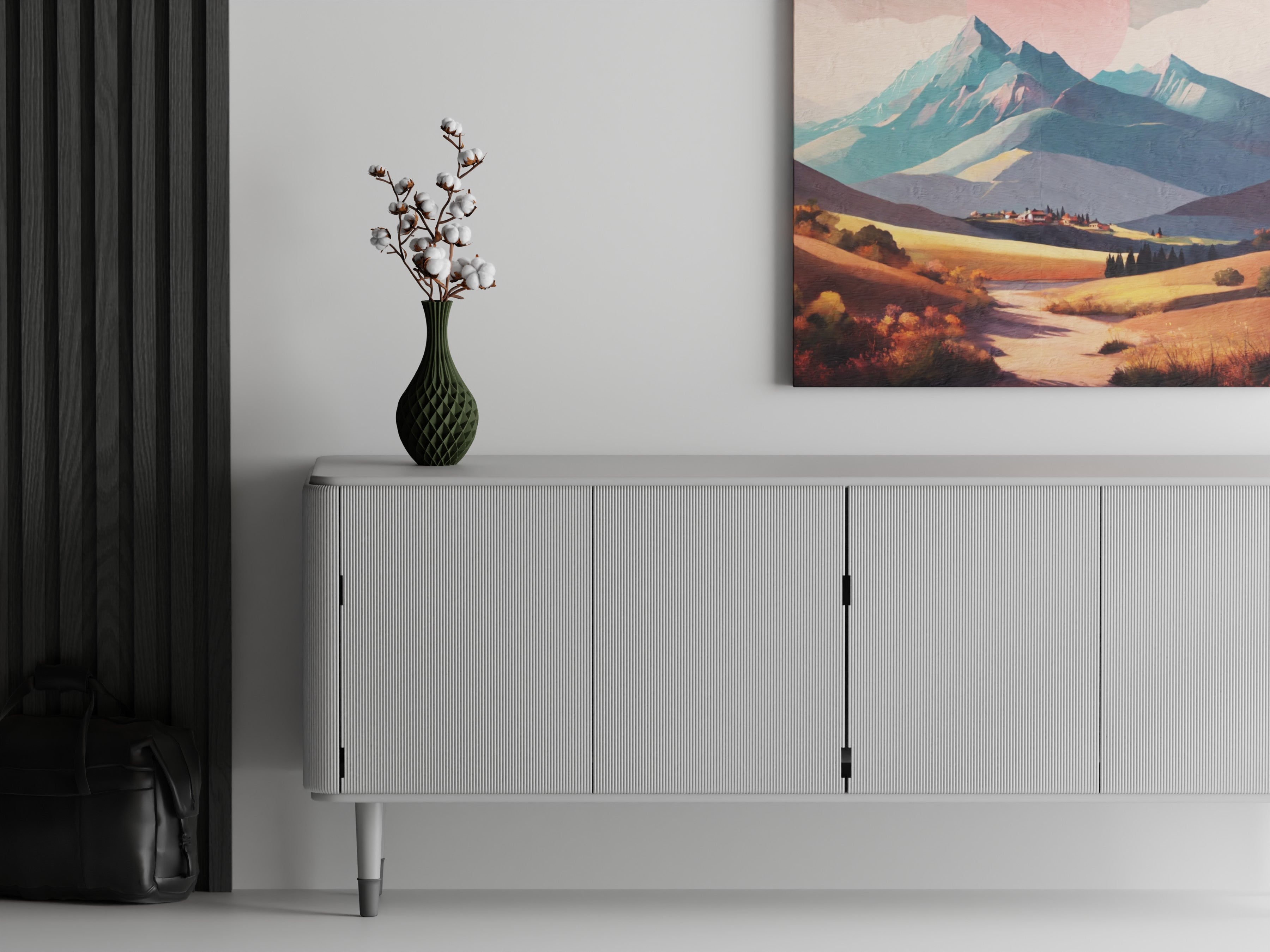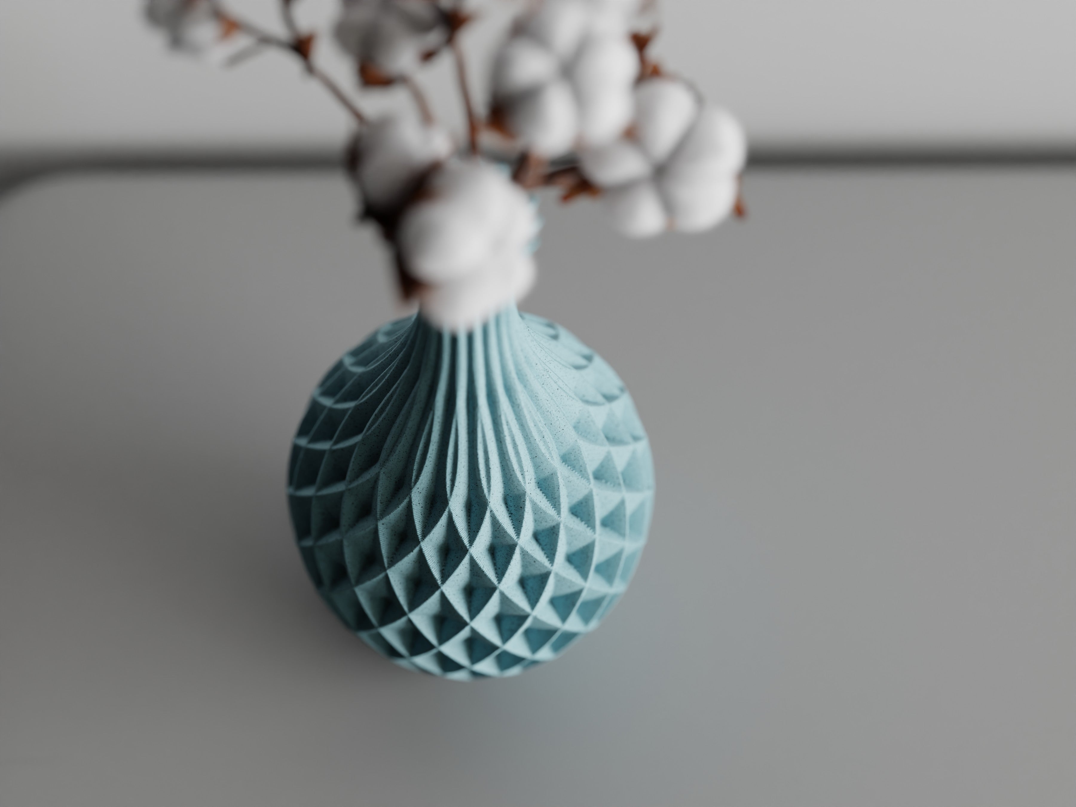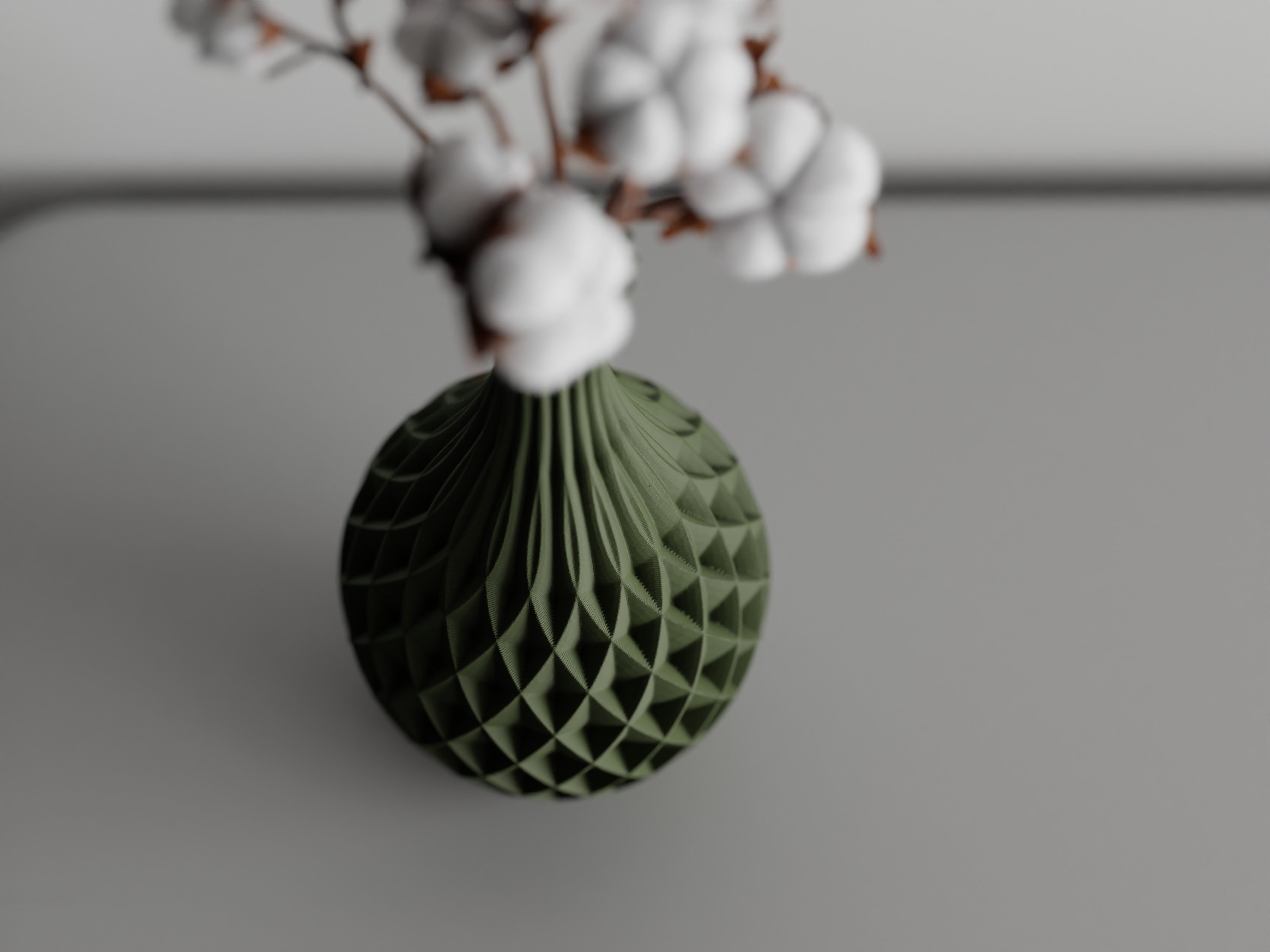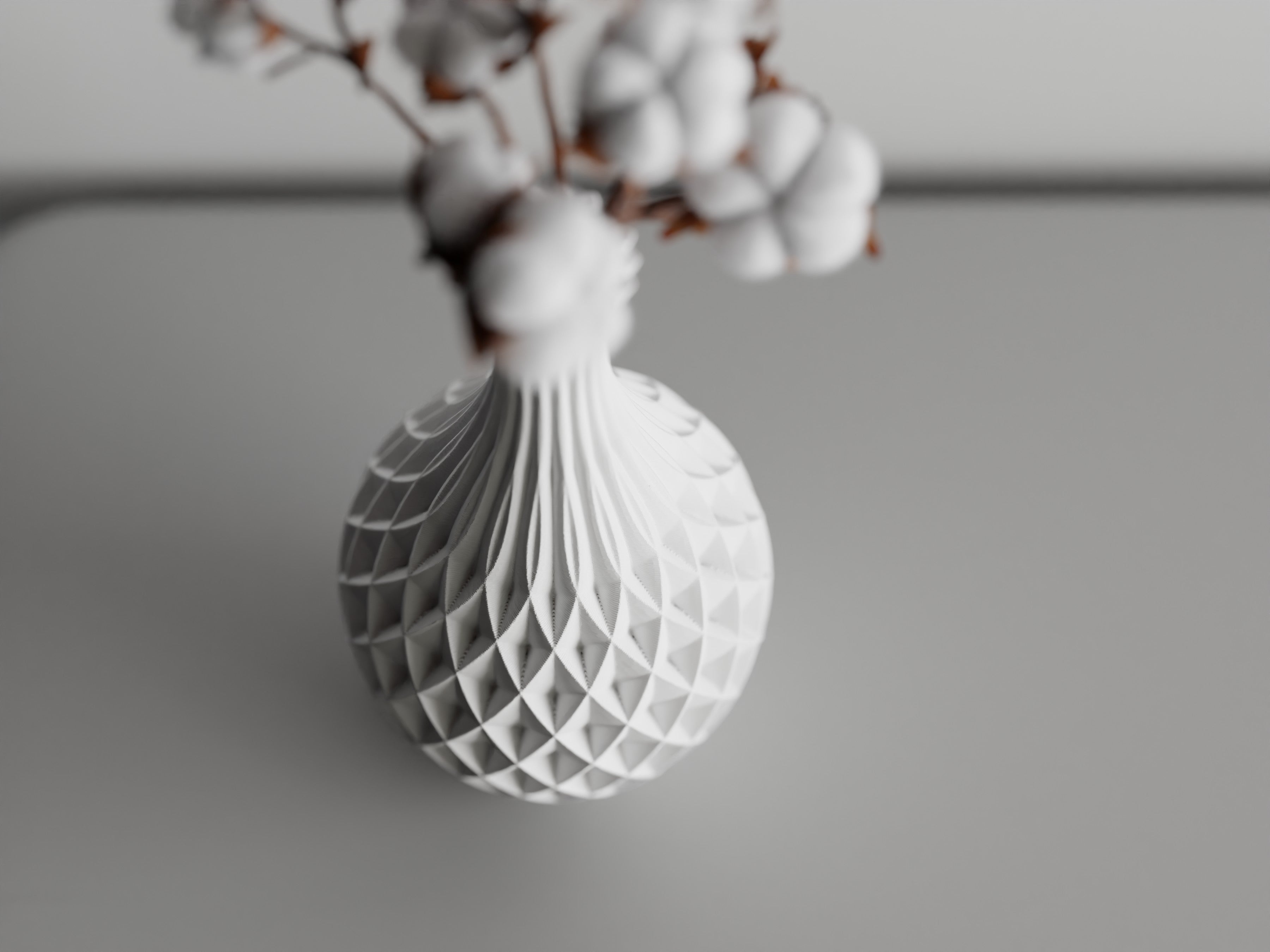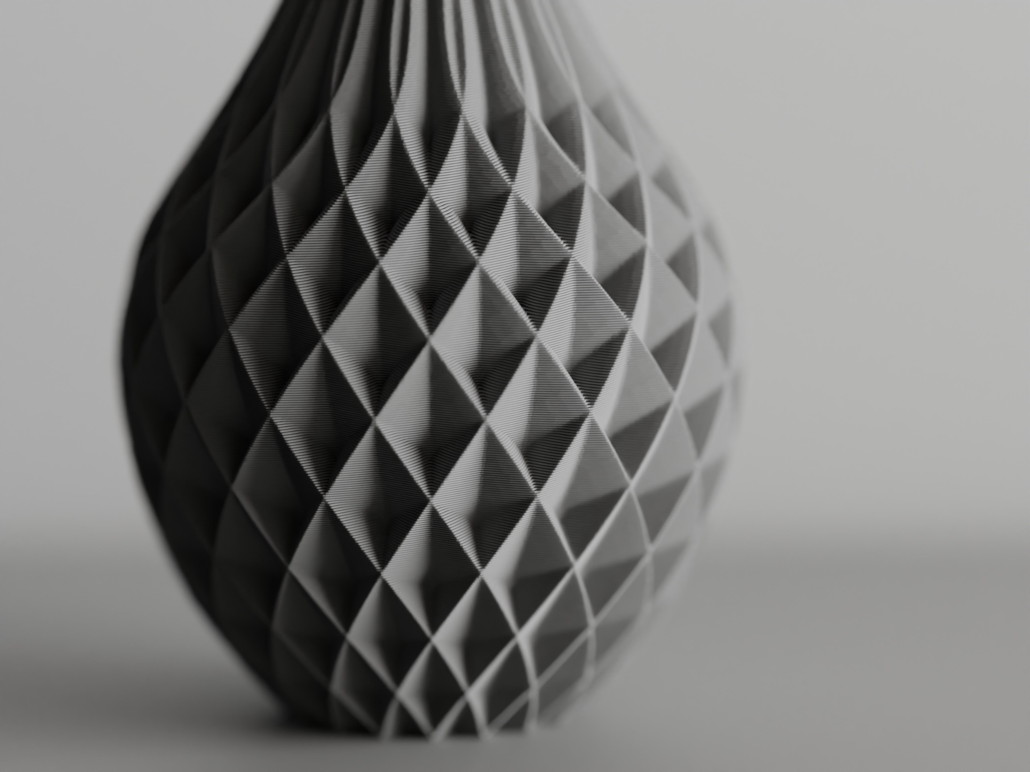 Elegante Vase mit weich taillierter Silhouette und diamantförmiger Facettenstruktur. Die Oberfläche fängt das Licht plastisch ein, der schmale Hals setzt einzelne Stiele und schlanke Bouquets präzise in Szene.