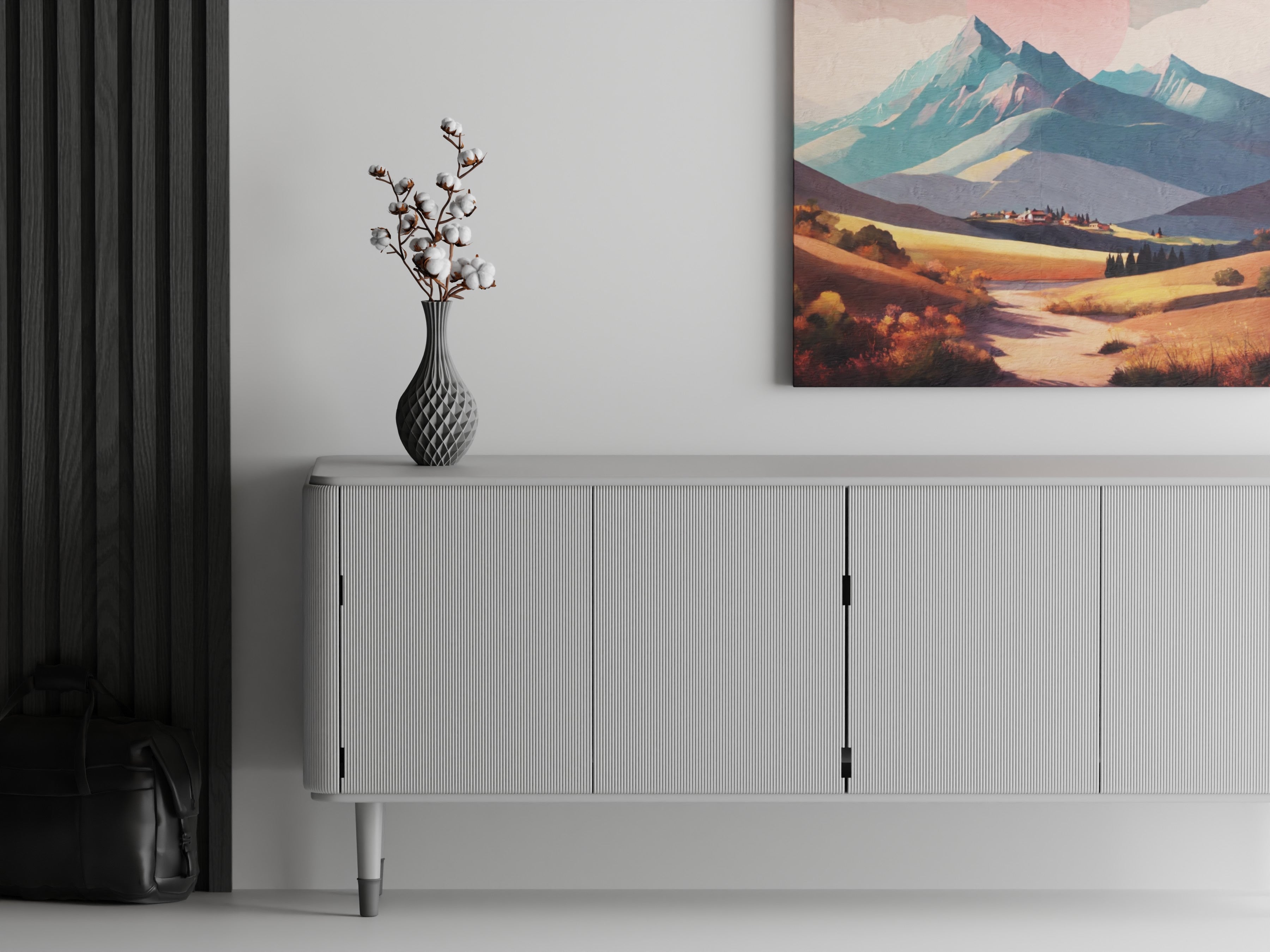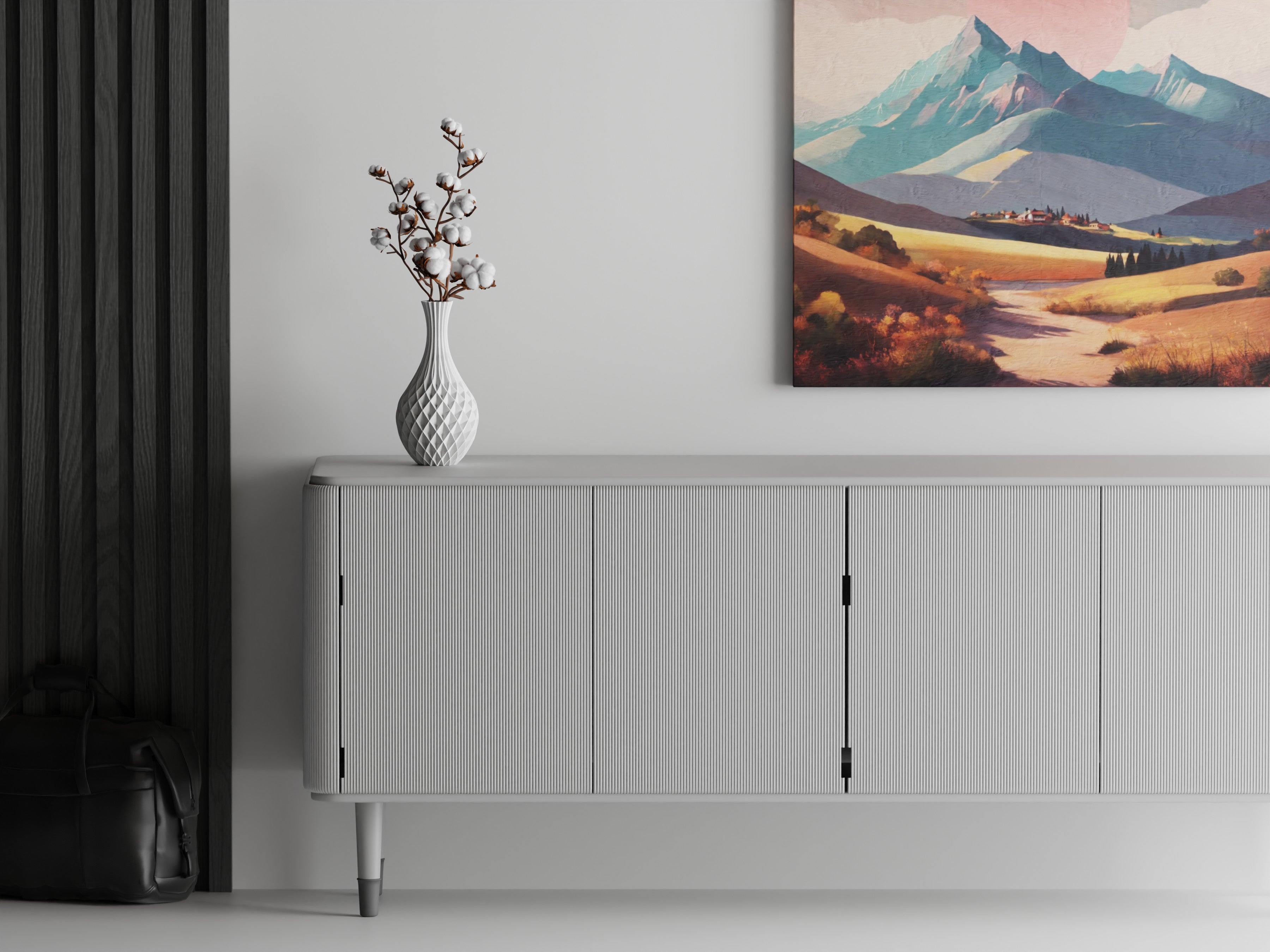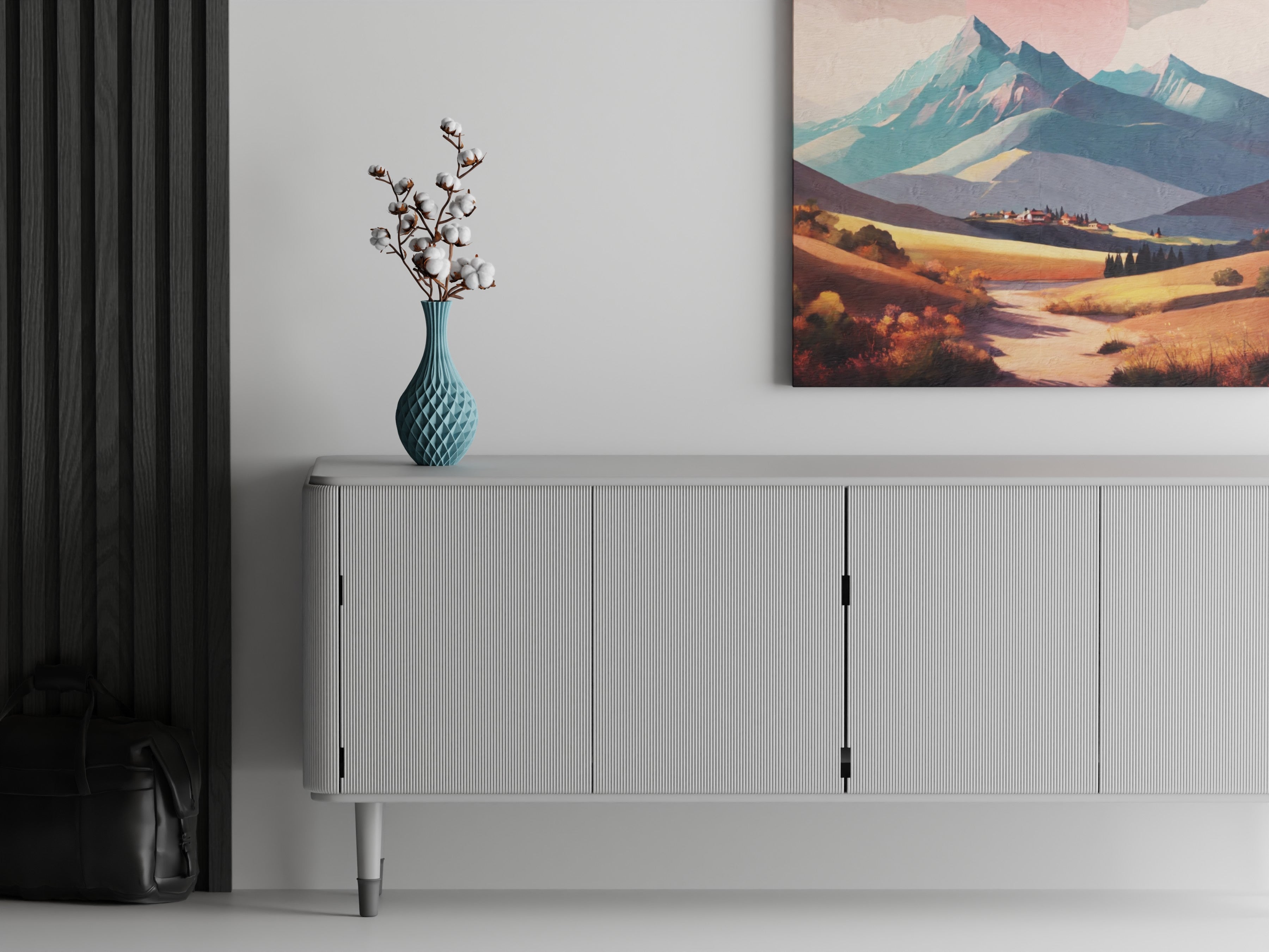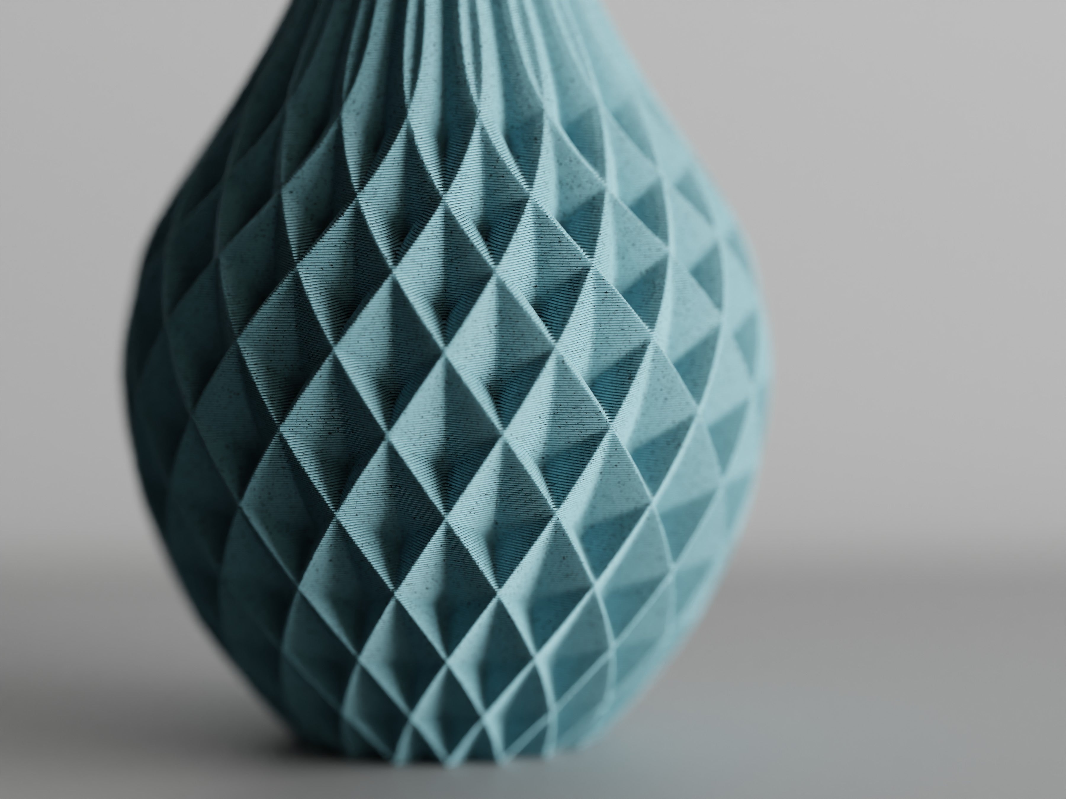 Elegante Vase mit weich taillierter Silhouette und diamantförmiger Facettenstruktur. Die Oberfläche fängt das Licht plastisch ein, der schmale Hals setzt einzelne Stiele und schlanke Bouquets präzise in Szene.