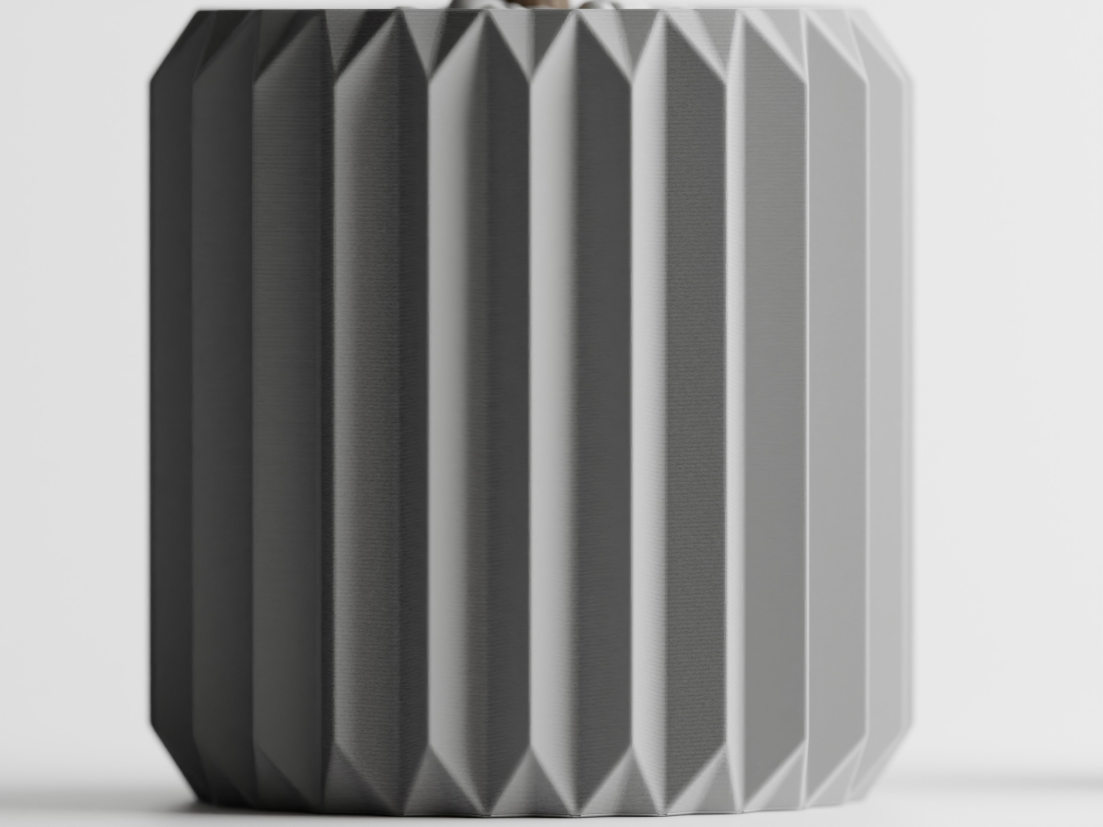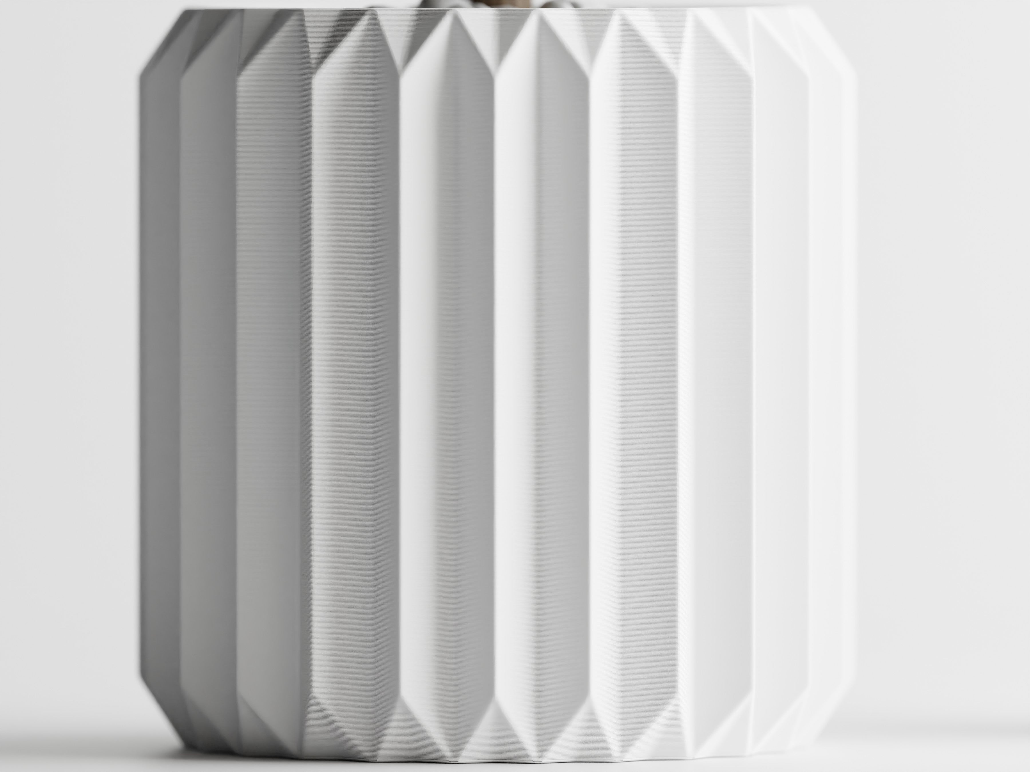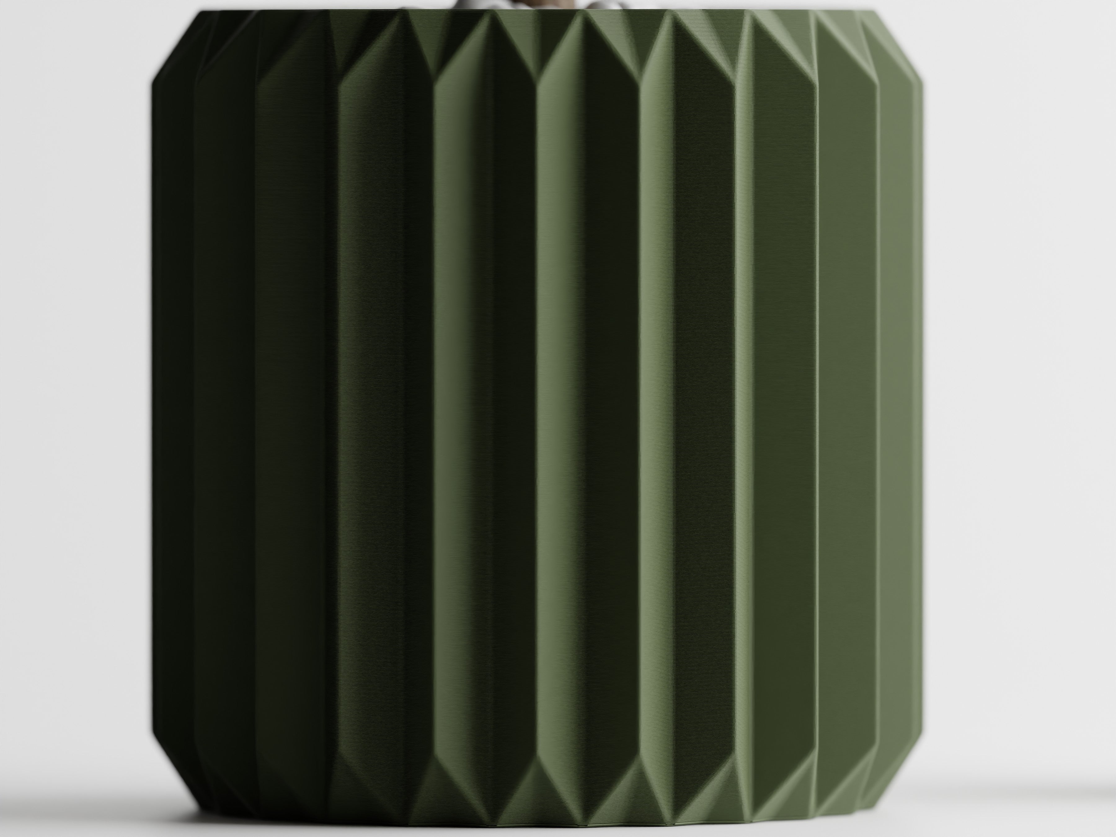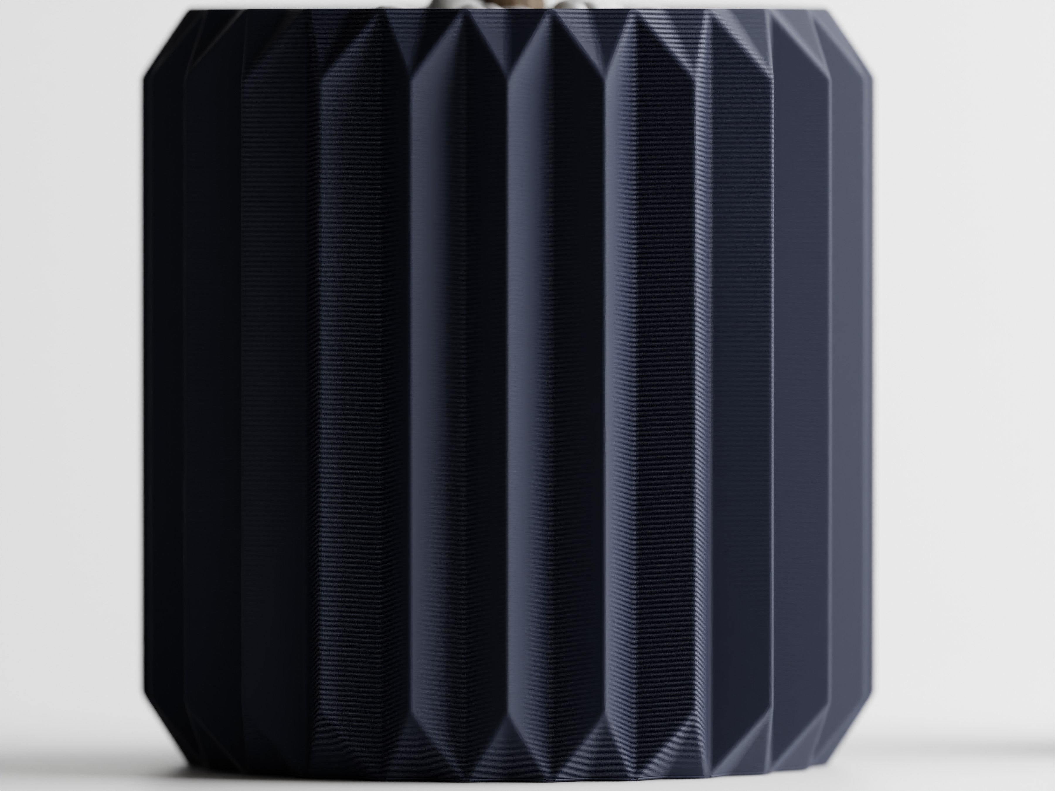 Zylindrischer Pflanztopf mit präzisen, vertikalen Facetten. Die polygonale Kontur erzeugt ein klares Licht-Schatten-Spiel, der Abschlussrand ist sauber definiert, die Proportionen wirken ruhig und ausgewogen. Ideal für Sukkulenten, Bonsai und kompakte Zimmerpflanzen.
