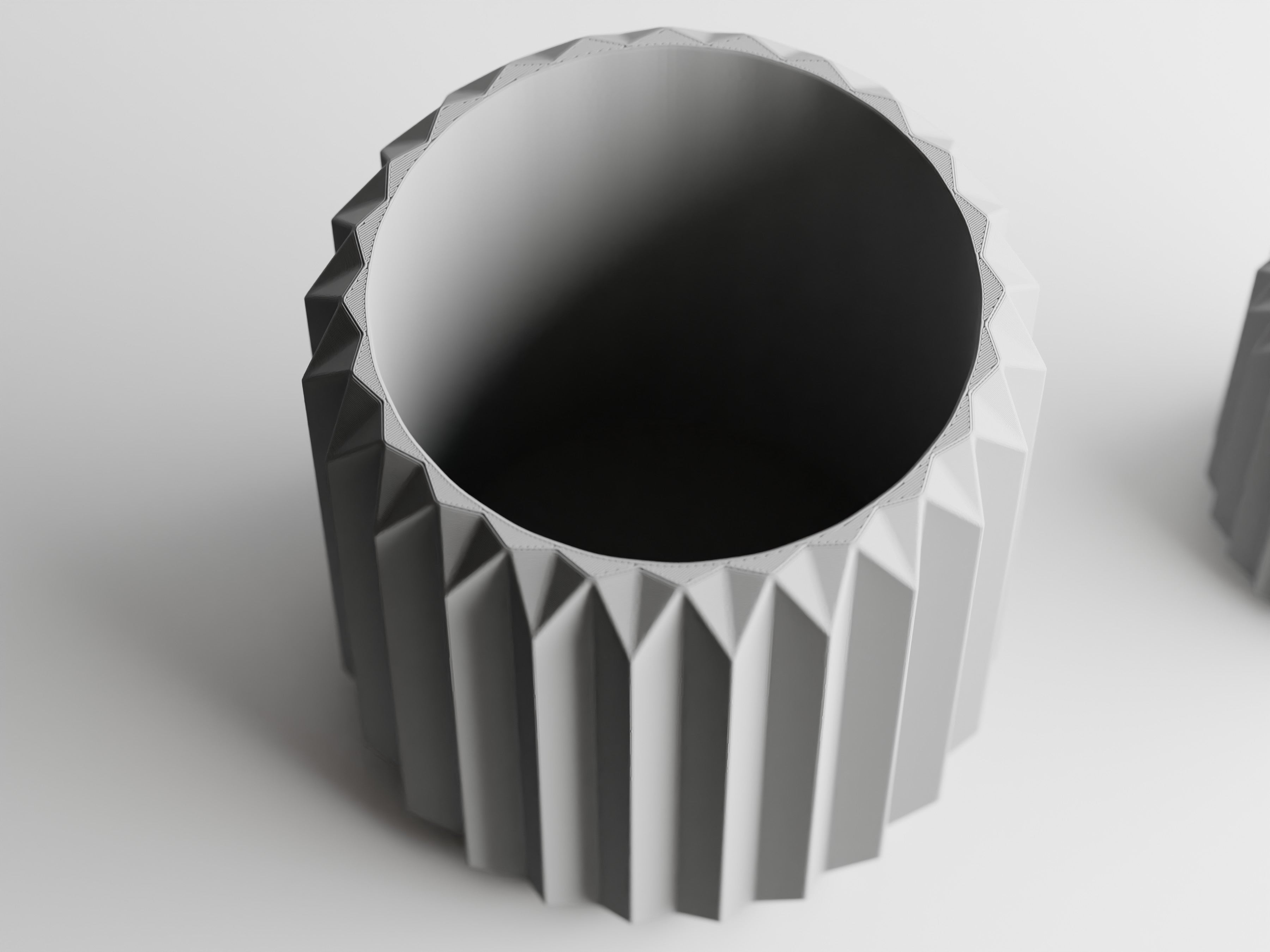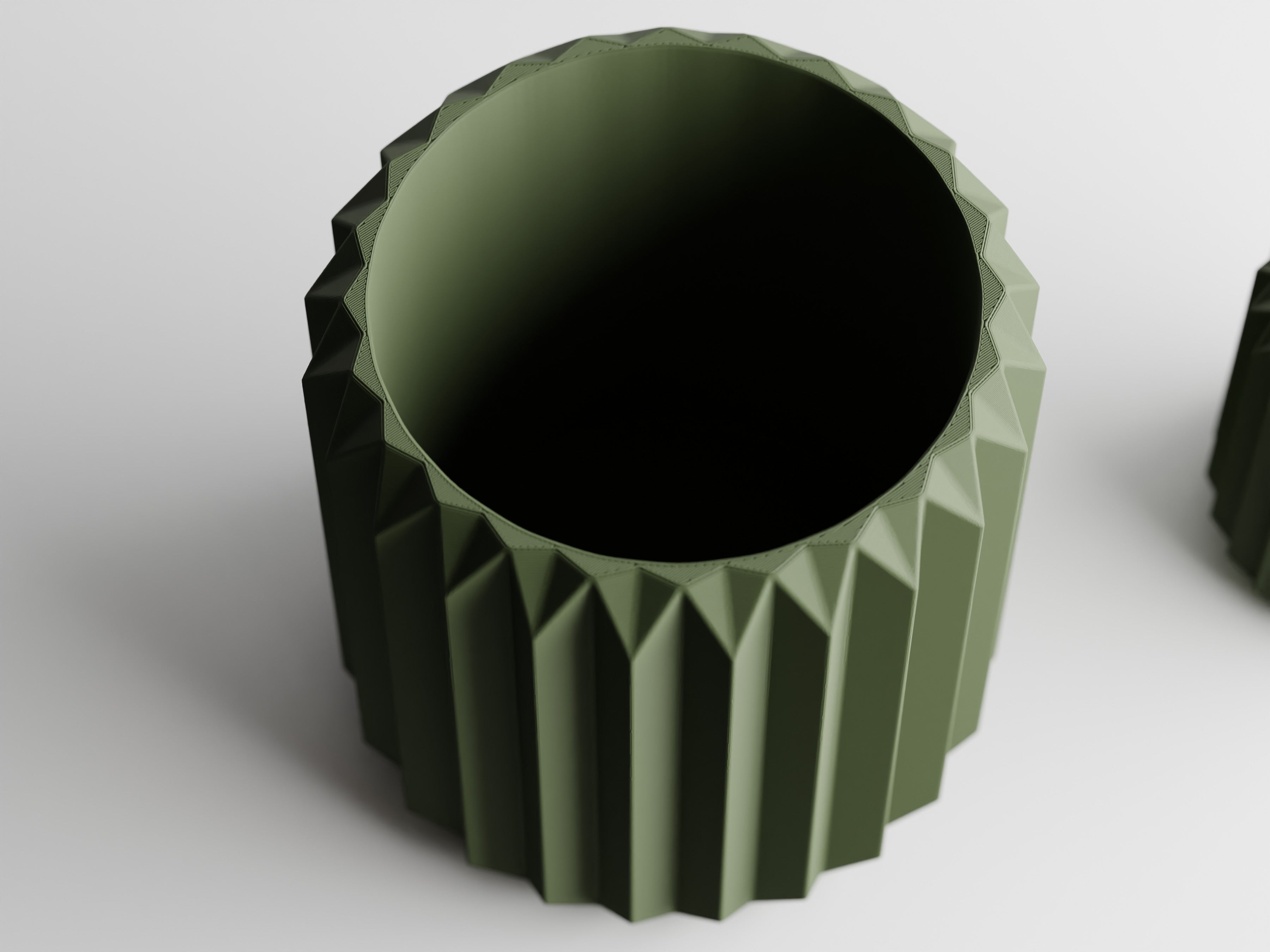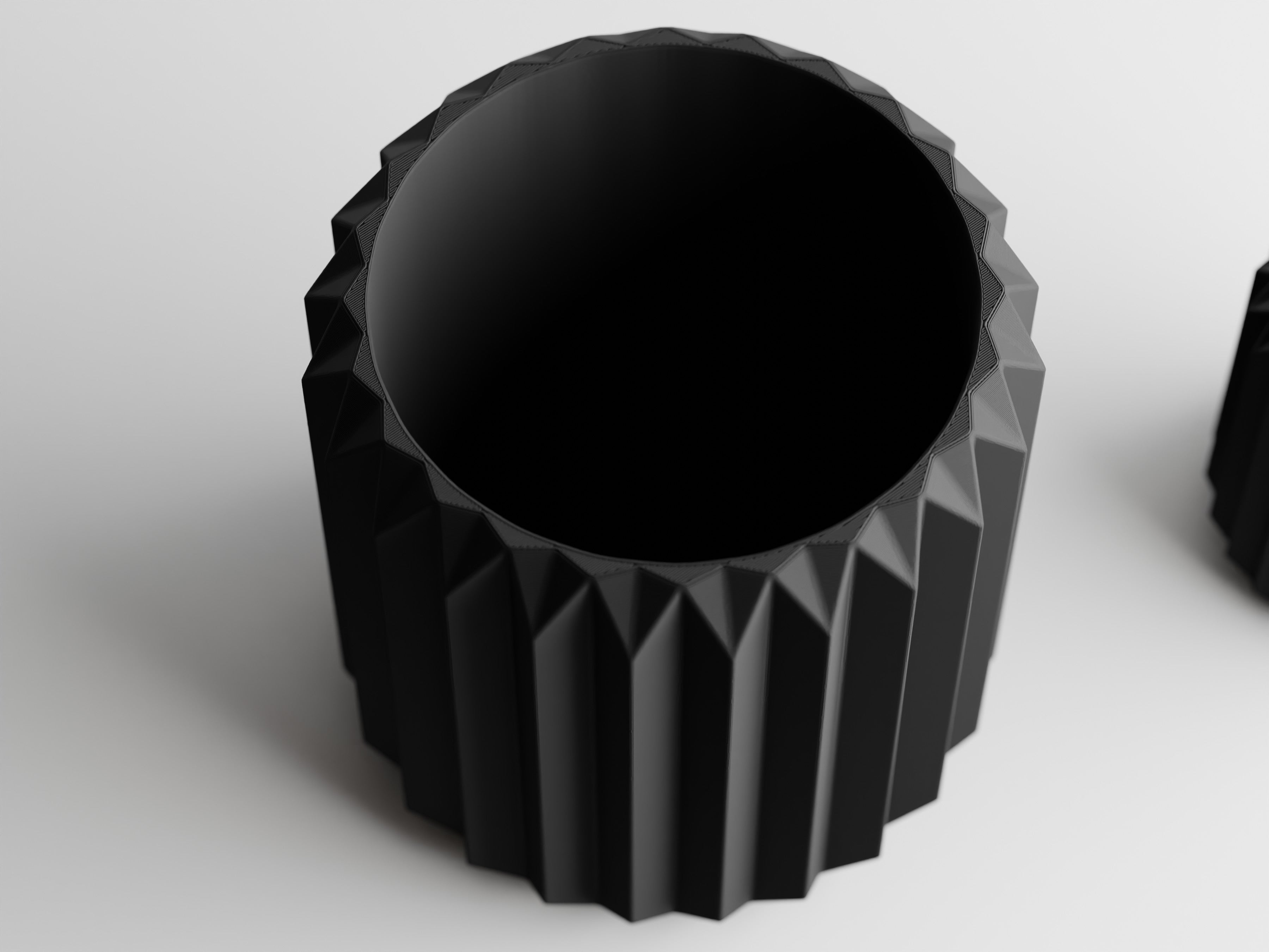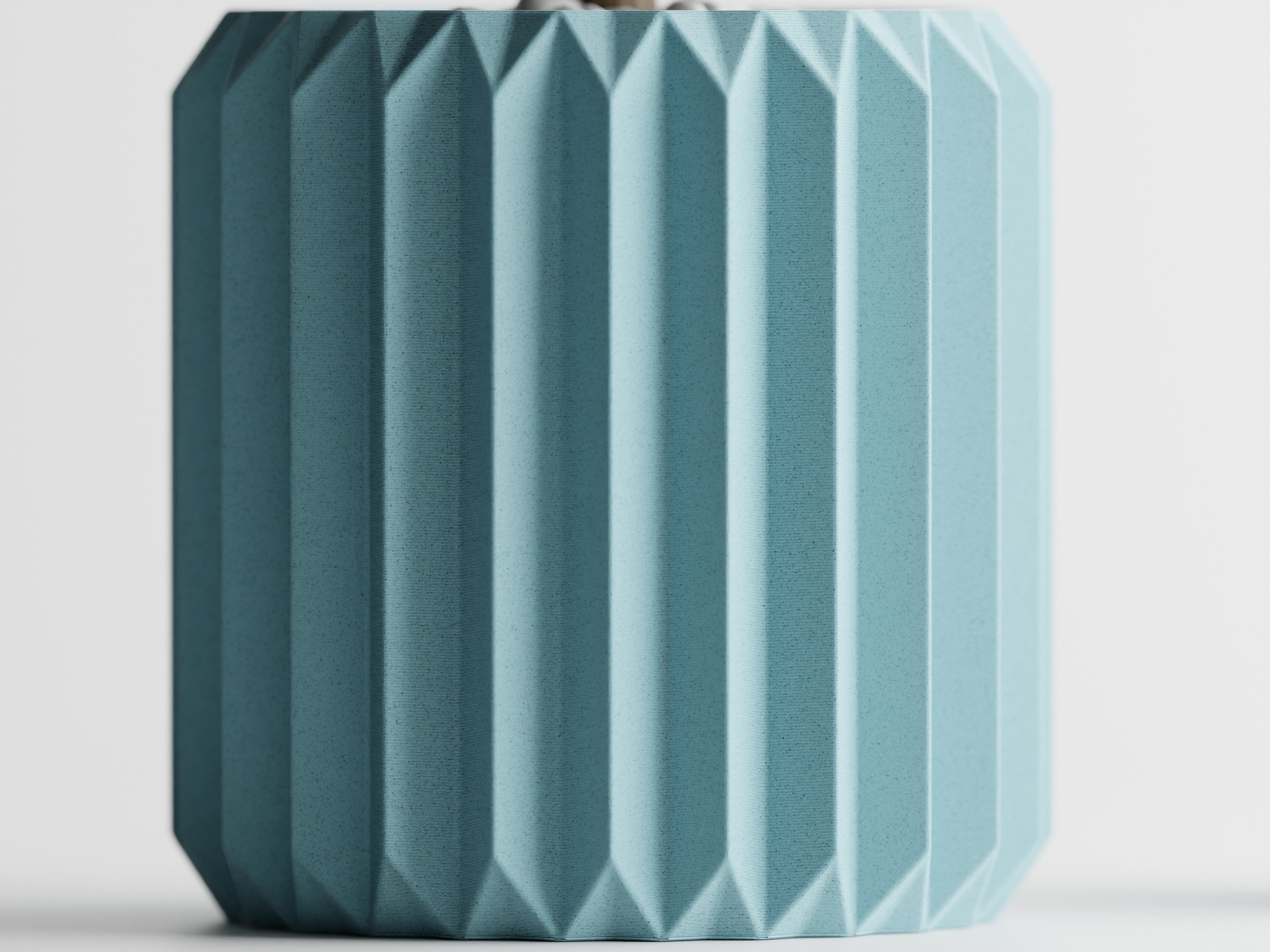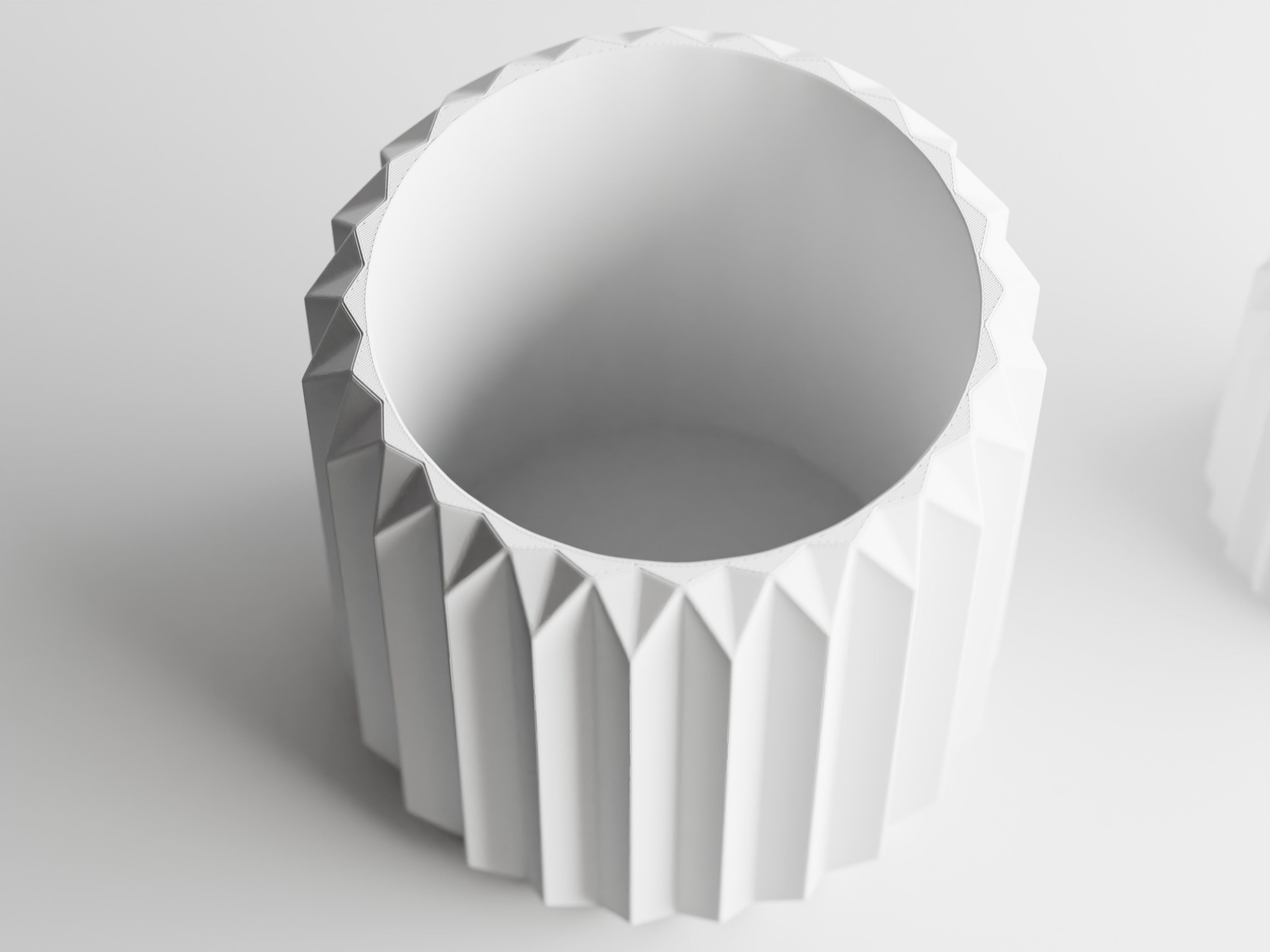 Zylindrischer Pflanztopf mit präzisen, vertikalen Facetten. Die polygonale Kontur erzeugt ein klares Licht-Schatten-Spiel, der Abschlussrand ist sauber definiert, die Proportionen wirken ruhig und ausgewogen. Ideal für Sukkulenten, Bonsai und kompakte Zimmerpflanzen.