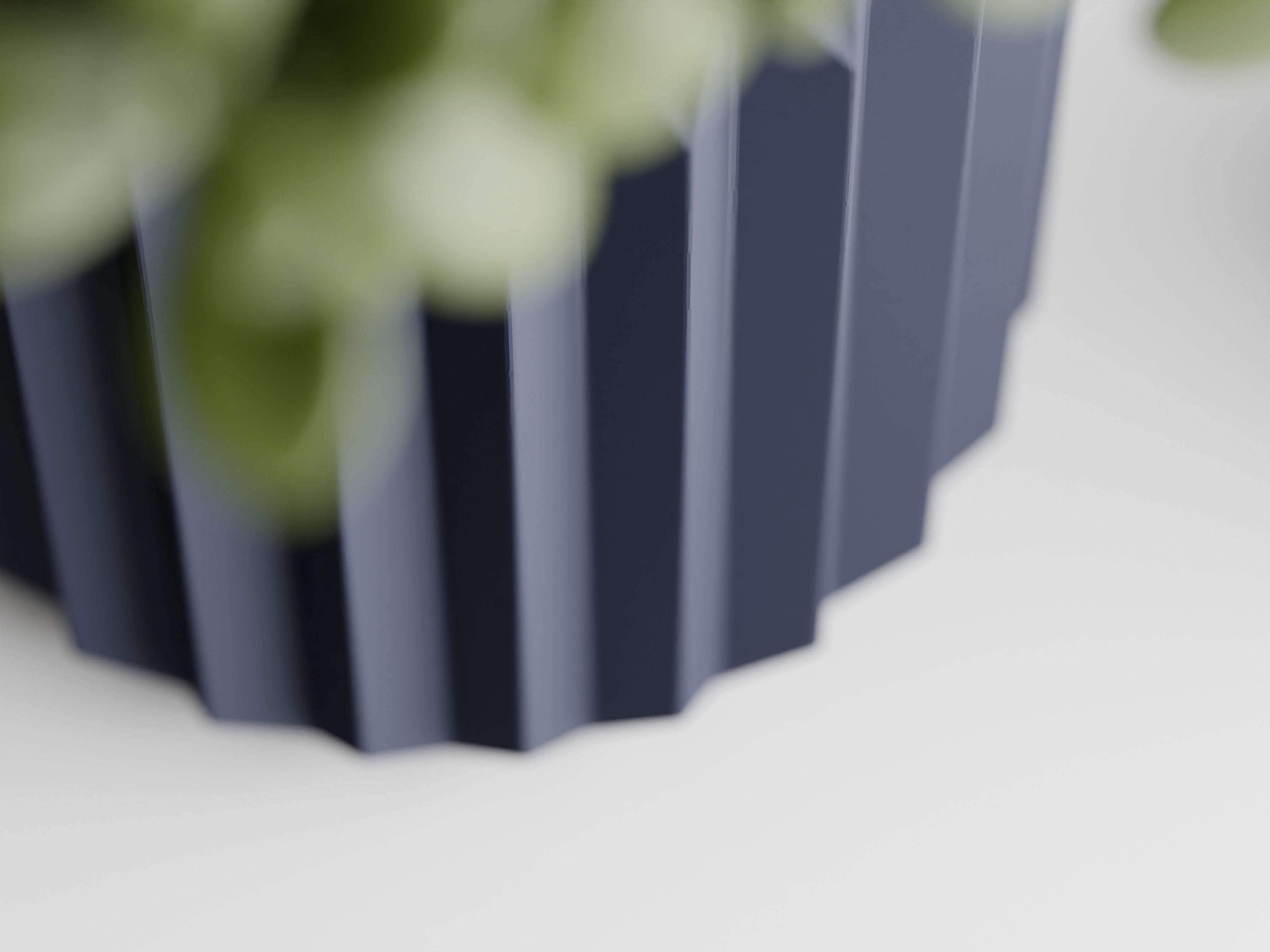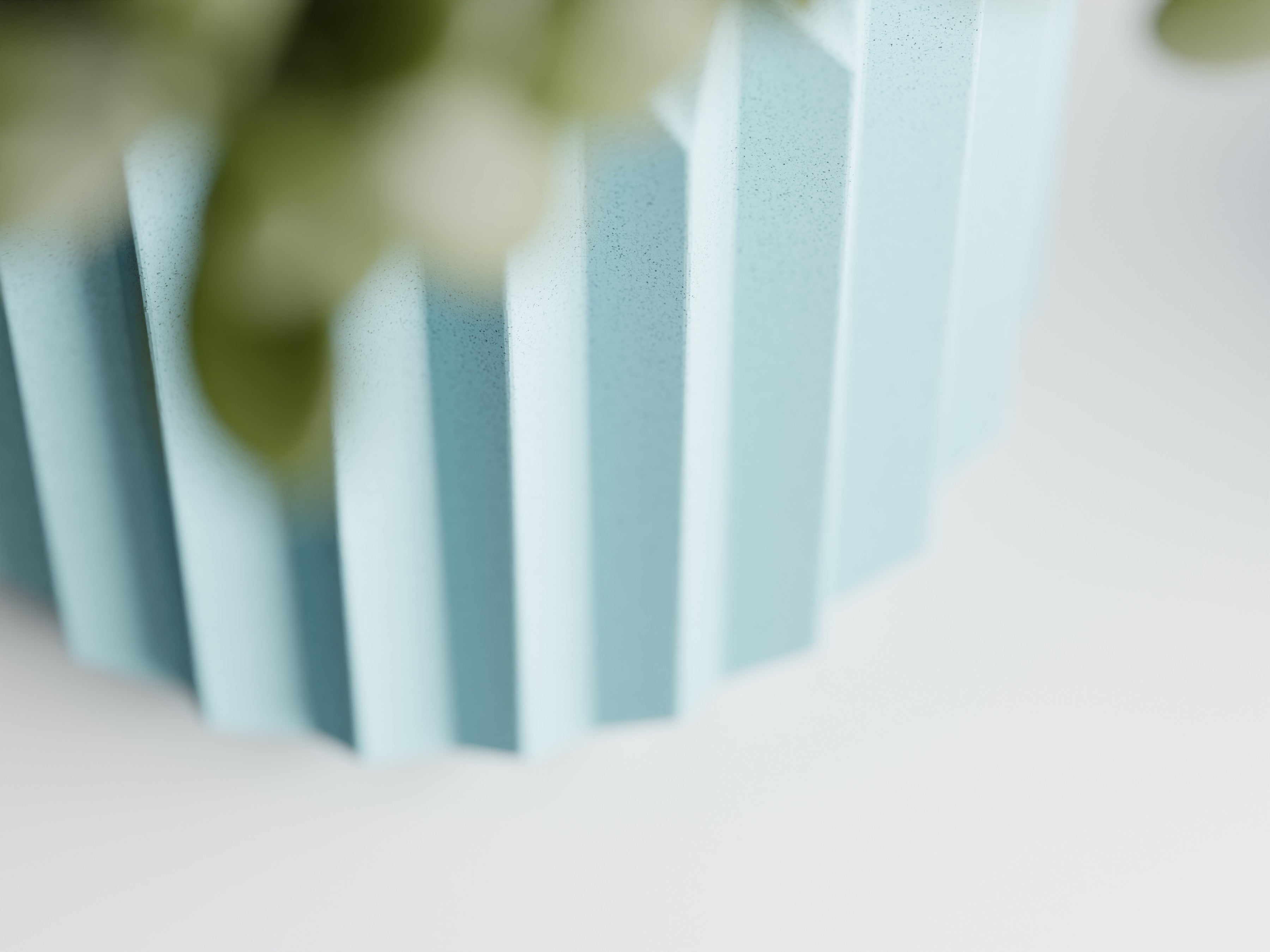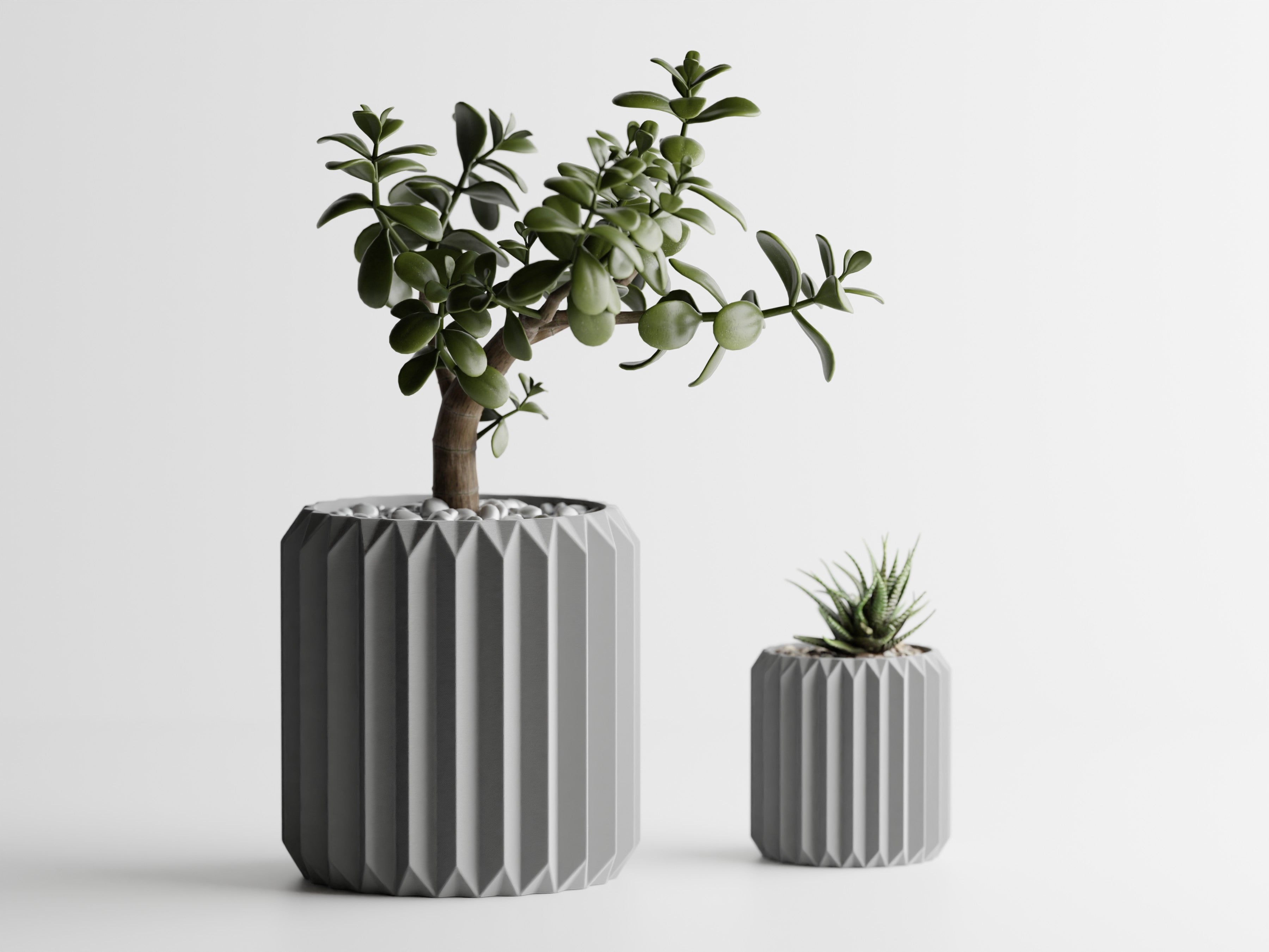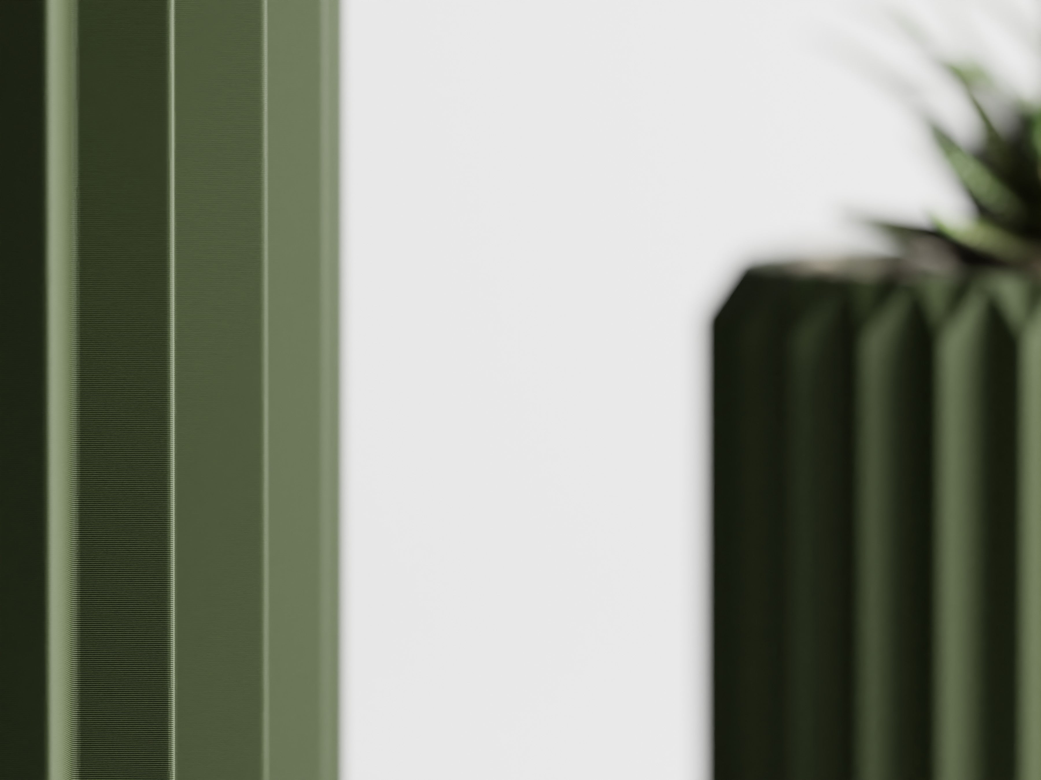 Zylindrischer Pflanztopf mit präzisen, vertikalen Facetten. Die polygonale Kontur erzeugt ein klares Licht-Schatten-Spiel, der Abschlussrand ist sauber definiert, die Proportionen wirken ruhig und ausgewogen. Ideal für Sukkulenten, Bonsai und kompakte Zimmerpflanzen.