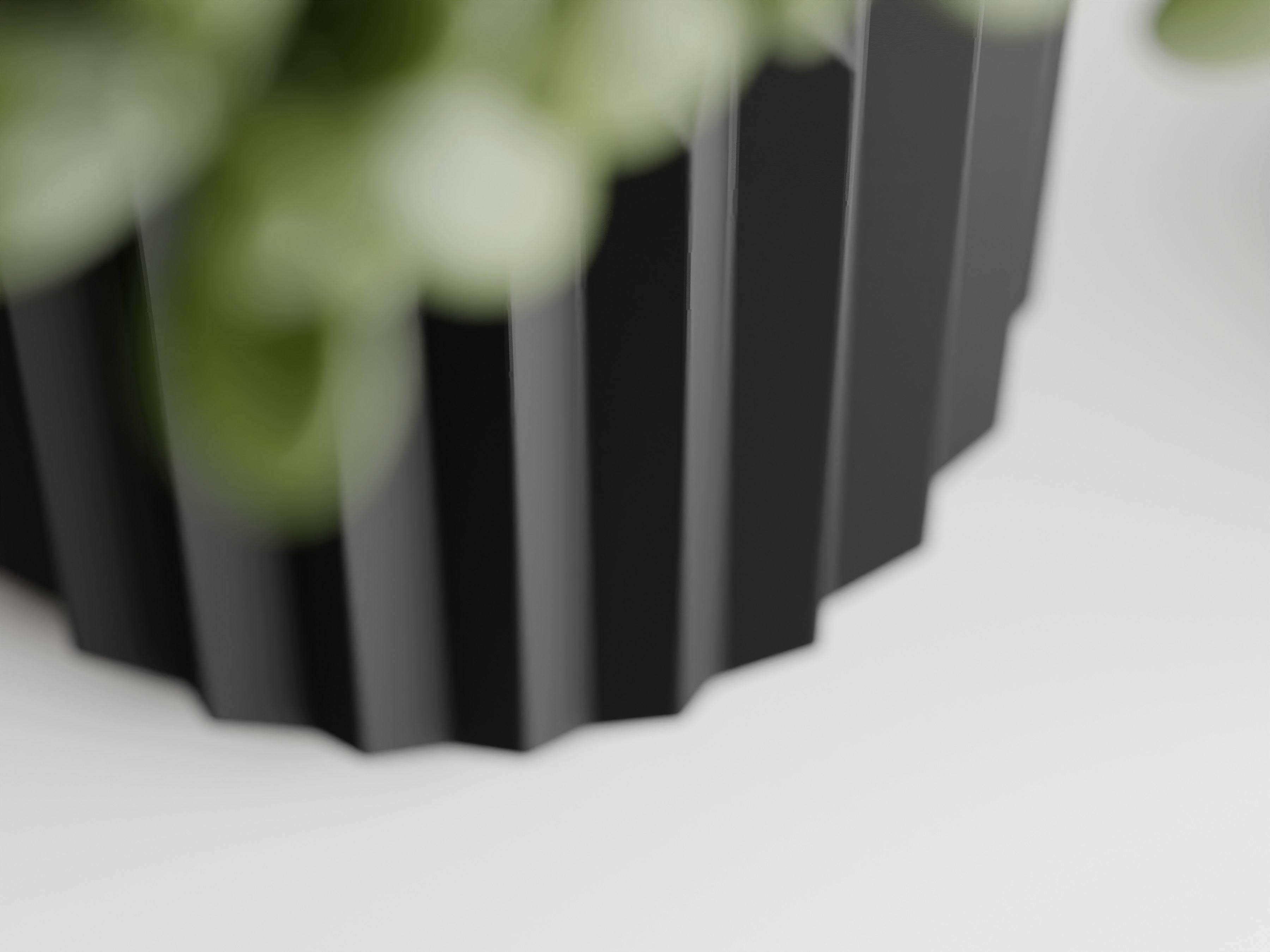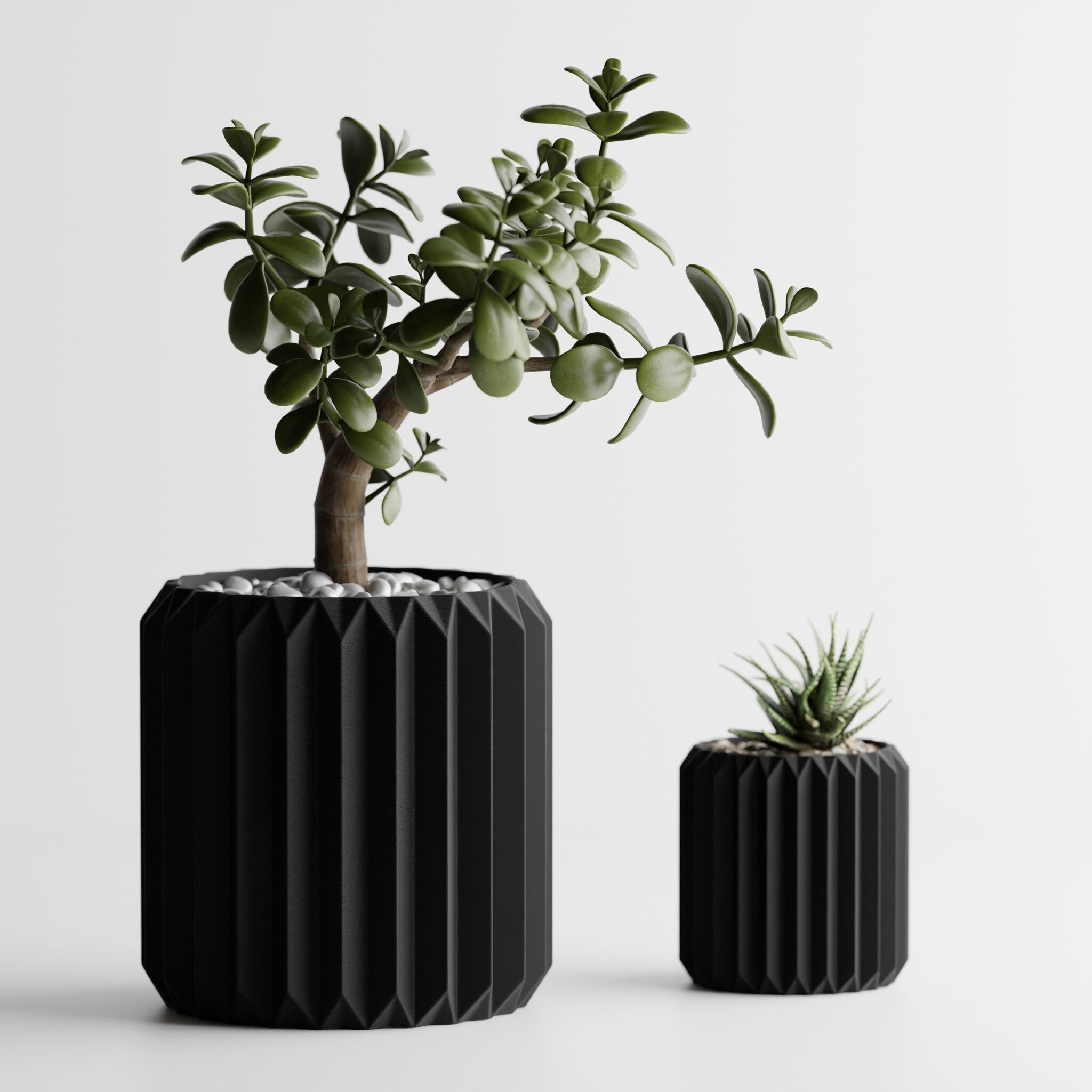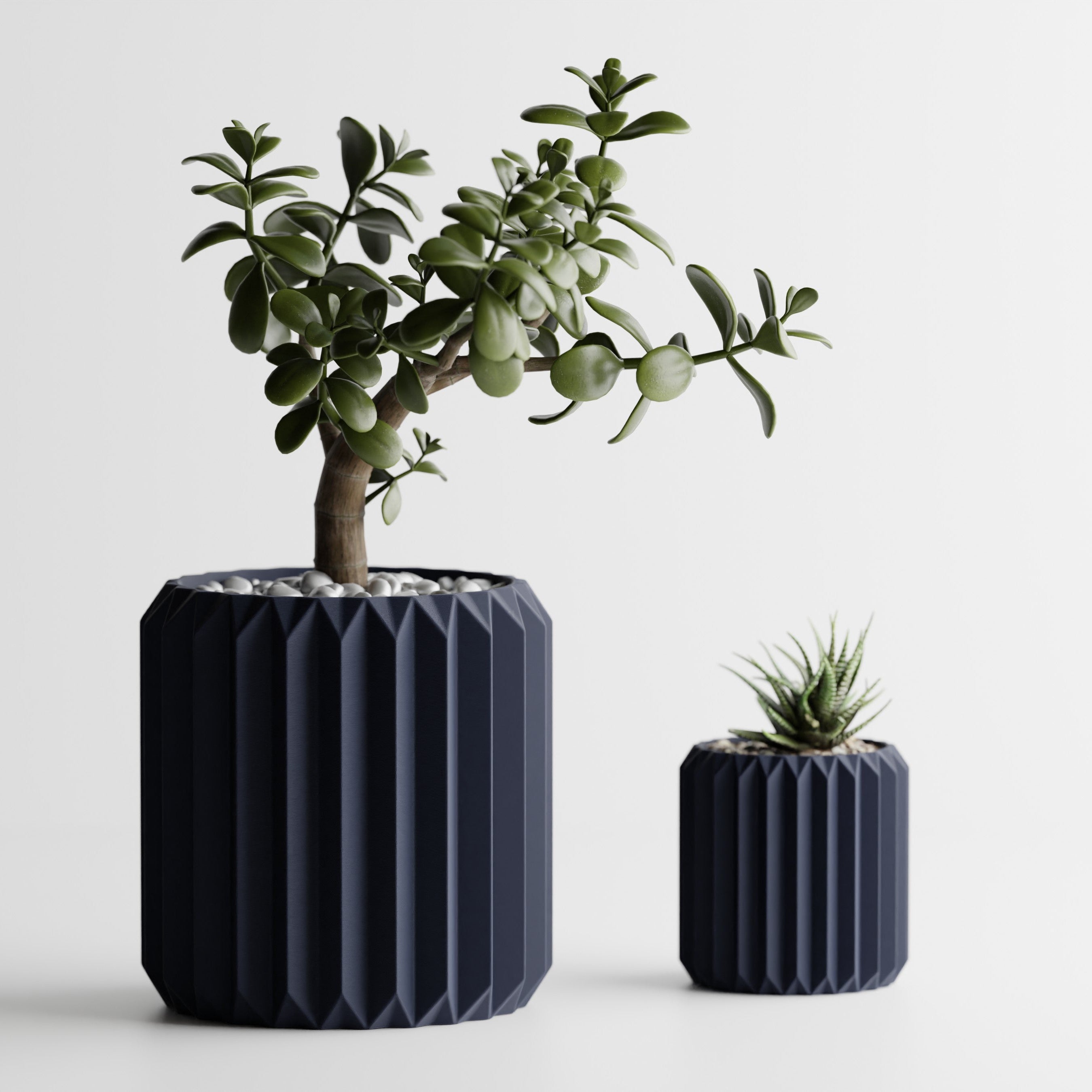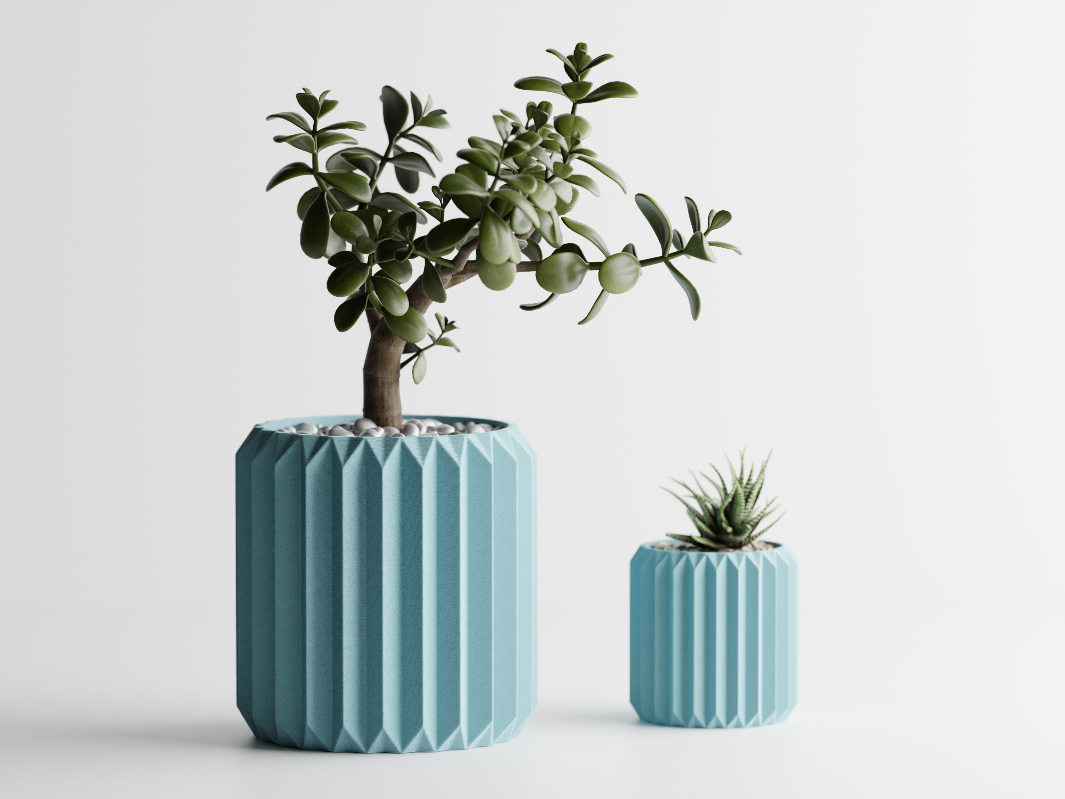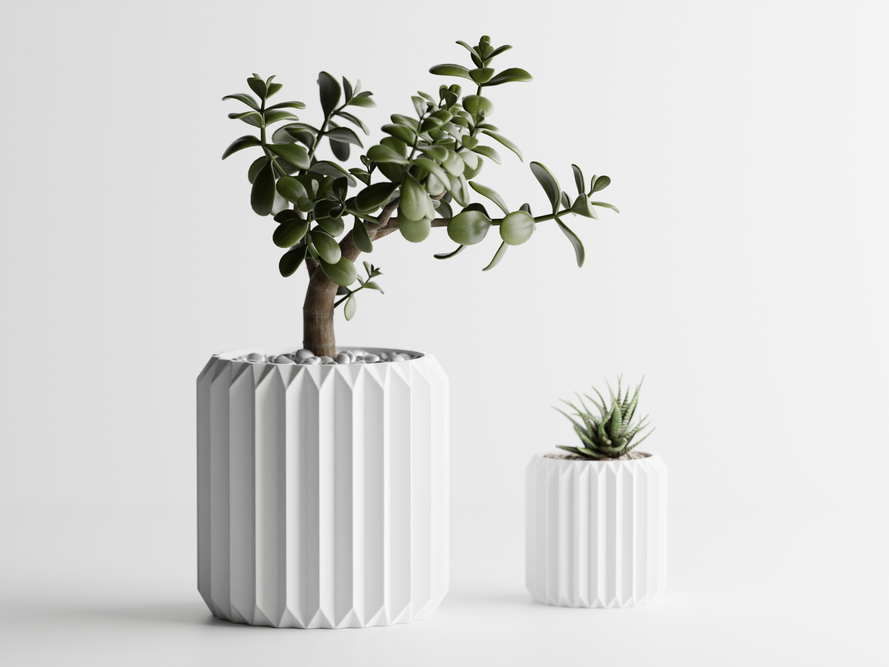 Zylindrischer Pflanztopf mit präzisen, vertikalen Facetten. Die polygonale Kontur erzeugt ein klares Licht-Schatten-Spiel, der Abschlussrand ist sauber definiert, die Proportionen wirken ruhig und ausgewogen. Ideal für Sukkulenten, Bonsai und kompakte Zimmerpflanzen.