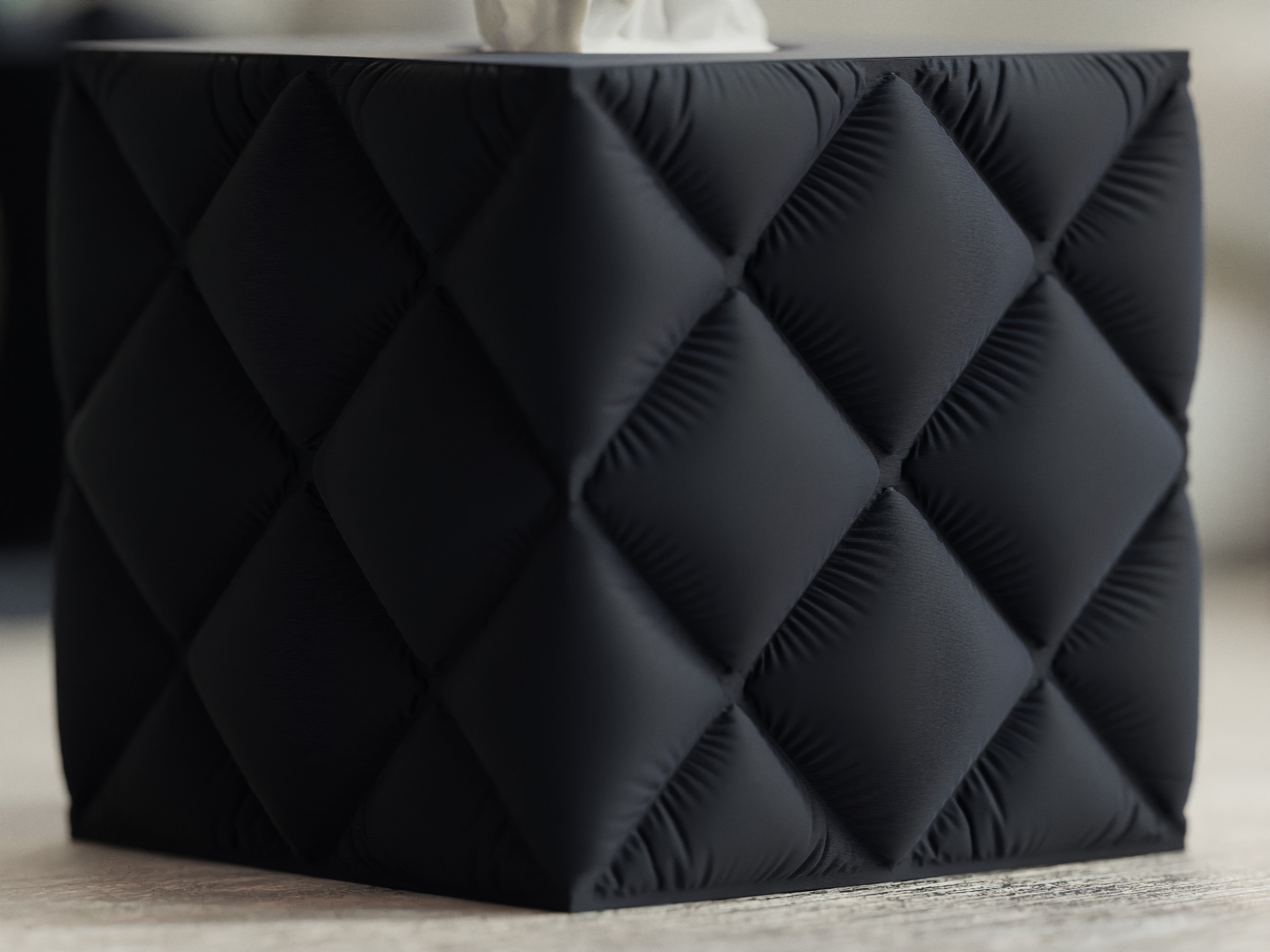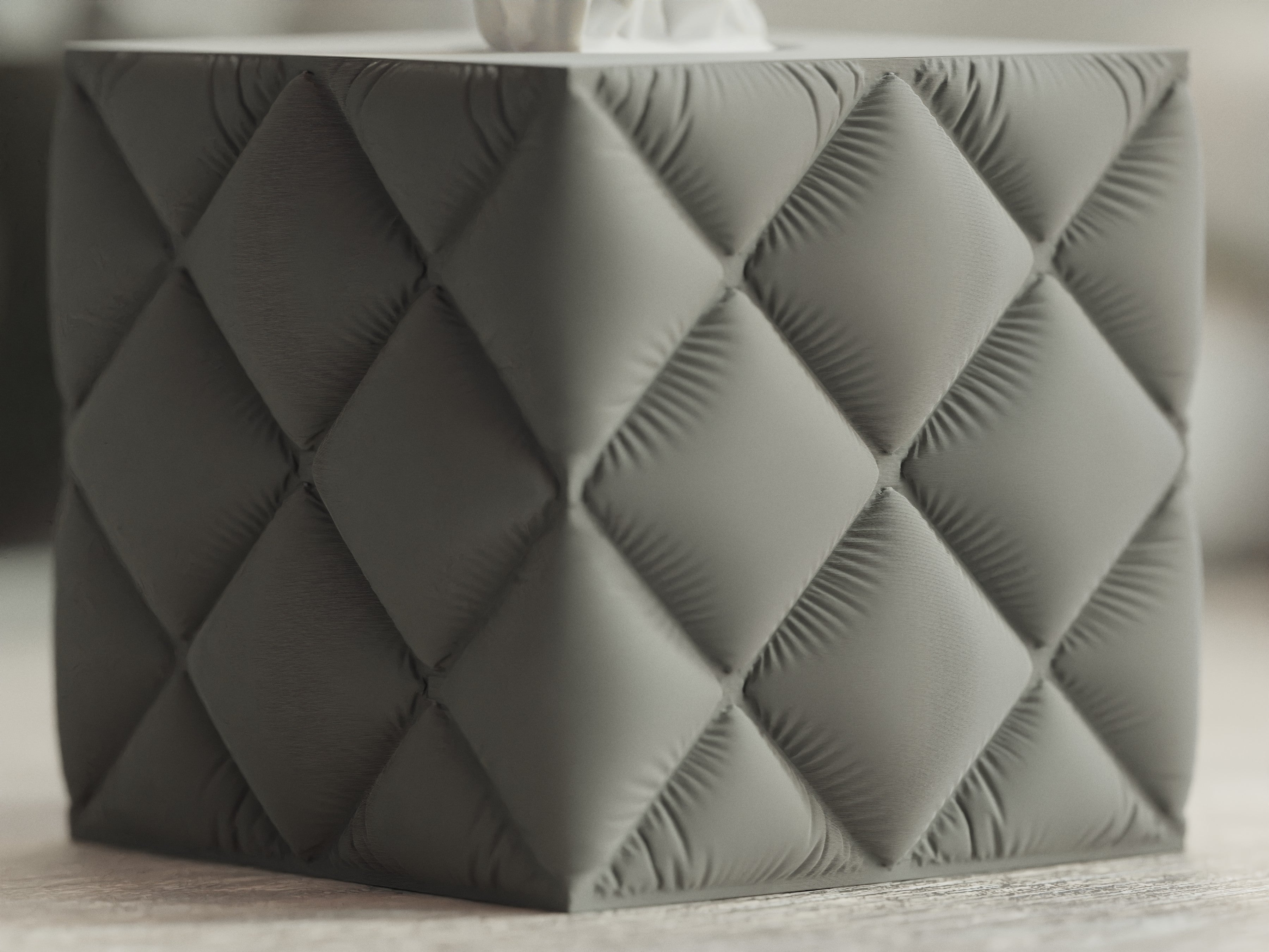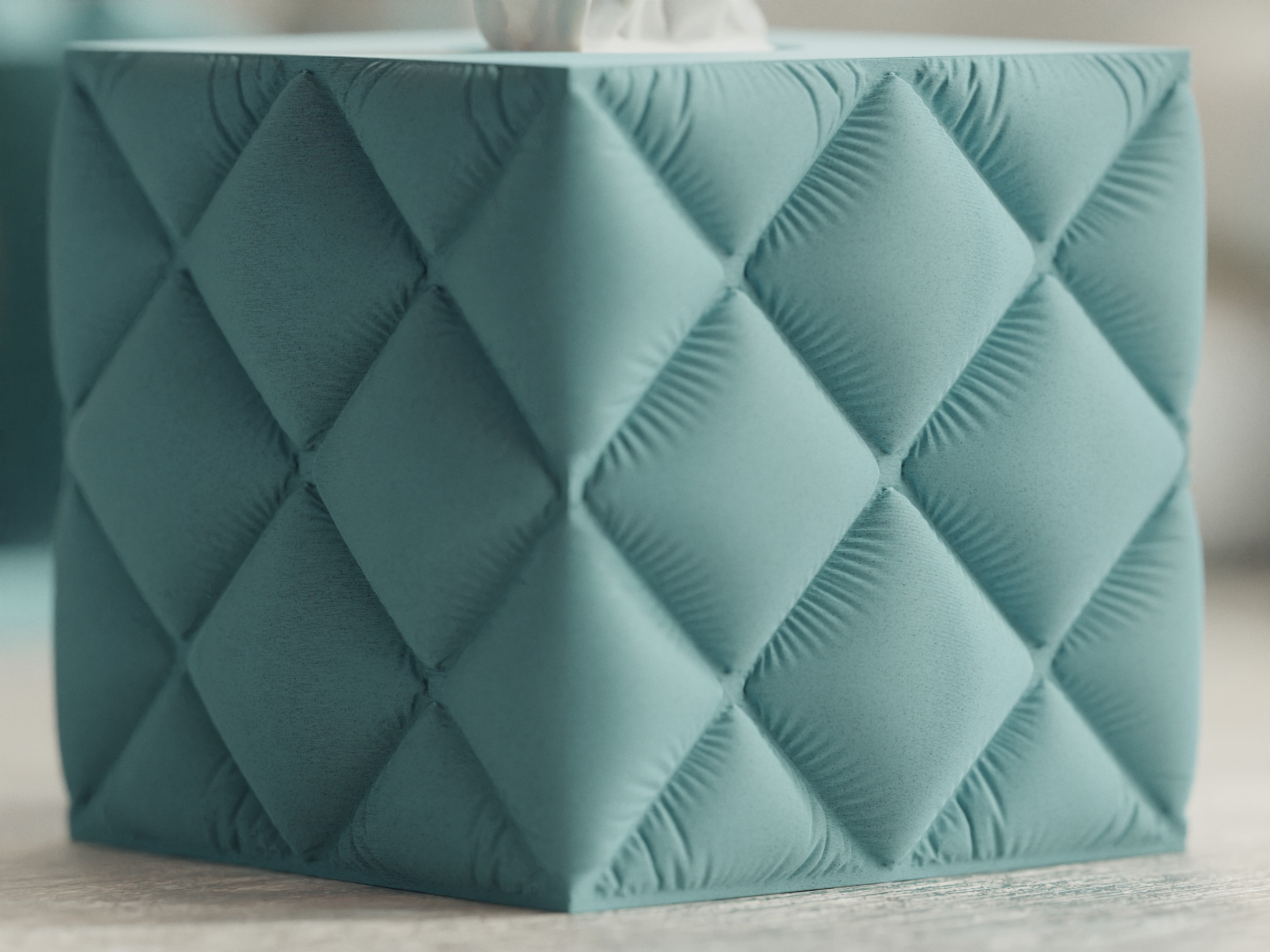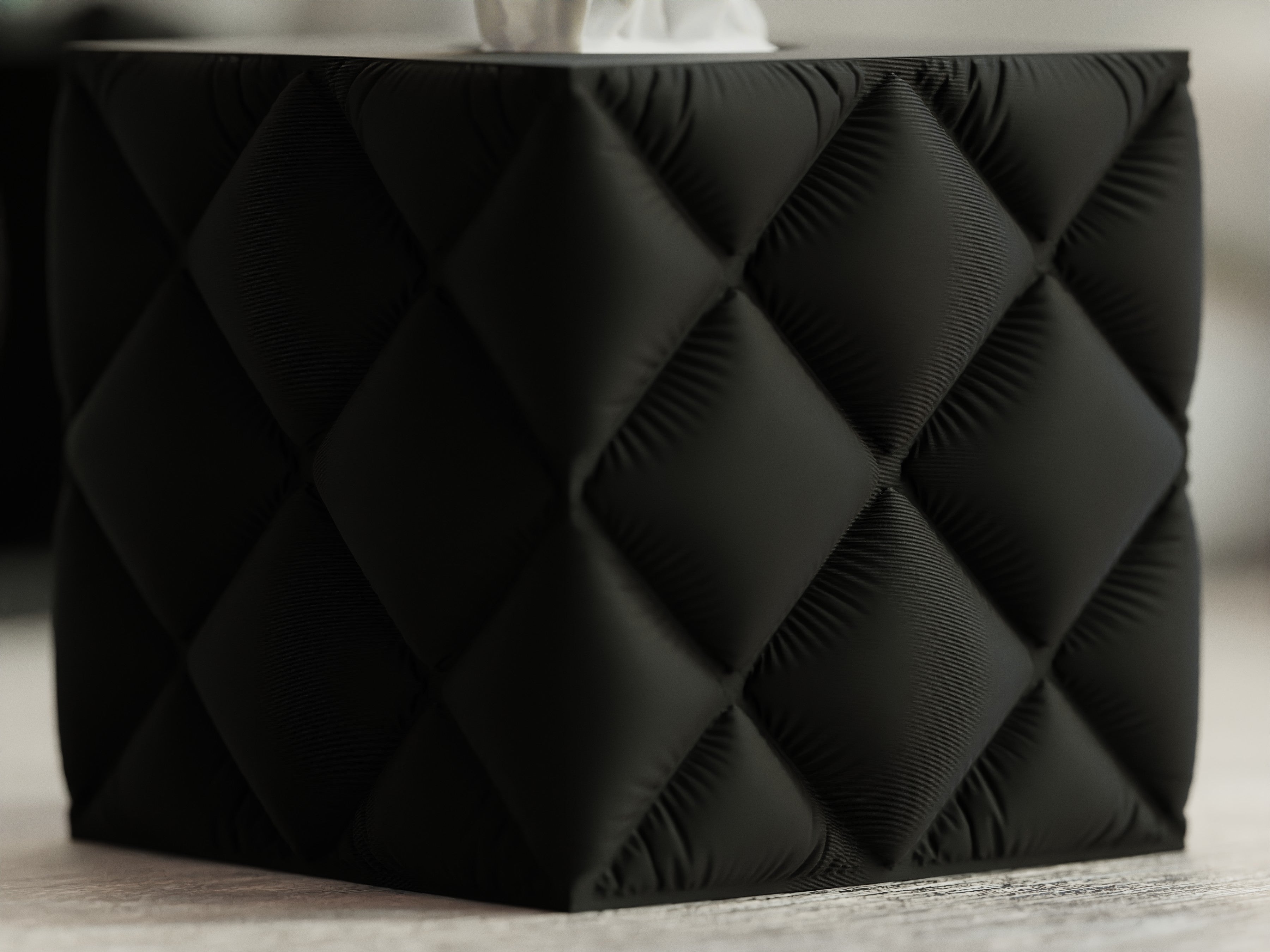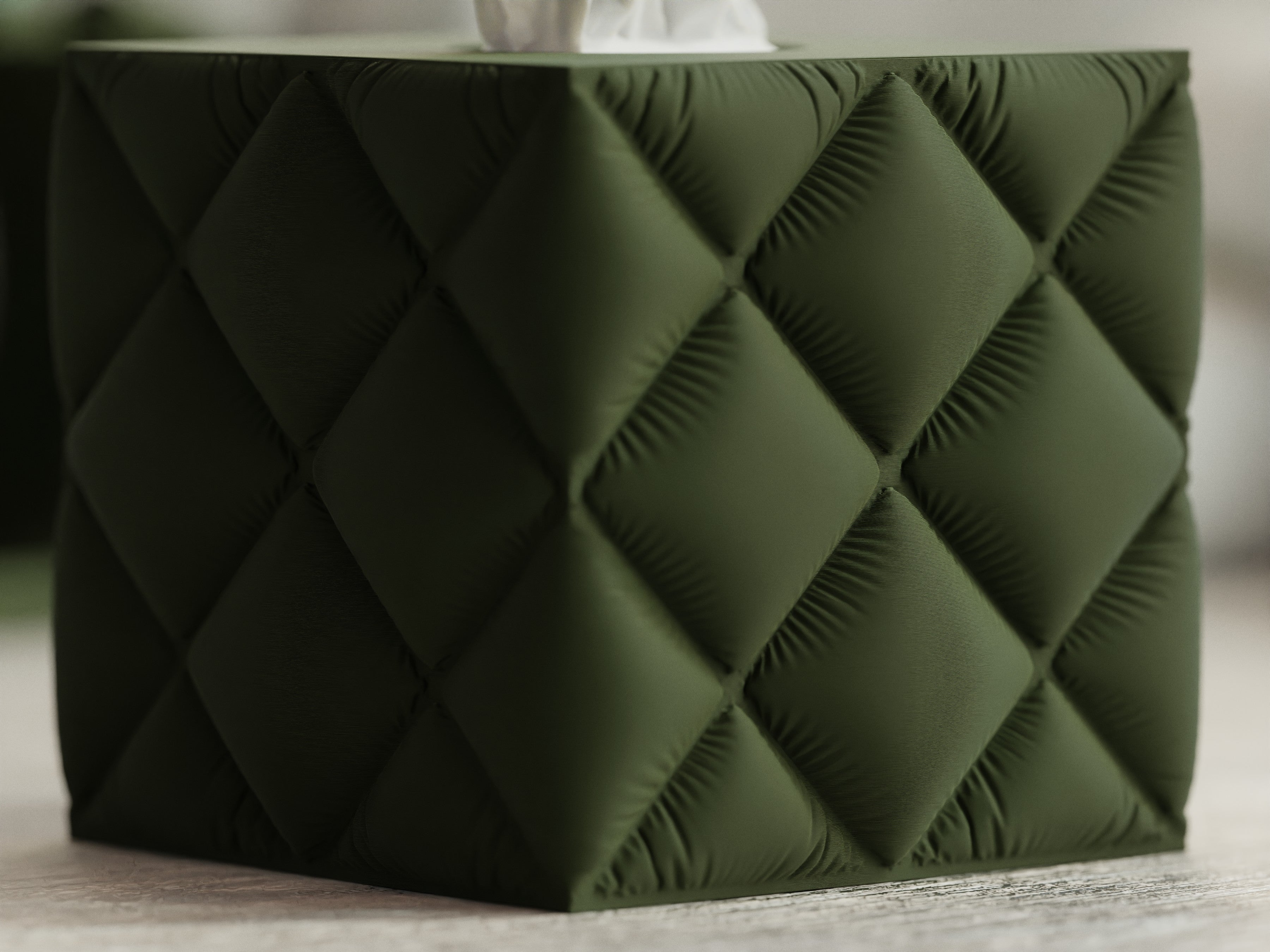 Quadratische Taschentuchbox in gepolsterter Rautenstruktur. Der soft wirkende Korpus trifft auf klare Kanten und einen flachen Deckel mit mittiger Auszugöffnung. Harmoniert mit Bad-Accessoires und Desk-Setup, wirkt ruhig und hochwertig.