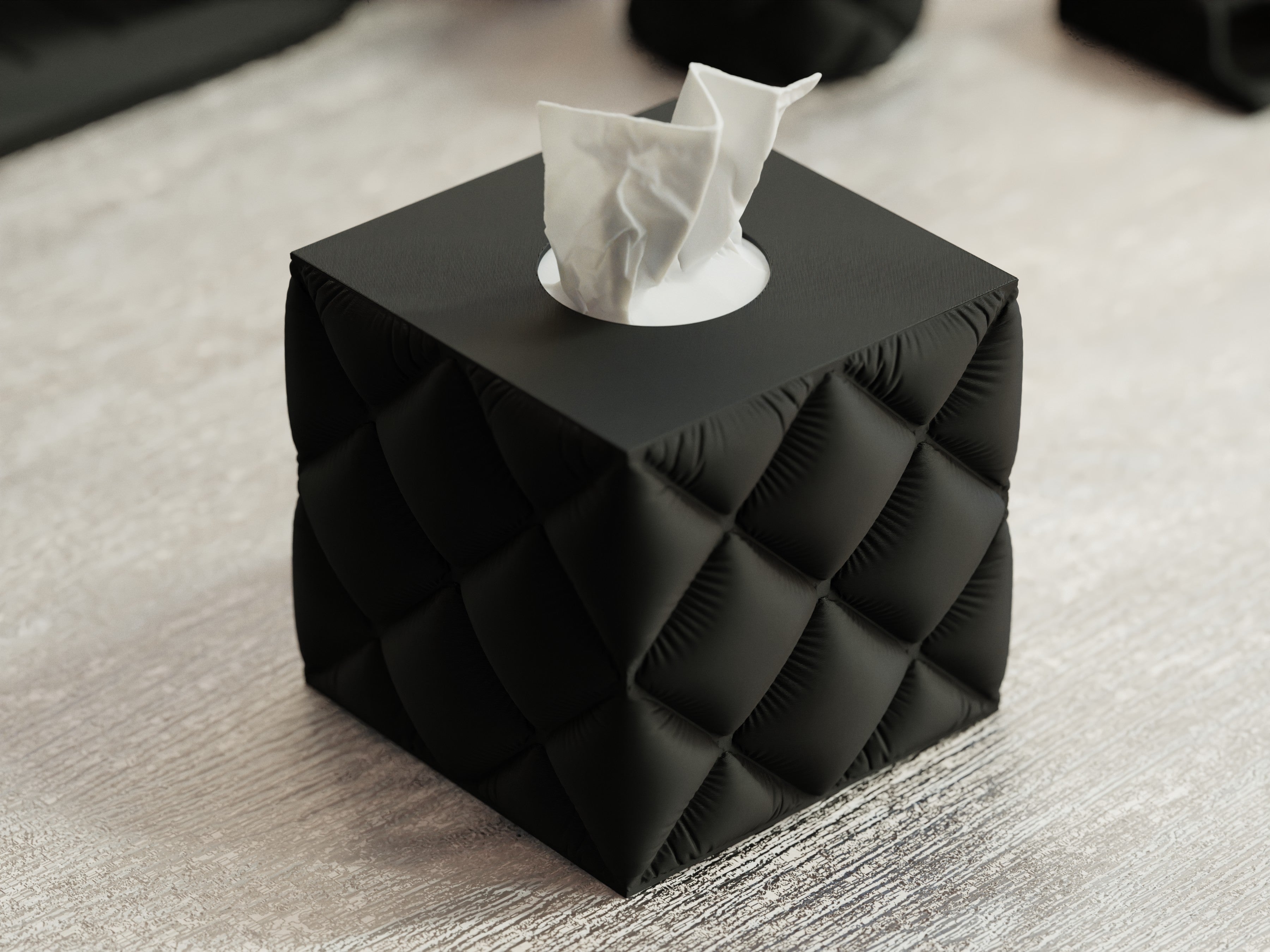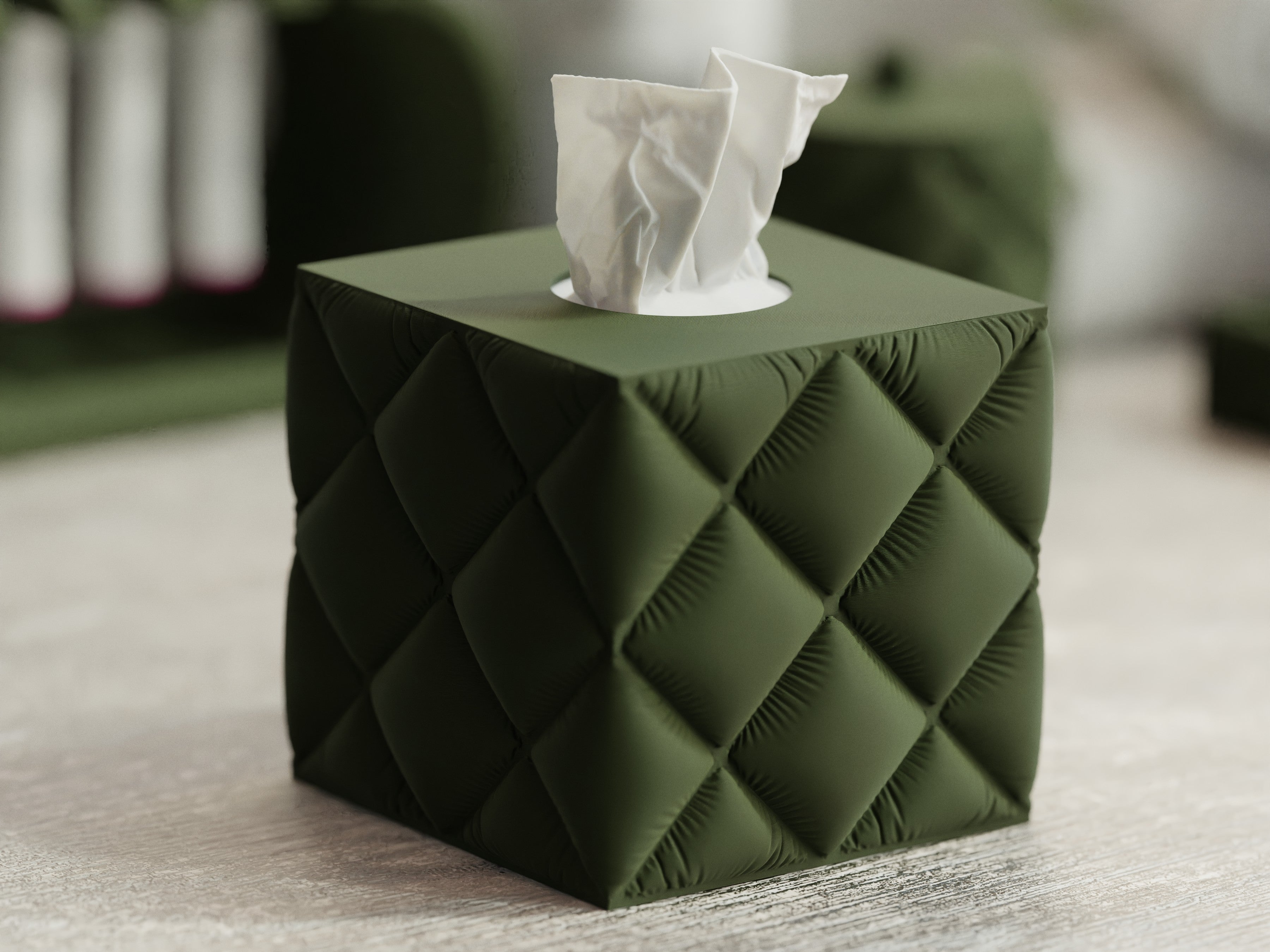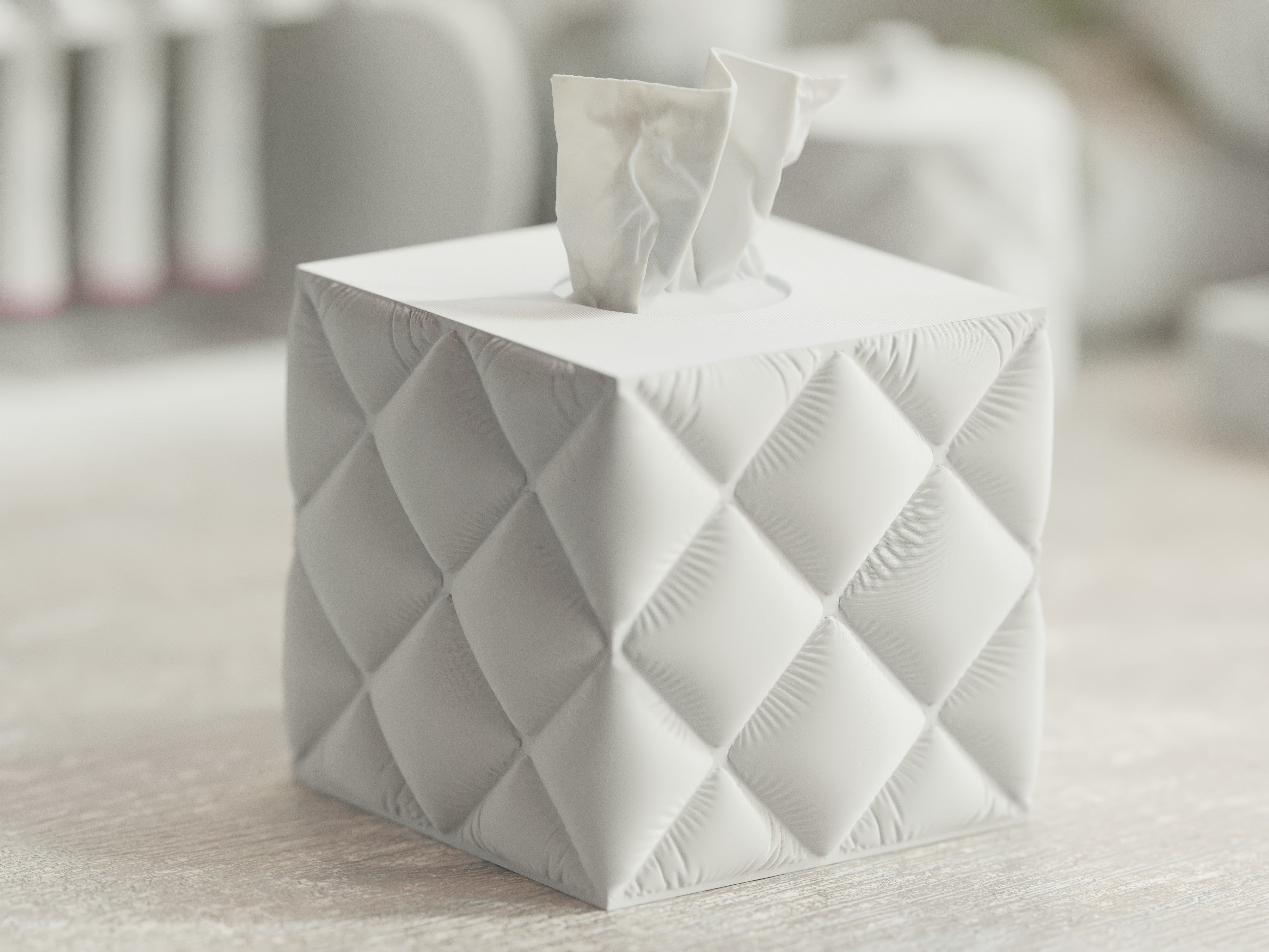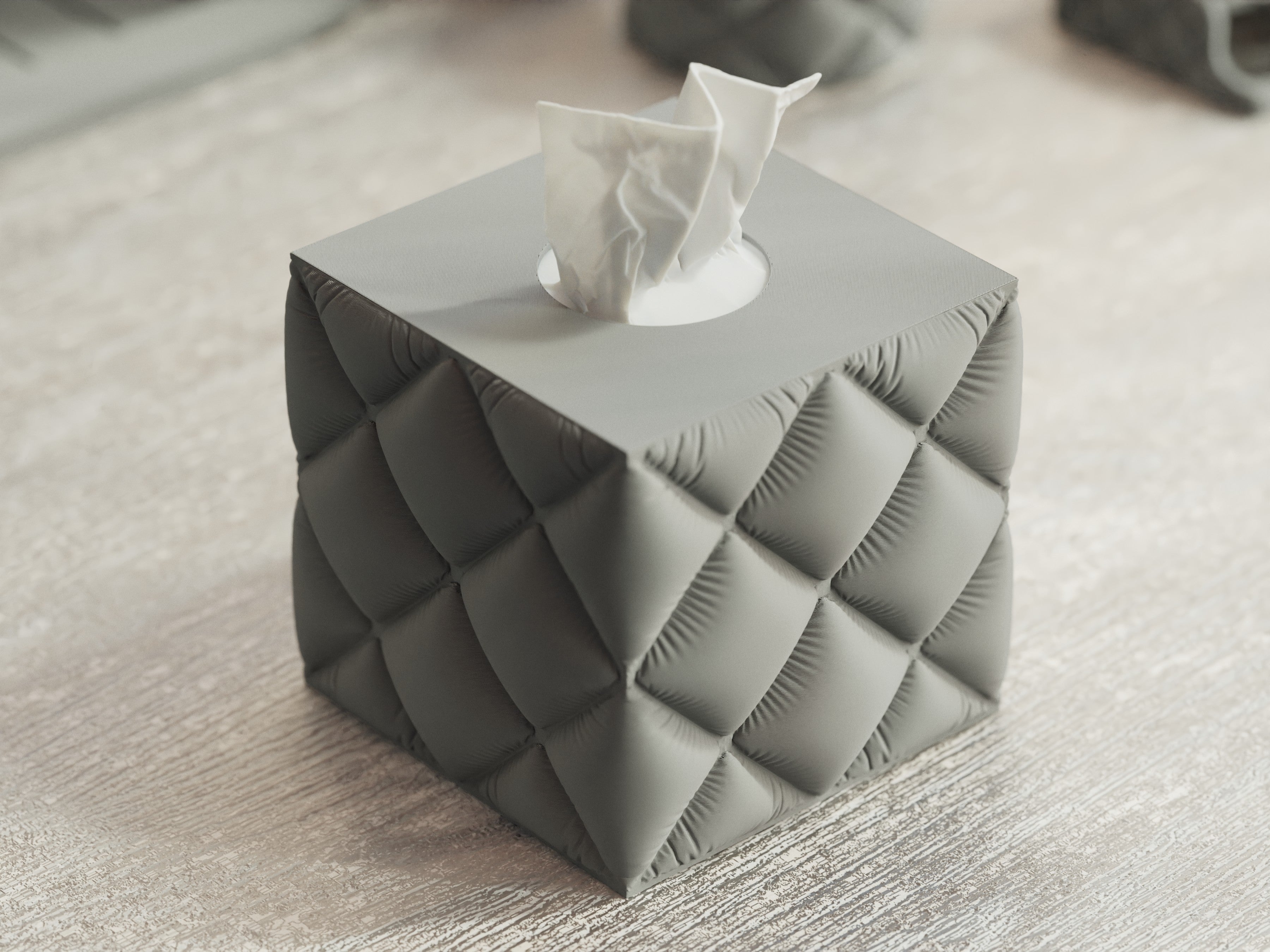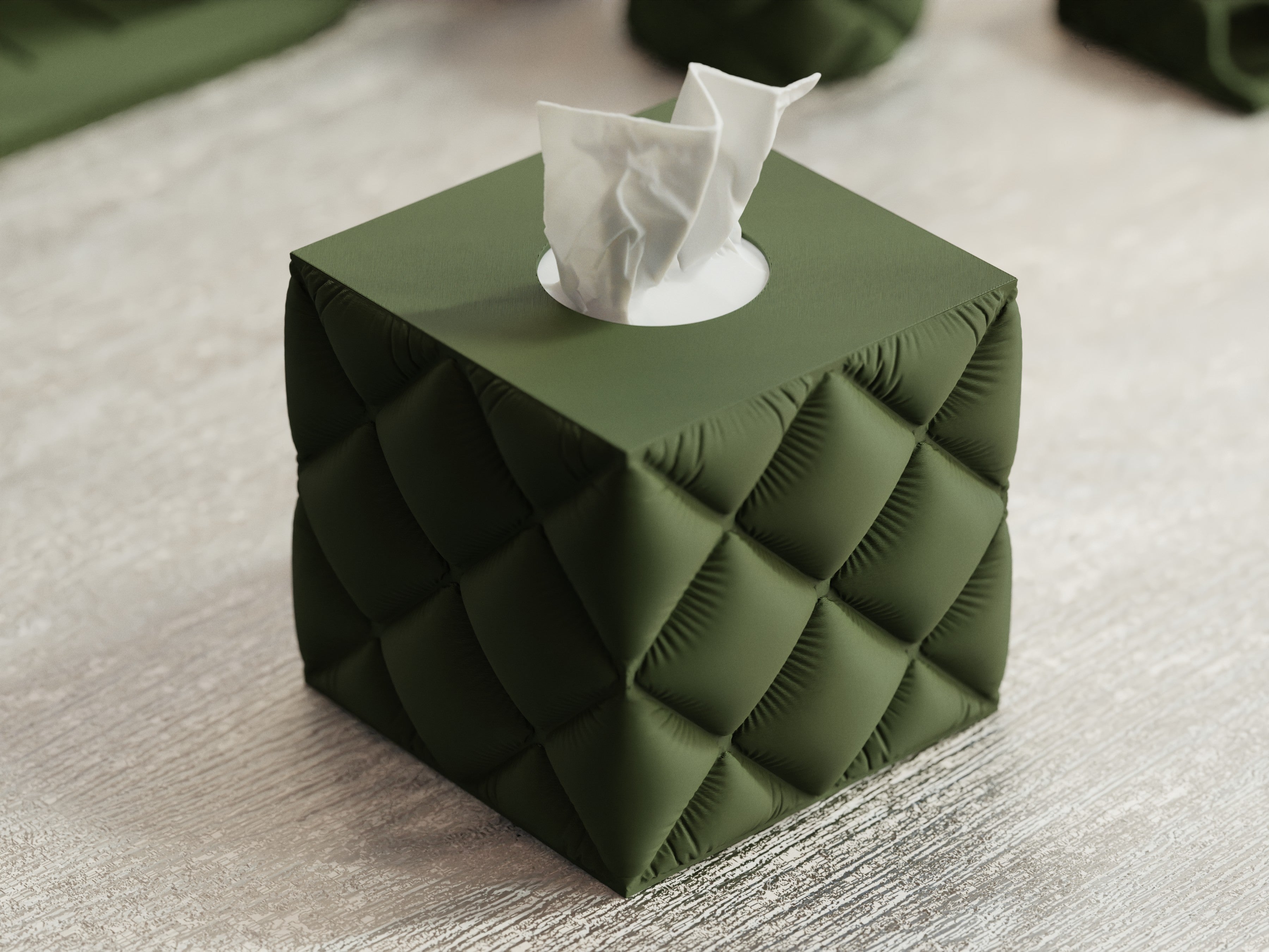 Quadratische Taschentuchbox in gepolsterter Rautenstruktur. Der soft wirkende Korpus trifft auf klare Kanten und einen flachen Deckel mit mittiger Auszugöffnung. Harmoniert mit Bad-Accessoires und Desk-Setup, wirkt ruhig und hochwertig.