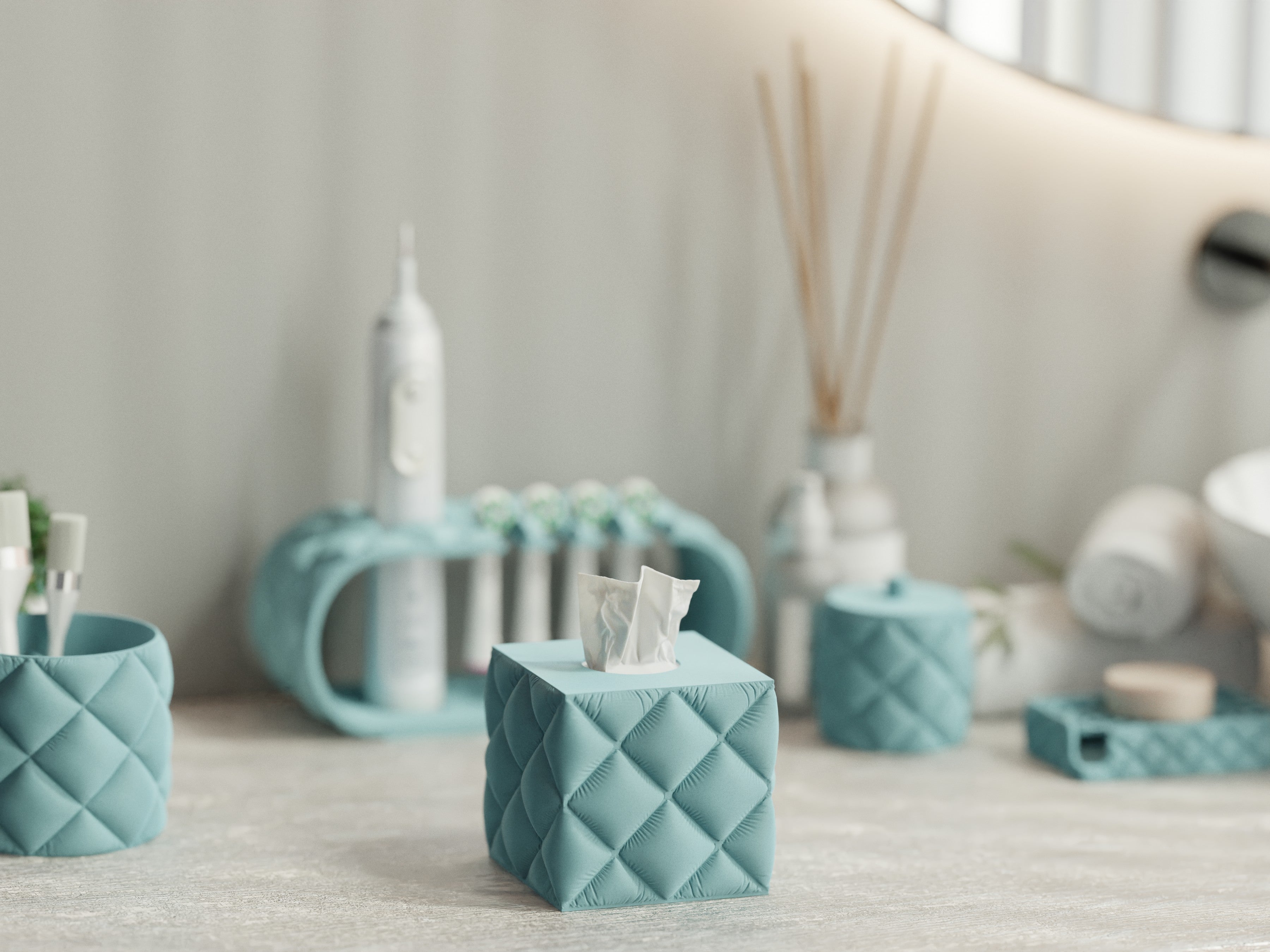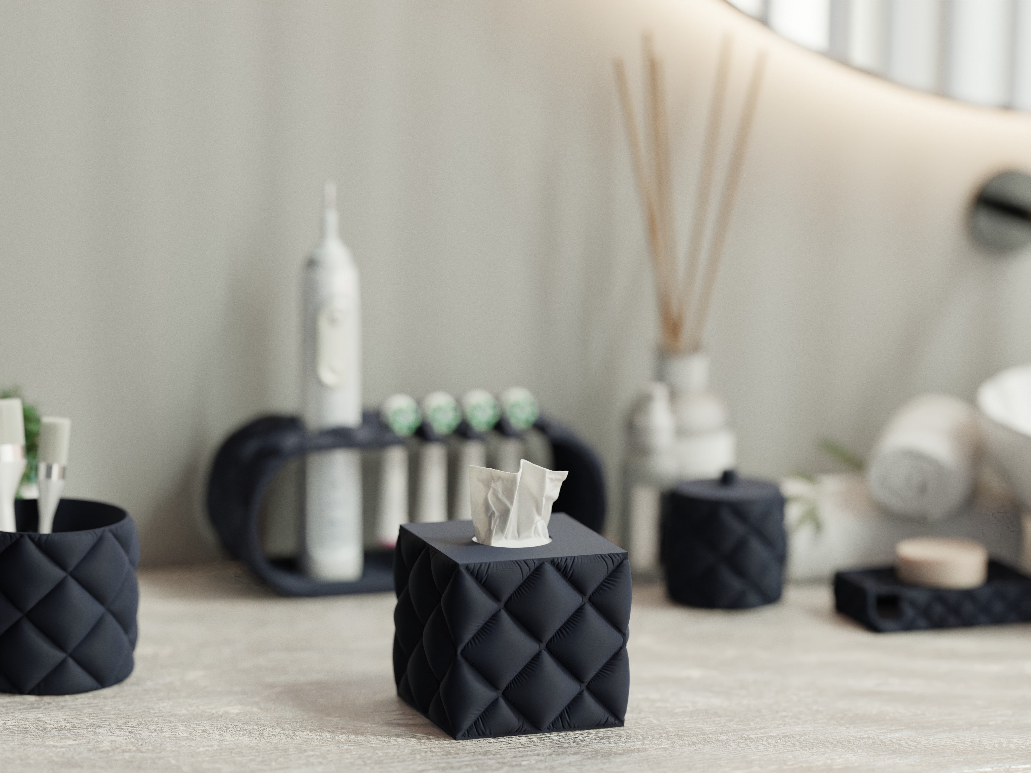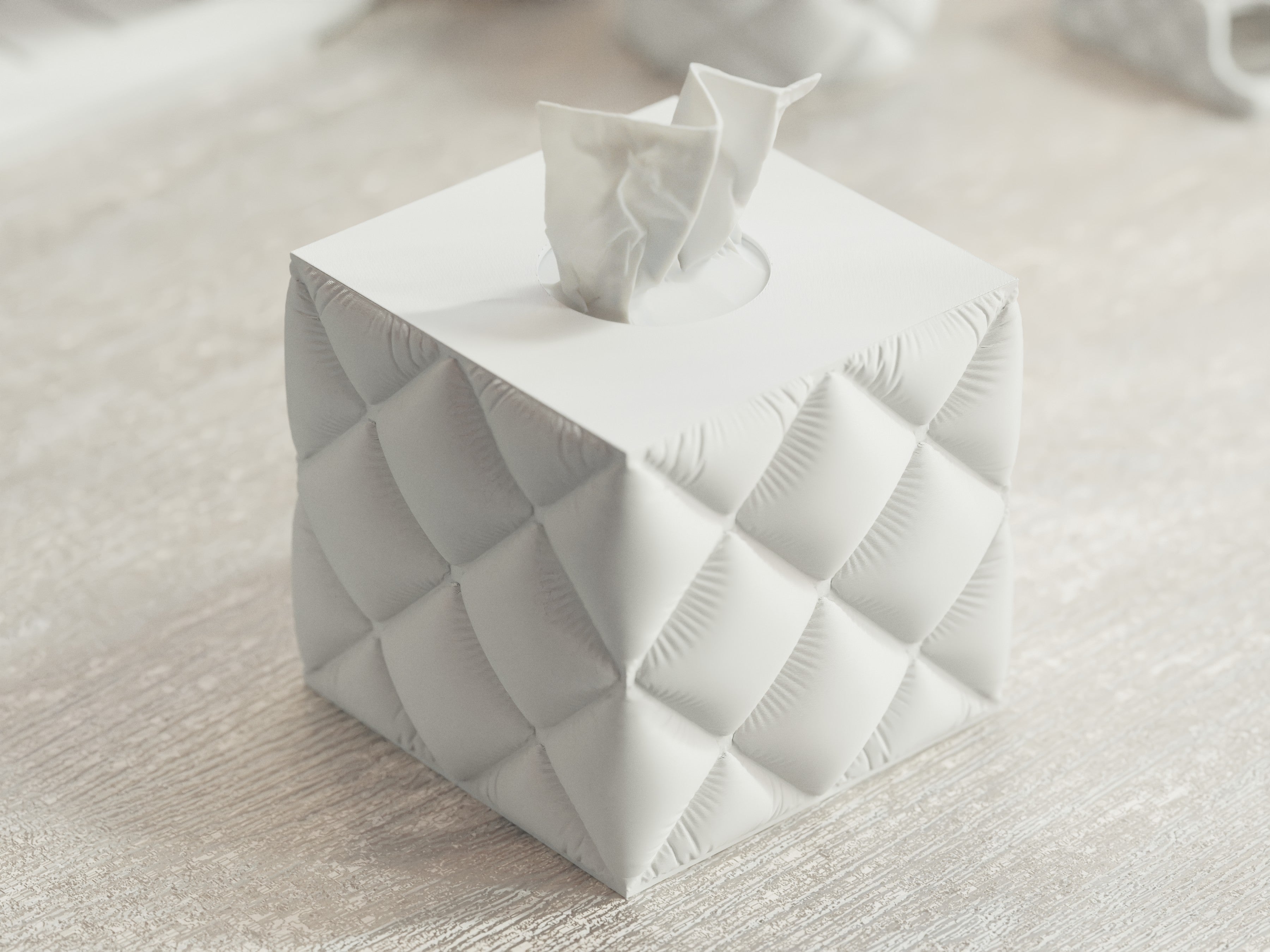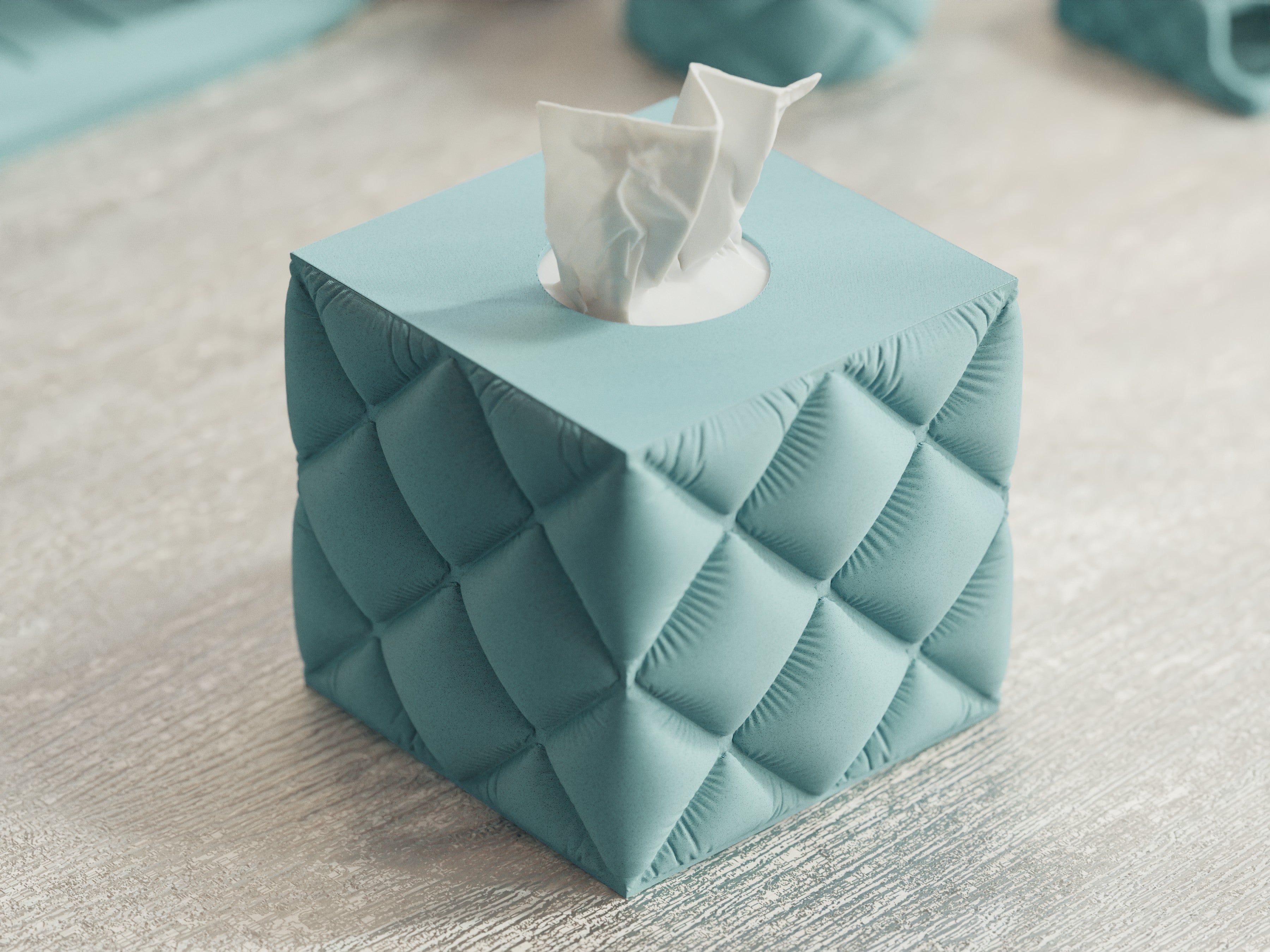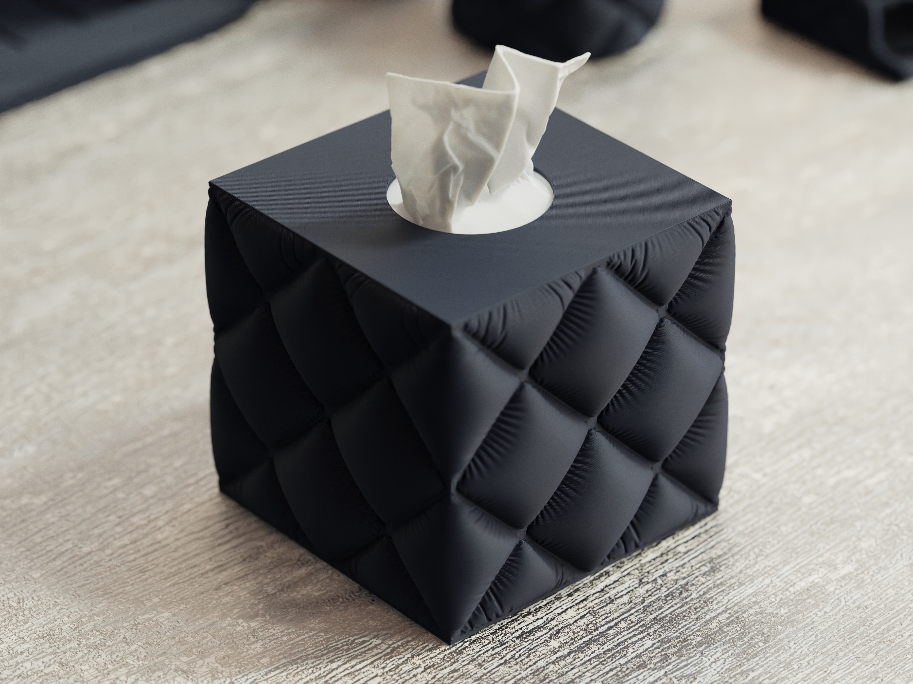 Quadratische Taschentuchbox in gepolsterter Rautenstruktur. Der soft wirkende Korpus trifft auf klare Kanten und einen flachen Deckel mit mittiger Auszugöffnung. Harmoniert mit Bad-Accessoires und Desk-Setup, wirkt ruhig und hochwertig.